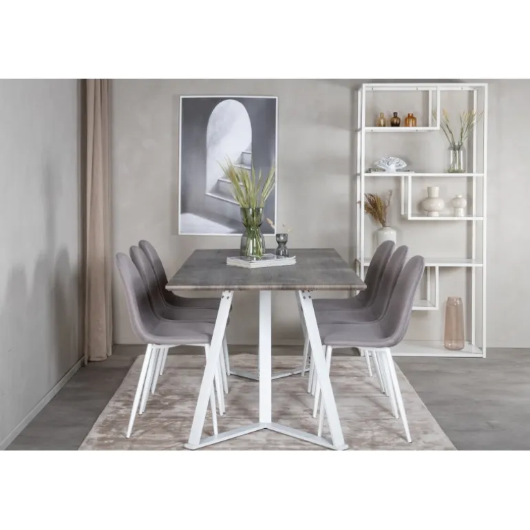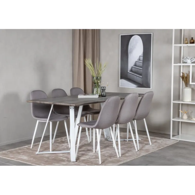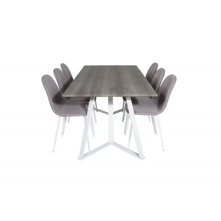 Klassisk Spisebordssæt, der passer ind i de fleste hjem! Spisebordet Marina sammen med stolene fra Polar-serien inviterer til mange vidunderlige sociale øjeblikke. Med et gråt MDF-bord og stole i grå og hvid polyesterlinned, er dette sæt både funktionelt og stilfuldt. Stålben sikrer robusthed og lang levetid. Ideelt til daglig brug og særlige lejligheder.