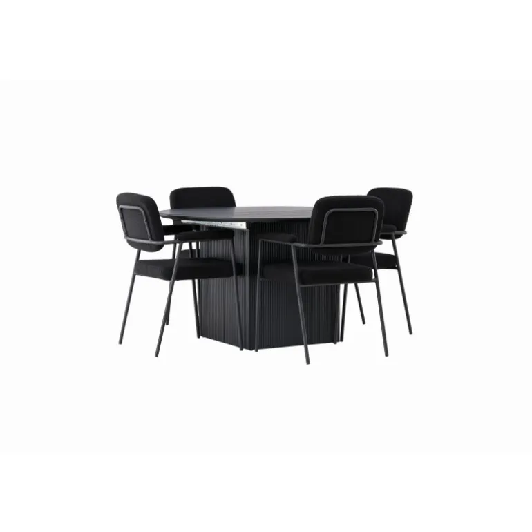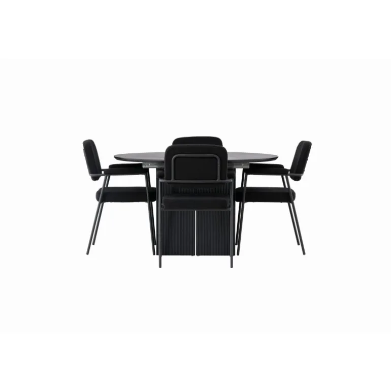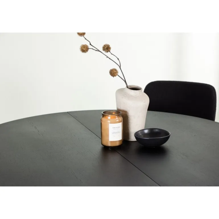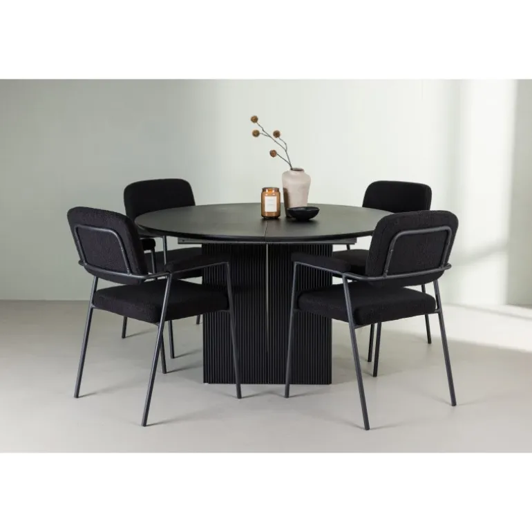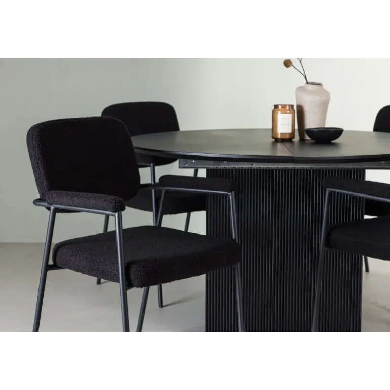 Et sort spisebordssæt i skandinavisk stil, der kombinerer tidløst design med smarte funktioner! Vores runde spisebord Matilda er skabt til at passe perfekt til dine behov. Med sin runde top i sort fineret MDF og det robuste stel med blokformede ben tilføjer Matilda et stilfuldt touch til dit hjem. Bordet er udtrækkeligt og kan hurtigt transformeres til et ovalt bord, når du har familie og gæster på besøg. Bordets diameter måler 130 cm. For at komplementere det smarte spisebord kombinerer vi det med sorte stole fra Yesterday-serien. Disse trendy og komfortable spisebordsstole står tidens prøve. Stolen har et fuldt polstret sæde i sort boucléstof, hvilket giver en elegant og luksuriøs følelse. De slanke sorte metalben giver ikke kun stabilitet, men de integrerede armlæn giver også ekstra komfort og støtte. Med Matilda spisebord og stole fra Yesterday-serien får du ikke kun et praktisk og funktionelt spisebordssæt, men også et stilfuldt og elegant indretningsdetalje, der vil gøre dig stolt af dit hjem!