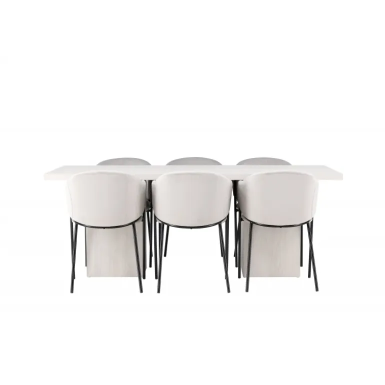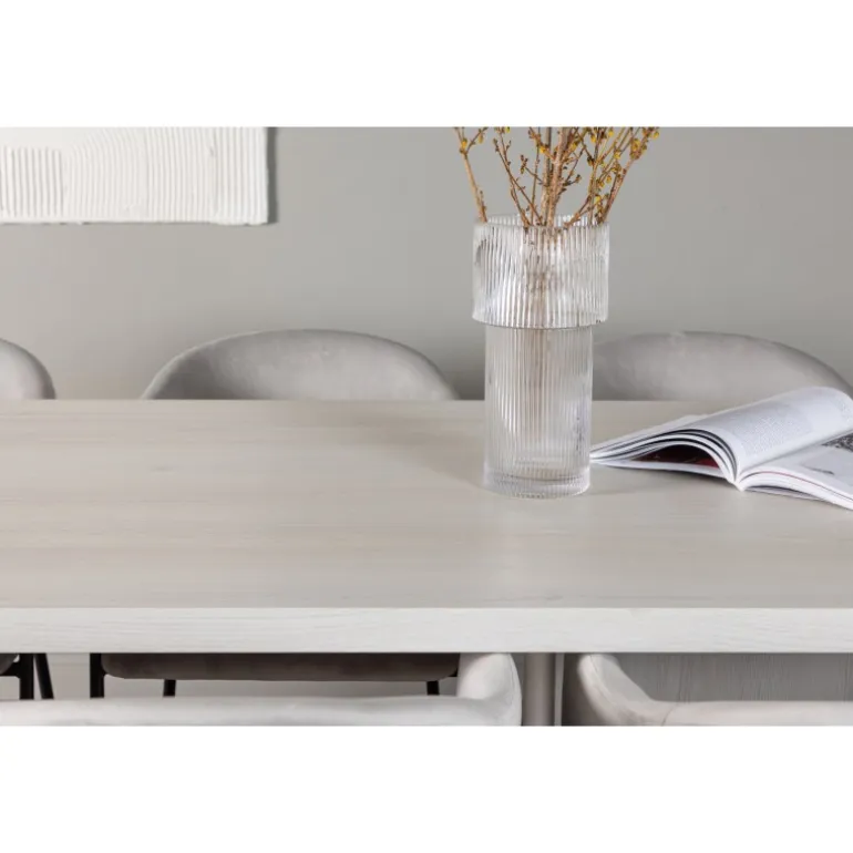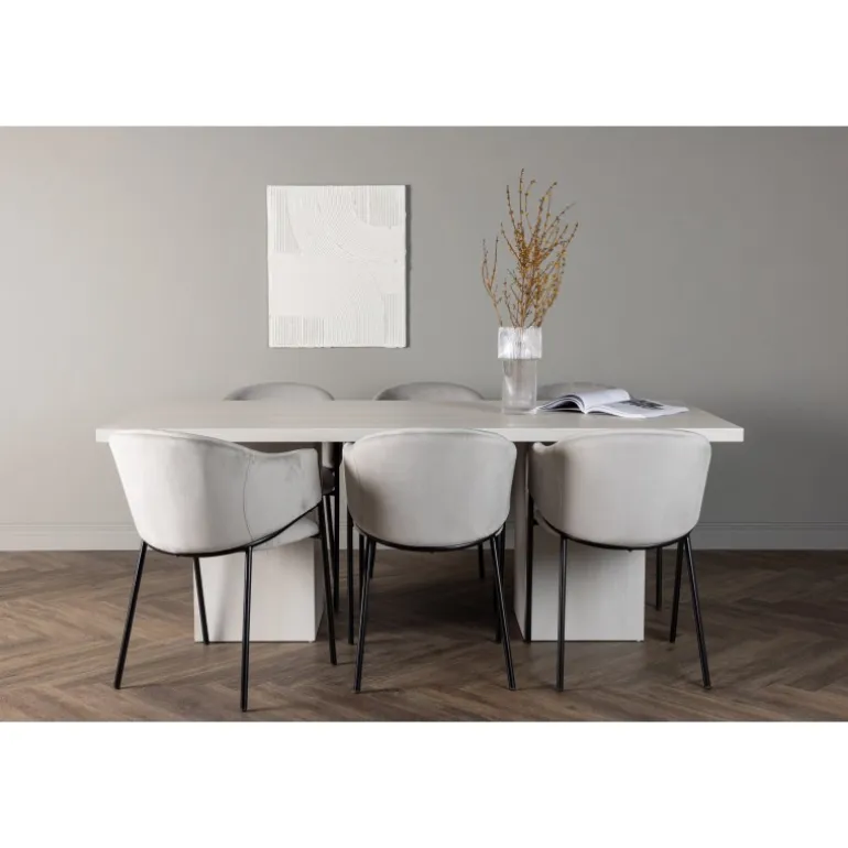 Indret dit hjem med behagelige farver, bløde materialer og rustikke former, og opnå en fuldendt kombination af det moderne og tidløse! Vores hvidvaskede spisebord Olga er en fryd for øjet med sit robuste design og skandinaviske stil. Den rektangulære bordplade i hvidvasket MDF giver en følelse af lys og rum i rummet. De solide, blokformede bordben matcher perfekt og skaber et solidt fundament for måltiderne. Bordets dimensioner: 200x75cm. Sammen med vores rektangulære spisebord tilbyder vi vores lysegrå Evelina spisebordsstole. Deres moderne udtryk og slanke design skaber en luksuriøs ramme omkring spisebordet. Sædet er fuldt polstret i et blødt lysegråt velourstof, og ryglænet er smukt buet for ekstra komfort. Den minimalistiske sorte stålramme giver stolen et strejf af elegance og stabilitet. Når du sætter dig ved dette Spisebordssæt, vil du straks føle en følelse af afslapning og eksklusivitet. Skab en charmerende atmosfære i dit hjem og få et sted, hvor både familie og venner kan samles og sidde komfortabelt!