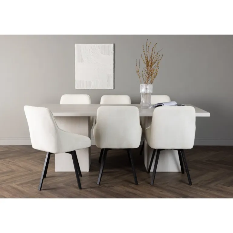 Oplev et lyst og friskt Spisebordssæt, der udstråler modebevidsthed og stabilitet med sit robuste design og slanke materialer! Vores rektangulære spisebord Olga, med sin hvide pudsede finish og stilfulde design, sætter tonen for mindeværdige middage. Bordpladen er lavet af hvidpudset MDF, hvilket giver en følelse af friskhed og lethed. Med to robuste, blokformede bordben i samme materiale skaber det en afbalanceret og stabil base, der understøtter dine mest fantastiske middage. Bordets dimensioner er 200×75 cm. For at matche det hvide pudsede spisebord tilbyder vi vores beige spisestole fra Rosie-serien. Disse stole tilbyder en harmonisk kombination af komfort og stil i ægte skandinavisk ånd. Nyd det komfortable fuldt polstrede sæde, omsluttet af blødt beige stof og integrerede armlæn, der tilføjer et ekstra strejf af luksus. De let svungne stoleben i sort metal bidrager til både et moderne og elegant præg i din stue. Med Olga spisebordet og Rosie stolene får du ikke kun en fantastisk kombination af funktion og design, men også et generøst midtpunkt i dit hjem, der giver plads til både kære og nære. Skab mindeværdige øjeblikke med familie og venner i en hyggelig atmosfære, som du kan personliggøre selv!