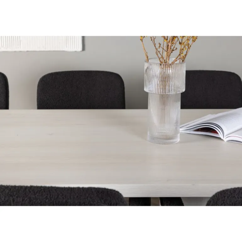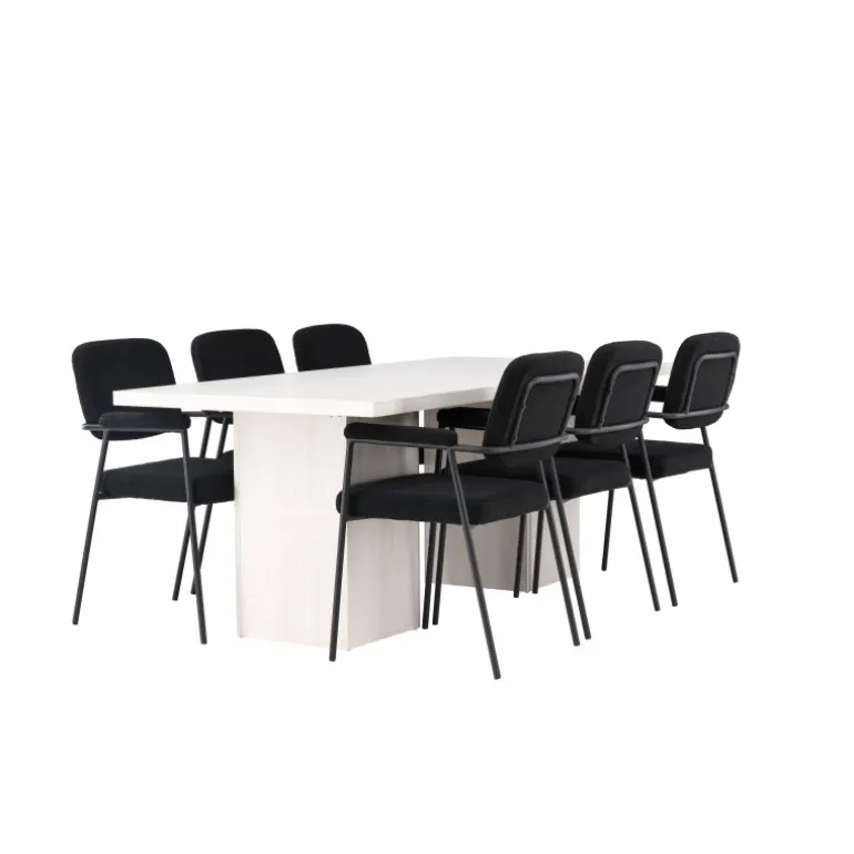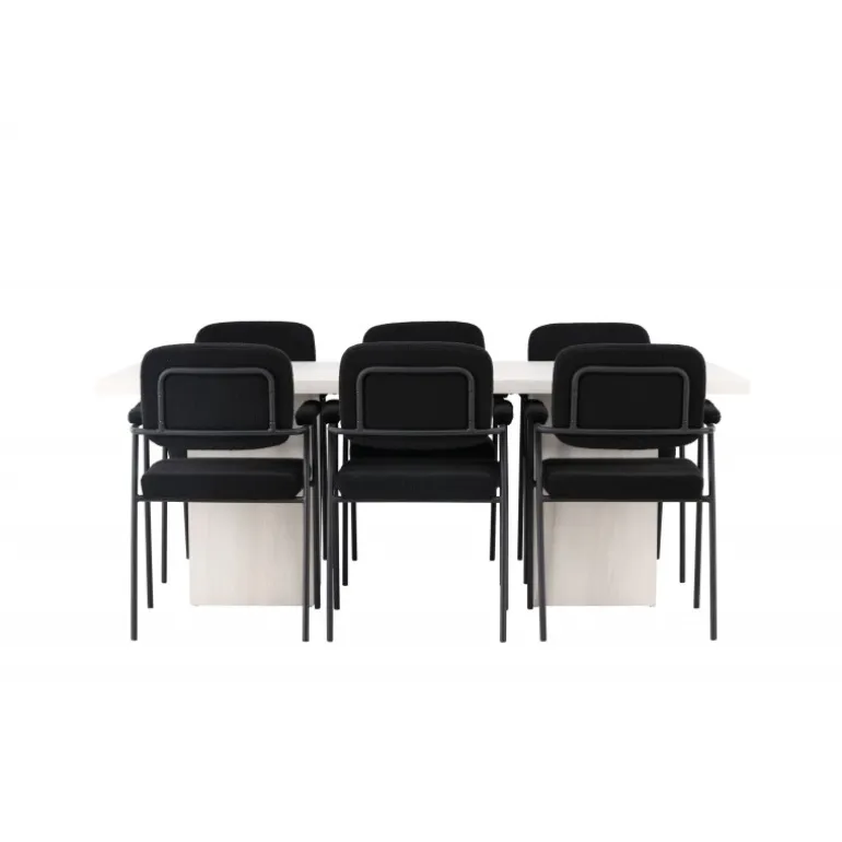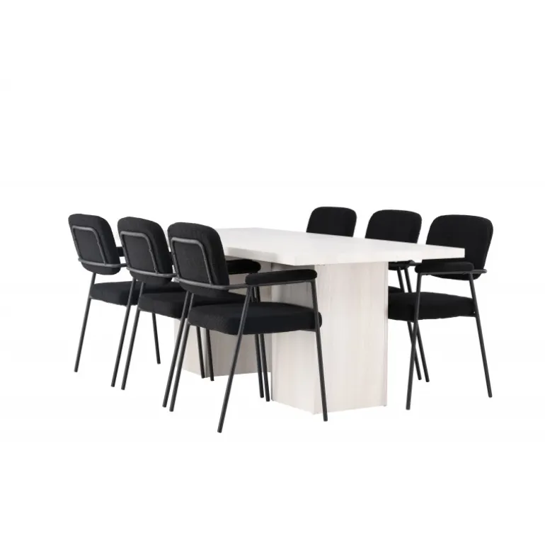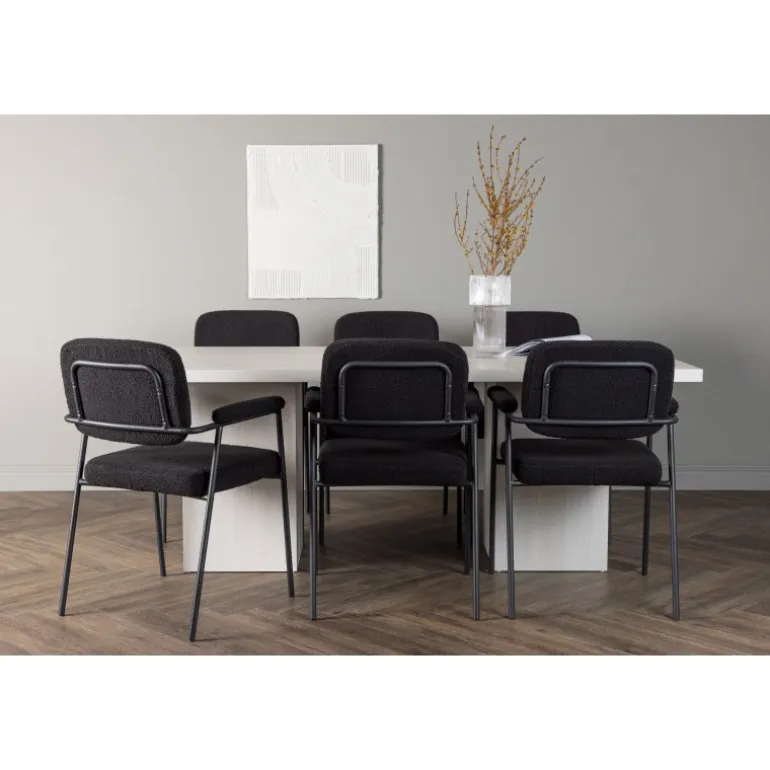 Skab et imponerende midtpunkt i hjertet af dit hjem, der sætter tonen i stuen med sit robuste design og dejlige materialer, der inviterer til lange middage! Olga er vores rektangulære spisebord med en hvidvasket MDF-bordplade og to solide, blokformede bordben lavet af samme materiale, hvilket gør det til en fantastisk smuk interiørdetalje. Med sit slanke og robuste design fanger det øjet og imponerer gæsterne. Bordet måler 200×75 cm. Kompletter dette fantastiske spisebord med vores sorte spisebordsstole fra Yesterday-serien. Stolens sorte bouclé-stof tilføjer et sofistikeret touch og føles vidunderligt blødt mod huden. Med sine slanke stoleben og integrerede sorte metal-armlæn får du ikke kun en stilfuld og moderne stol, men også ekstra komfort. Sammen skaber Olga spisebord og Yesterday stole en harmonisk og indbydende atmosfære, hvor du og dine gæster kan samles til mindeværdige måltider. Giv din spisestue et ekstra løft med dette enestående Spisebordssæt – en kombination af stil, komfort og funktionalitet!
