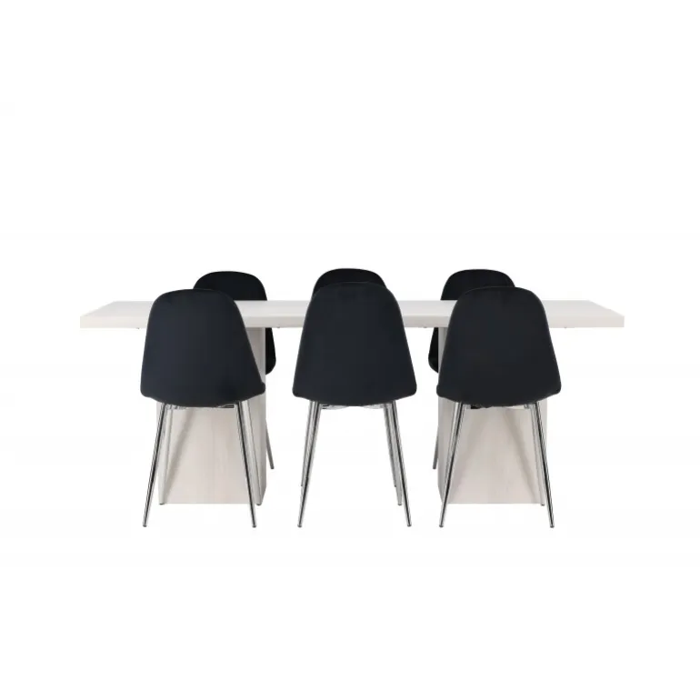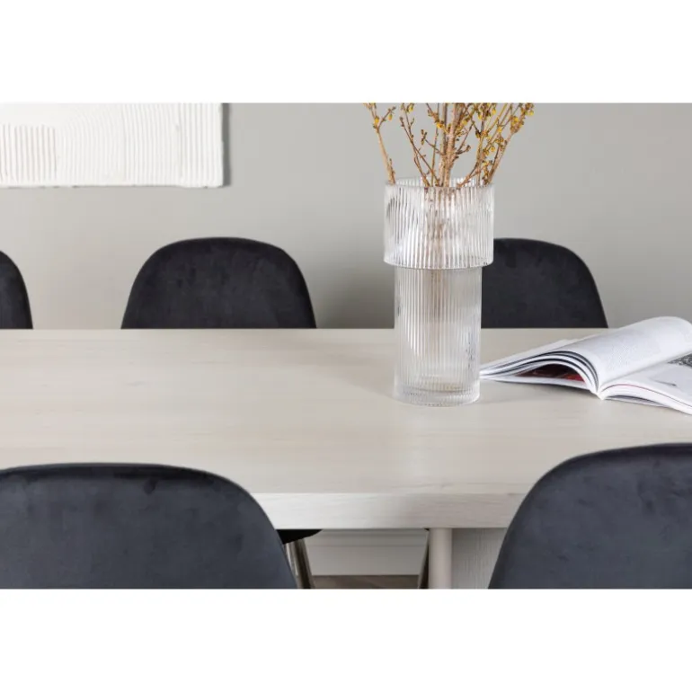 Sig farvel til kompromiser mellem stil og komfort – her får du et Spisebordssæt, der ubesværet passer ind i moderne interiørstile! Vores hvidvaskede spisebord Olga er en fryd for øjet med sit robuste design og skandinaviske flair. Den rektangulære bordplade i hvidvasket MDF skaber en følelse af lys og rummelighed i rummet. De faste, blokformede bordben matcher perfekt og giver et solidt fundament for dine måltider. Bordets dimensioner: 200×75 cm. Når du kombinerer det robuste Olga spisebord med vores eksklusive stole fra Polar-serien, løfter du din spiseoplevelse til et helt nyt niveau af luksus. Denne stol har et elegant design med fuldt polstret finish og krommetalfødder. Den let rundede ryglæn og den slanke sorte veloursæde med blød polstring tilbyder den perfekte balance mellem stil og komfort. Dette vidunderlige Spisebordssæt i moderne design kombinerer stil, funktionalitet og fremragende kvalitet for at skabe en uimodståelig indretningsdetalje i dit hjem, der vil løfte din boligindretning til nye højder!