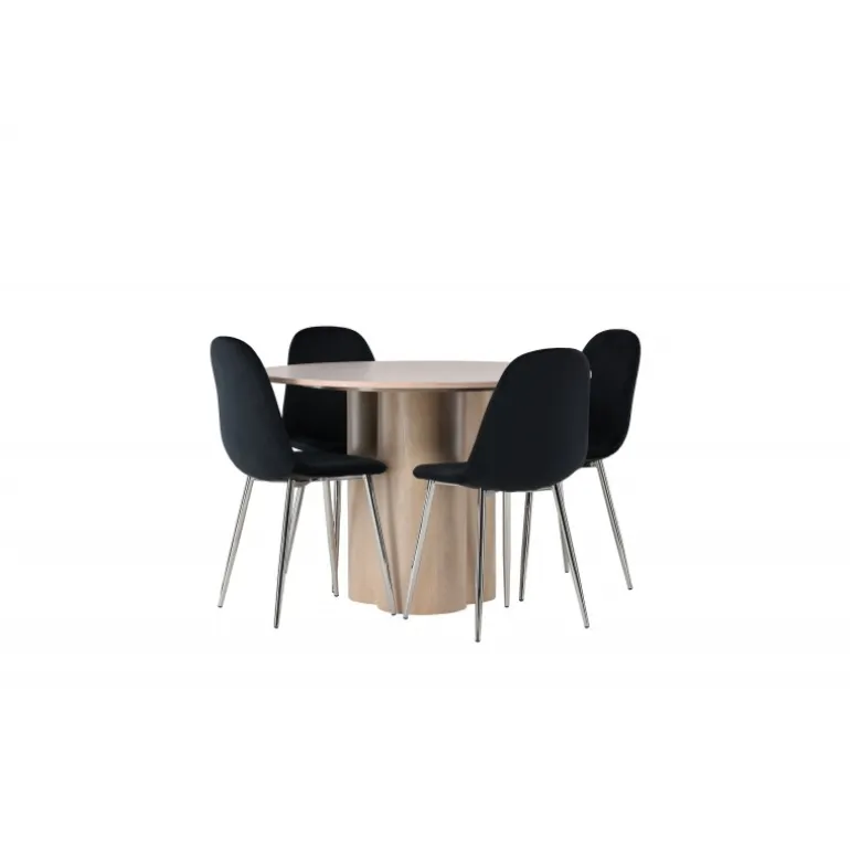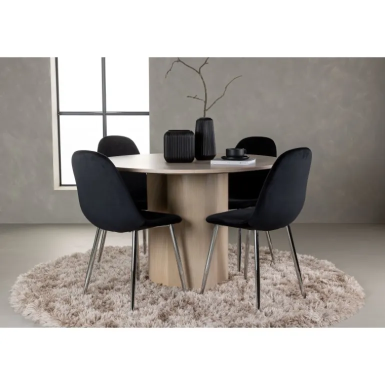 Indret dit hjem med stilfulde kontraster, fløjlsagtige materialer og moderne former – dette spisebordssæt har alt, hvad du behøver for et elegant interiør! Vores runde spisebord Olivia imponerer med sin skandinaviske design og smagfulde layout. Med en konsistent overordnet design i hvidvasket MDF får du en perfekt kombination af stil og funktionalitet. De tre cylinderformede ben, samlet under midten af bordet, tilføjer et moderne touch og skaber en stabil og robust base for bordet. Dimensioner: 110 cm. Sammen med vores hvidvaskede bord Olivia får du sorte spisebordsstole fra Polar-serien, der tager din komfort til nye højder. Polar byder på et fuldt polstret design med krommetalben, hvilket bliver en stilfuld detalje for det samlede udseende. Den let rundede ryg og den slanke siddeflade i sort fløjlstof, let polstret for ekstra komfort, inviterer til lange og afslappede måltider. Med Olivia og Polar spisebordssæt får du ikke kun en praktisk løsning til din spisestue, men også en atmosfære, der får dig til at føle dig velkommen og afslappet. Hvert enkelt detalje er nøje udvalgt for at skabe en følelse af stil og eksklusivitet. Hvad mere kan du ønske dig?