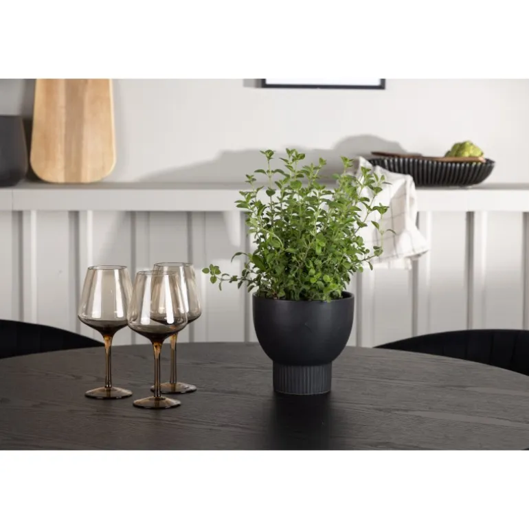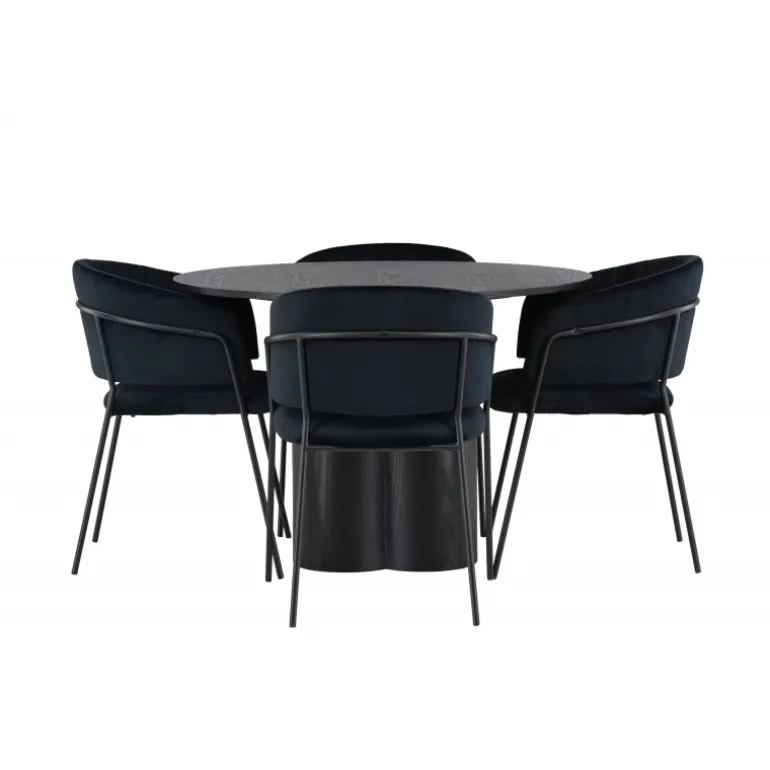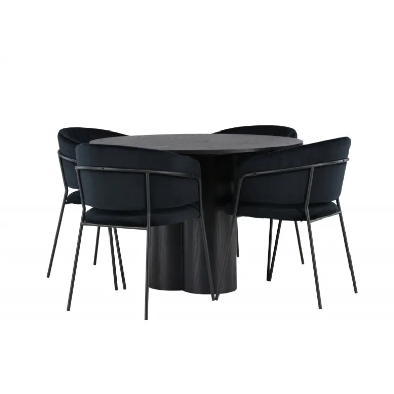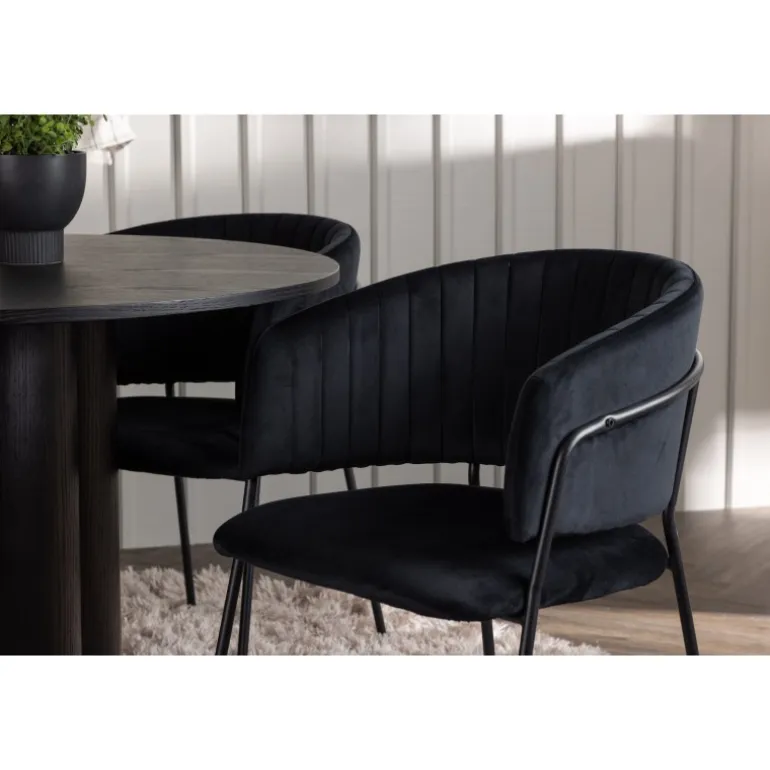 Kombiner skandinavisk elegance og moderne trends. Du behøver ikke gå på kompromis med stil og komfort! Vores sorte spisebord Olivia er virkelig et syn for øjet. Den tynde og runde bordplade lavet af holdbart MDF giver en stilfuld kontrast til bordets robuste ramme, som består af tre cylindriske ben samlet i midten. Bordets dimensioner er 110 cm. Sammen med vores runde spisebord Olivia følger de sorte spisebordsstole Selma. Med deres fuldt polstrede design og let buede rygge vil du føle dig inviteret til at slappe af og nyde hvert øjeblik omkring spisebordet. Den fløjlsagtige polstring og stilfulde dekorative sømme giver stolene en luksuriøs følelse. Endelig bliver de slanke sorte stålben en stilfuld kontrast til det bløde stof, der på en subtil måde komplementerer det overordnede design. Med spisebordssættet Olivia og Selma får du ikke kun et funktionelt og smukt møbelsæt, men også en oplevelse, der vil få dig til at føle dig hjemme. Indret din stue eller køkken med stil, og lad disse møbler blive et samlingspunkt!