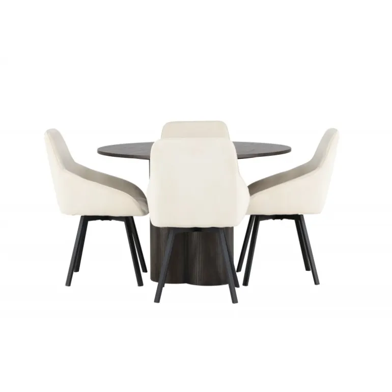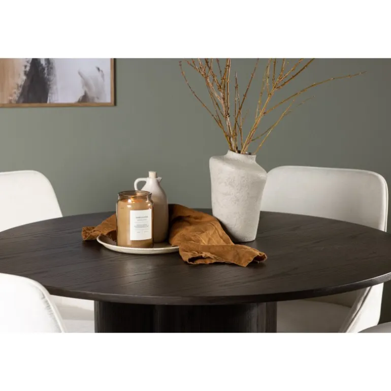 Skab et midtpunkt i stuen, der imponerer familie og venner. Her får du et spisebordssæt, der kombinerer skandinavisk design med smagfuld elegance! Dette runde vintagebord med moderne design hører til Olivia-serien. Bordet har et gennemtænkt design med en tynd, rund bordplade og tre cylinderformede ben, der konvergerer i midten af bordet. Den stilfulde mocca farve er også helt i tråd med de aktuelle trends. Bordets dimensioner: 110 cm. For at skabe det ultimative spisebordssæt har vi kombineret Olivia-spisebordet med stole fra vores populære Rosie-serie. Stolene har fuldt polstrede sæder og integrerede armlæn, der tilbyder både stil og komfort. Det beige stof giver en varm og indbydende følelse, mens de let udadvendte sorte metalbens tilføjer et moderne touch. Når du sidder i disse stole, vil du straks føle den luksuriøse komfort. Det blødt polstrede sæde former sig perfekt efter din krop, hvilket giver dig et behageligt sted at nyde lange middage og dejlige samtaler med familie og venner. Det skal føles godt at komme hjem!