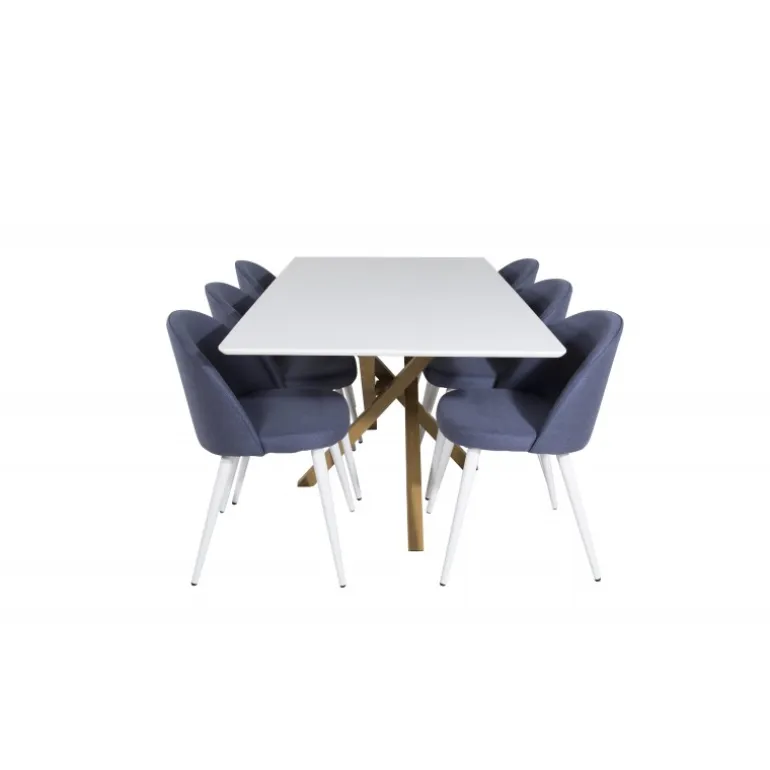 Piazza, vores stilfulde spisebord med dekorativt understel, kommer med enkle stole fra Polar-serien. Skab et socialt miljø med plads til samvær! Bordpladen i hvid MDF er både elegant og funktionel, mens de blå stole i polyester tilføjer en farverig kontrast. Dette sæt er perfekt til dem, der ønsker at kombinere moderne design med komfort.