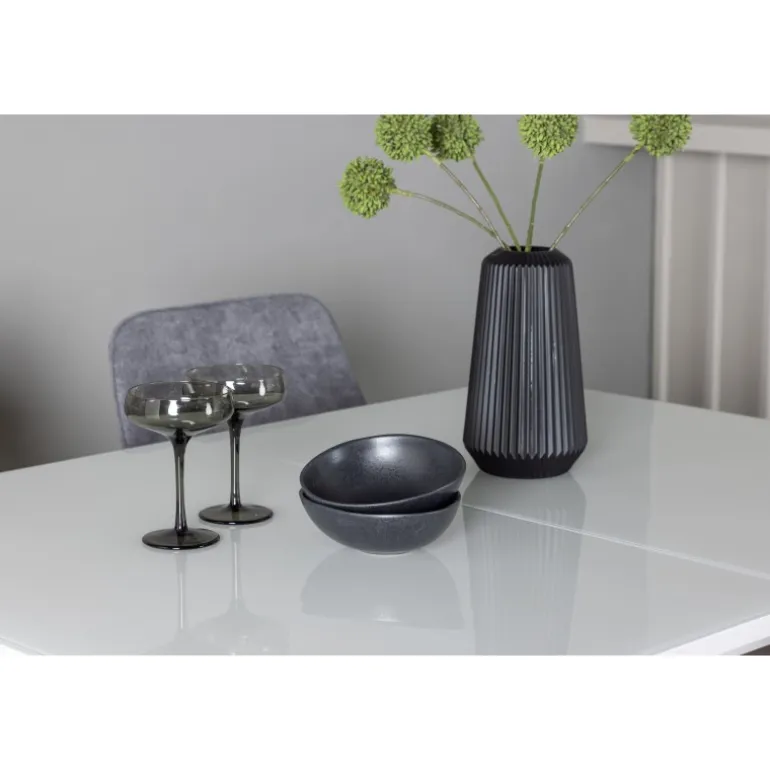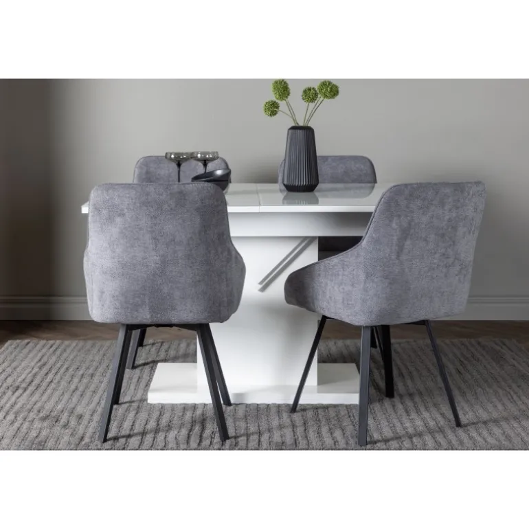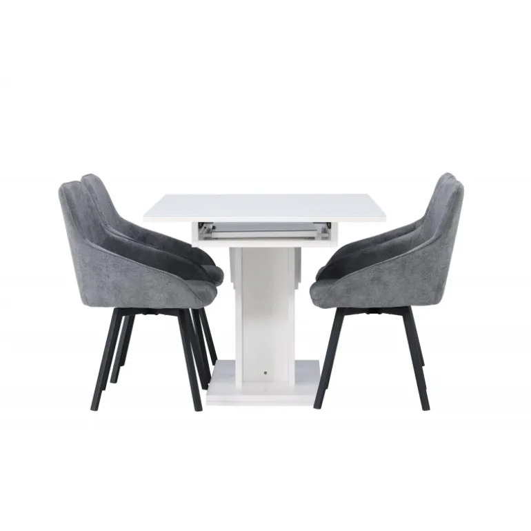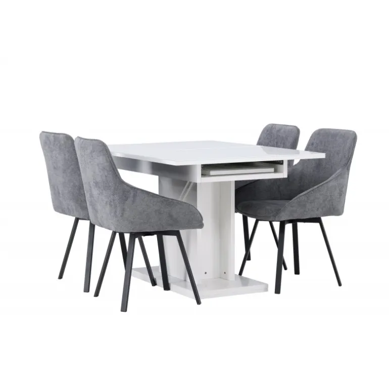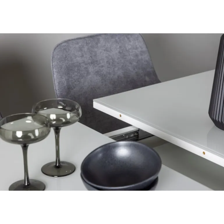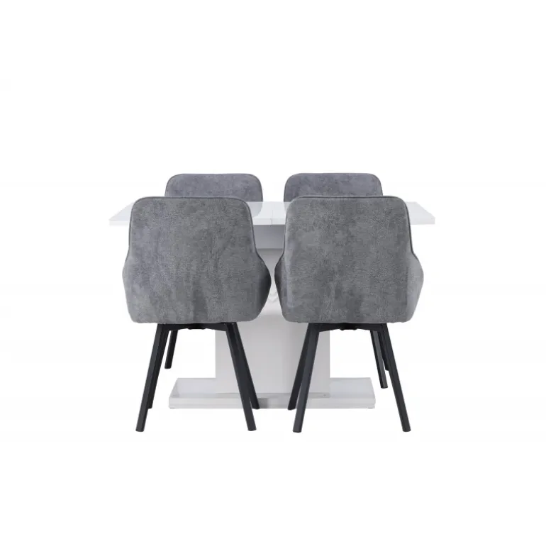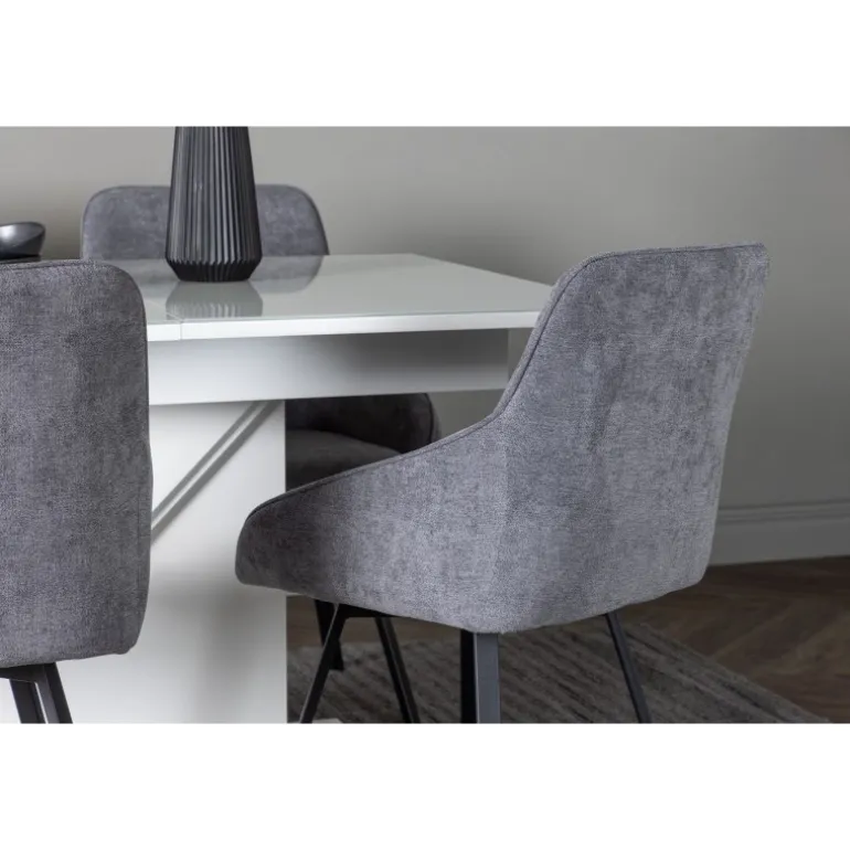 Lad din stue sætte tonen for din indretningsstil og møblér den med dette smarte Spisebordssæt, der kan forlænges efter behov! Dette imponerende spisebord, Pluto, er den perfekte tilføjelse til dit hjem. Med en MDF-bordplade og en glasoverflade har det et sofistikeret og moderne look, der vil imponere dine gæster. Bordet har en solid, centralt placeret base, der giver fremragende stabilitet, og dets udvidelsesfunktion gør det perfekt til både små og store sammenkomster. Bordets dimensioner: 120/160×90 cm. Sammen med de grå stole fra Rosie-serien er Spisebordssættet komplet. Disse dejlige stole i skandinavisk design vil tilføre et moderne touch til dit spisebord. Det fuldt polstrede sæde i gråt stof og de let udadgående sorte metalben skaber en perfekt balance mellem komfort og stil. Den bløde polstring i sædet inviterer dig og dine gæster til at slappe af og nyde lange og behagelige middage. Skab en atmosfære af hyggelig komfort i din stue. Her vil du opleve luksus af høj kvalitet design og funktionelle detaljer, der vil gøre hvert måltid til en dejlig del af dagen!