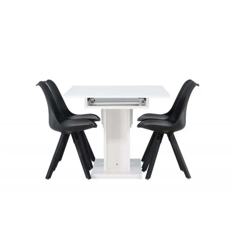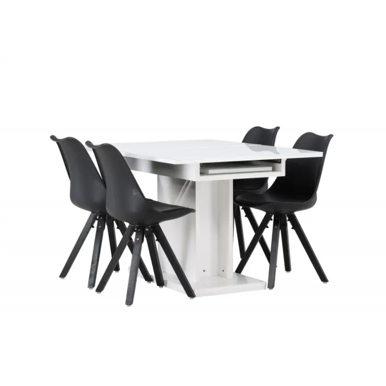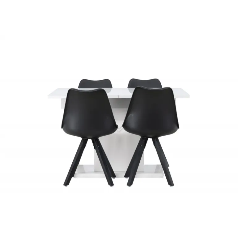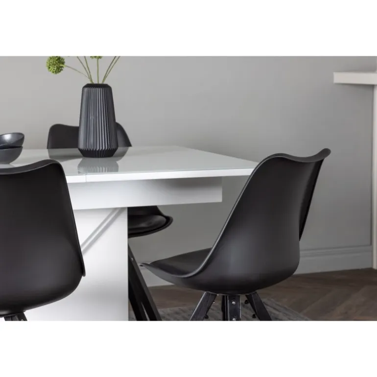 Indret din stue smart og stilrent med et trendsikkert Spisebordssæt, der passer perfekt både til hverdag og fest! Vores hvide, rektangulære spisebord Pluto er skabt for at imponere. Den storslåede design og bordpladens glastop giver en følelse af luksus og sofistikering. Med robuste materialer og en center-placeret ramme i hvid MDF får du et stabilt og pålideligt bord til alle lejligheder. Og det bedste af alt er, at det er forlængelsesbart! Uanset om du har en hyggelig middag for to eller en festlig sammenkomst med venner og familie, tilpasser Pluto sig dine behov. Bordets mål: 120/160×90 cm. Sammen med det forlængelsesbare spisebord følger stole fra Zeno-serien, som forstærker komforten. Med deres klassiske design og helpolstrede sæde får du både bekvemmelighed og stil. De kromede metalben giver et moderne touch, mens det sorte fløjl giver et tidløst og sofistikeret look. I dette Spisebordssæt er hver detalje nøje udvalgt for at give dig den perfekte kombination af funktionalitet og design. Møbler smart, flot og stilrent!