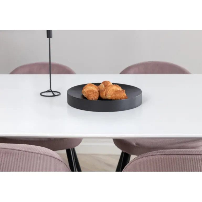 Spisebordssæt Polar med hvid bordplade og sorte ben sammen med de pompøse lyserøde fløjlstole forbedrer indtrykket i enhver spisestue. Dette elegante og hyggelige Spisebordssæt er den perfekte tilføjelse til dit hjem. MDF-bordpladen er både stilfuld og funktionel, men kræver forsigtig pleje for at undgå ridser og skader. De lyserøde fløjlstole giver en luksuriøs følelse og komfort, hvilket gør hvert måltid til en fest.