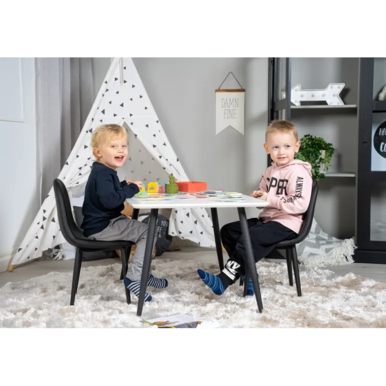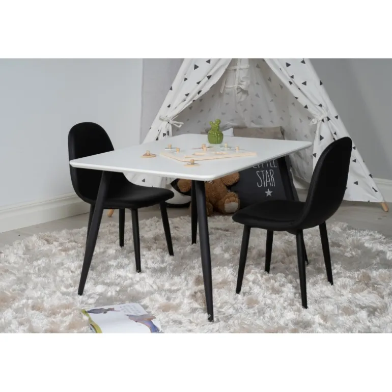 Skab børnenes egen lille spiseplads med Spisebordssæt Polar med stole Polar! Dette moderne Spisebordssæt inkluderer et spisebord og stole fra Polar-serien. Bordpladen i hvid MDF og stolene i sort PU-materiale giver et stilfuldt og funktionelt touch til ethvert rum. Husk at følge vores plejeanvisninger for at holde sættet i perfekt stand. Samling kræves.