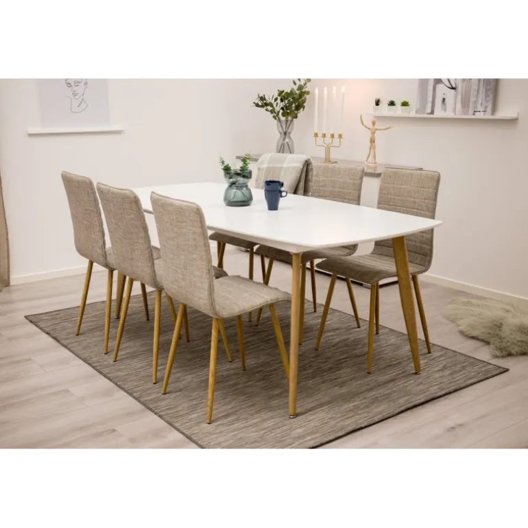 - Moderne design: Kombination af hvid MDF-bordplade og lysegrå stole.
