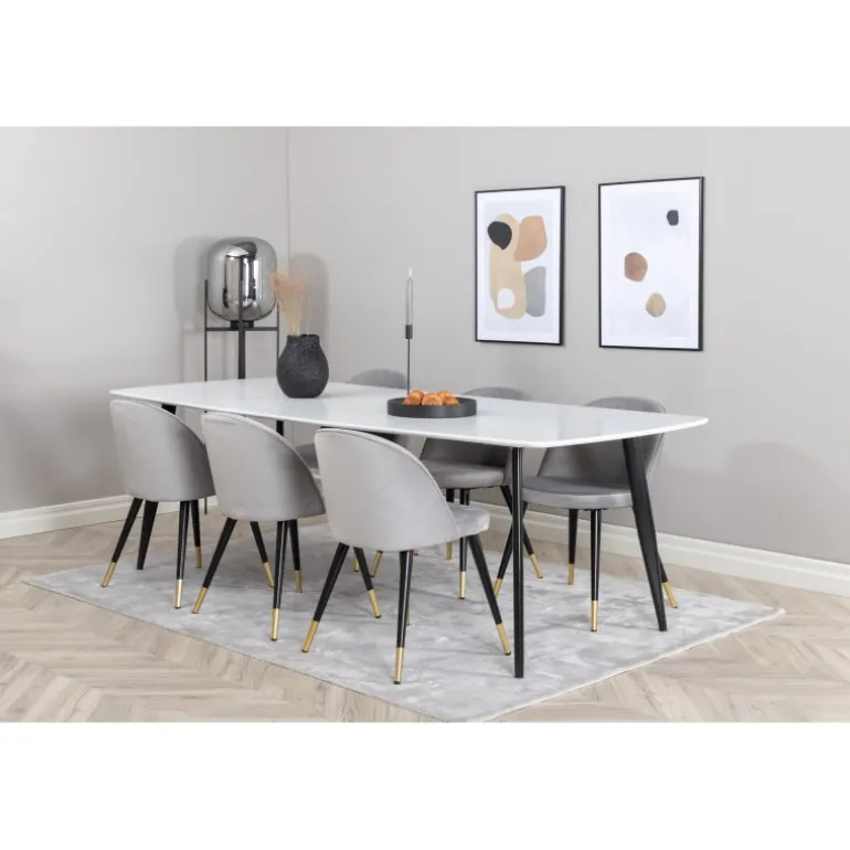 Oplev en vidunderlig og indbydende kombination af både farve og materiale med Spisebordssæt Polar. Dette stilfulde og moderne Spisebordssæt består af et Polar Ellipse spisbord og grå velour spisestole, der skaber en elegant atmosfære til mange hyggelige middage i godt selskab. Bordpladen i hvid MDF er både robust og stilren, men kræver forsigtig vedligeholdelse for at undgå ridser og skader. Det er vigtigt at bruge en blød klud til daglig rengøring og straks tørre eventuelle spildte væsker op.