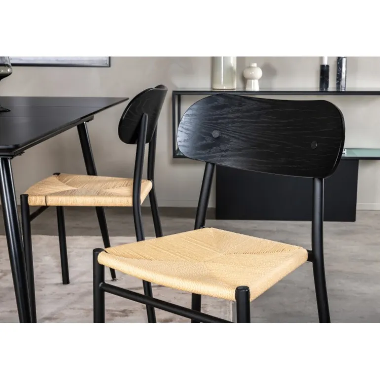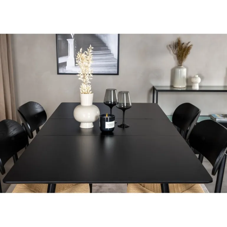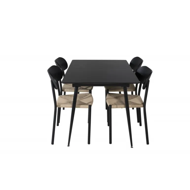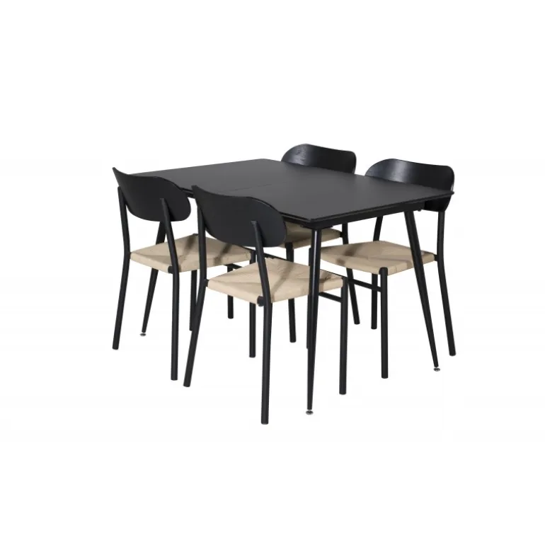 Oplev et moderne og stilfuldt Spisebordssæt til dit hjem med Spisebordssæt Silar med stole Polly. Dette sæt består af et elegant sort bord og matchende stole, som er den perfekte kombination til hjemmets hjerte. Spisebordet er lavet af MDF og stål, mens stolene er fremstillet af metal, krydsfiner og rattan, hvilket sikrer en holdbar og æstetisk tiltalende løsning. Sættet passer perfekt til dine behov og vil nemt kunne integreres med din øvrige indretning.
