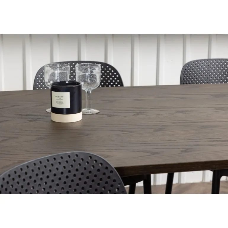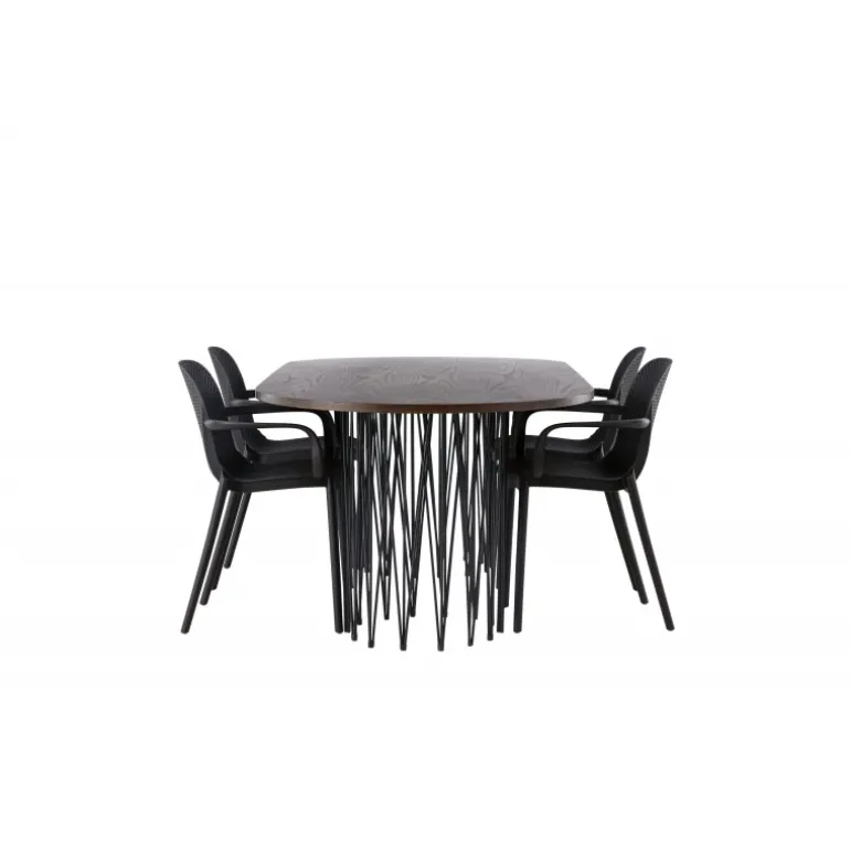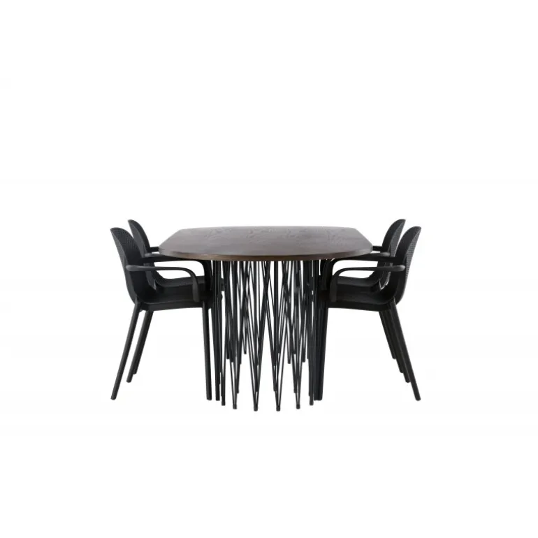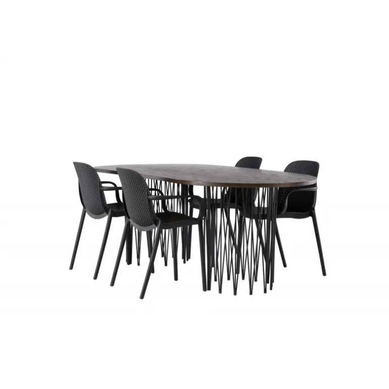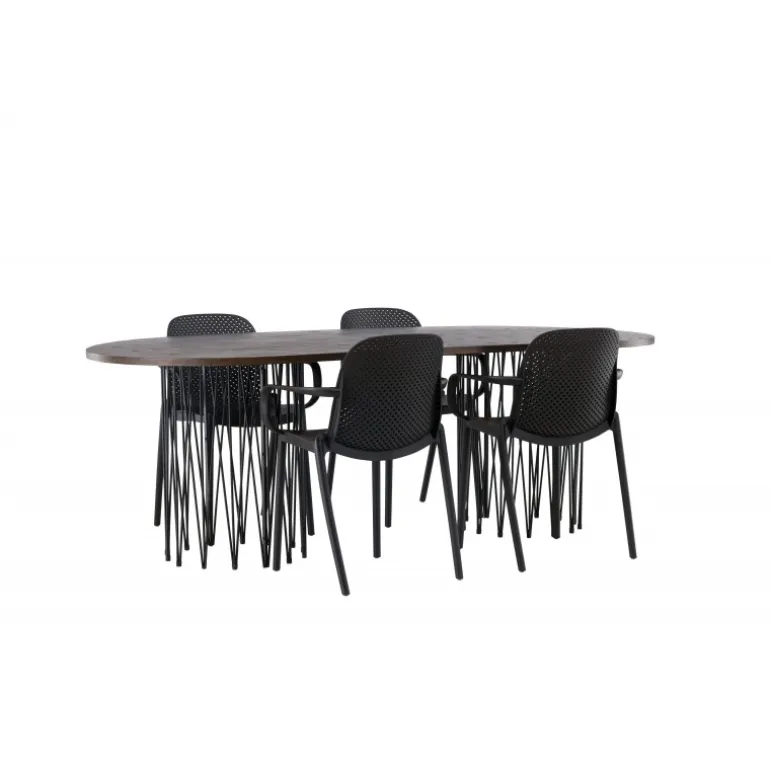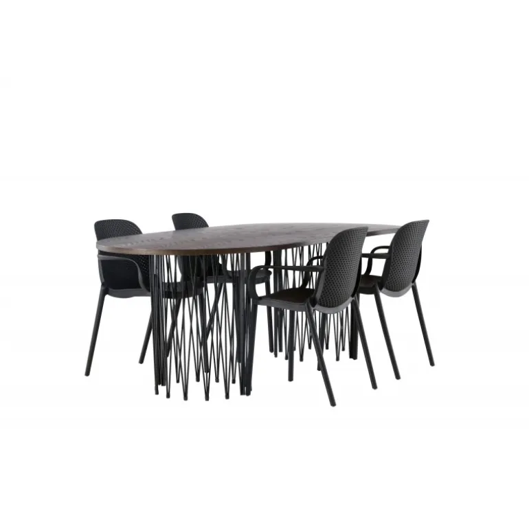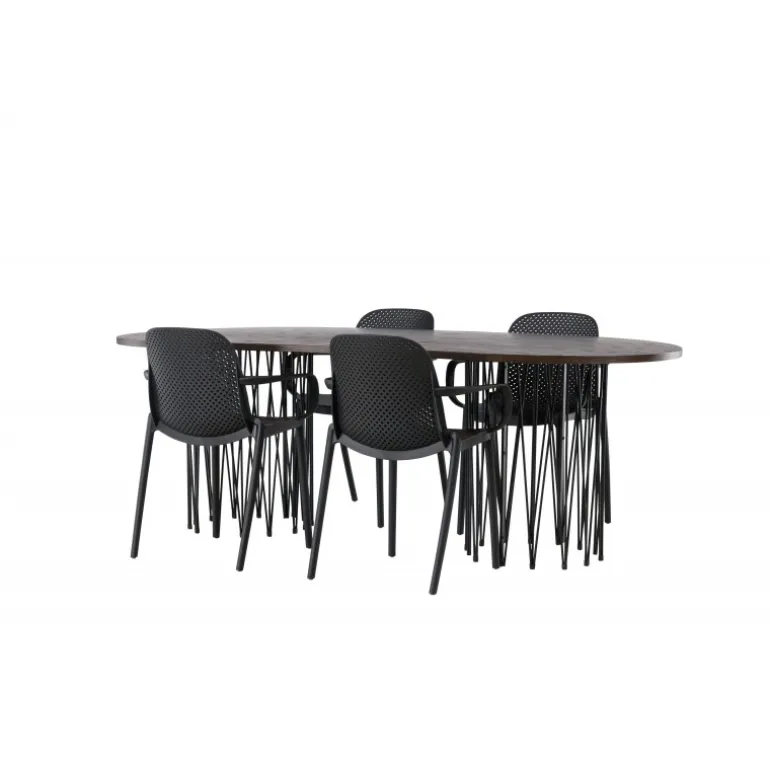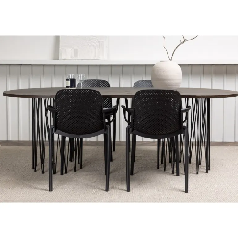 En Spisebordssæt i et industrielt look! Vores ovale spisebord Stone imponerer med sit modebevidste design. Bordet har en smuk brun bordplade i MDF med finer og to dekorative cylindriske rammer i sort metal. Her sammen med vores smarte spisebordsstole fra Baltimore-serien. Stolen er lavet af sort plastik, og designet er trendy med lige nordiske former og integrerede armlæn for ekstra komfort. En holdbar Spisebordssæt, der står tidens test! Bordmål: 220x100cm.