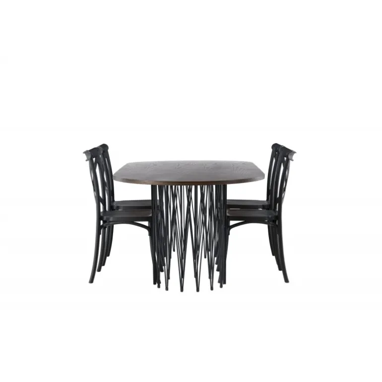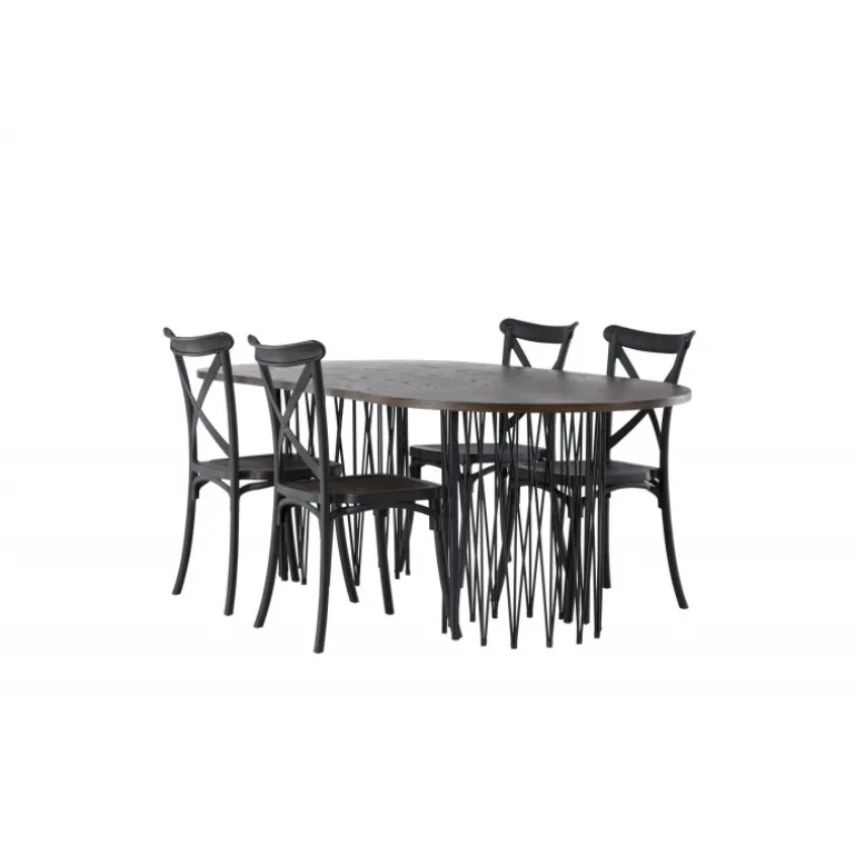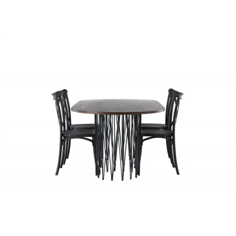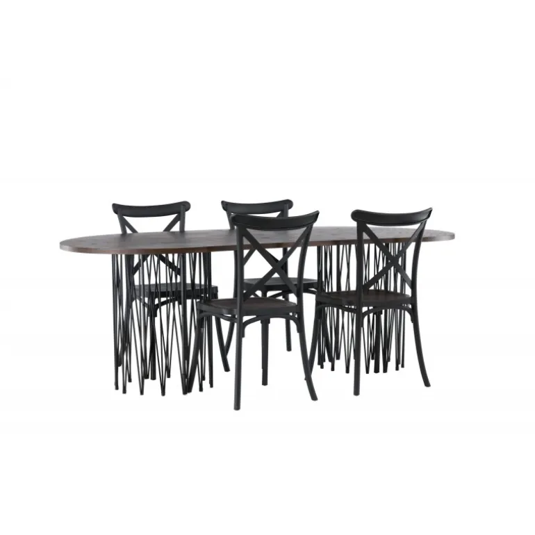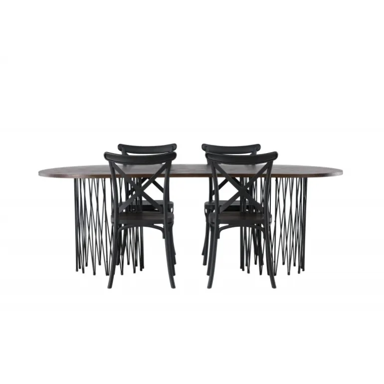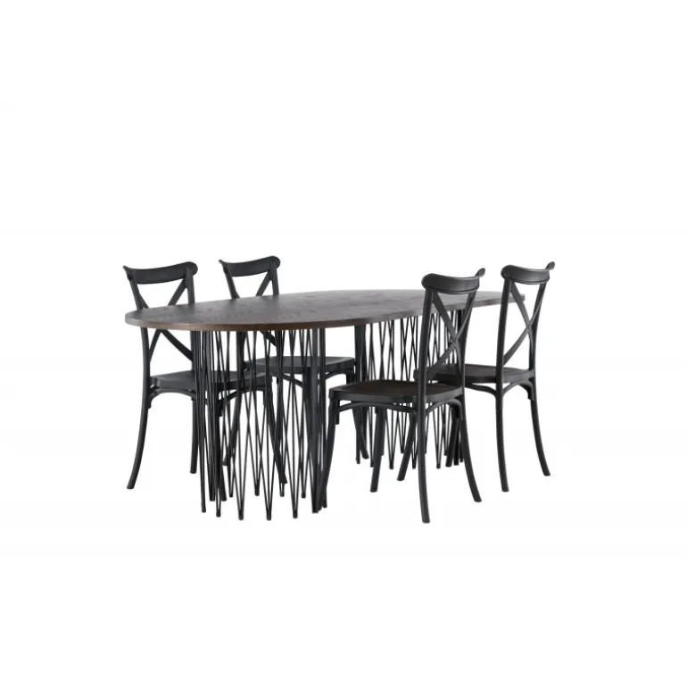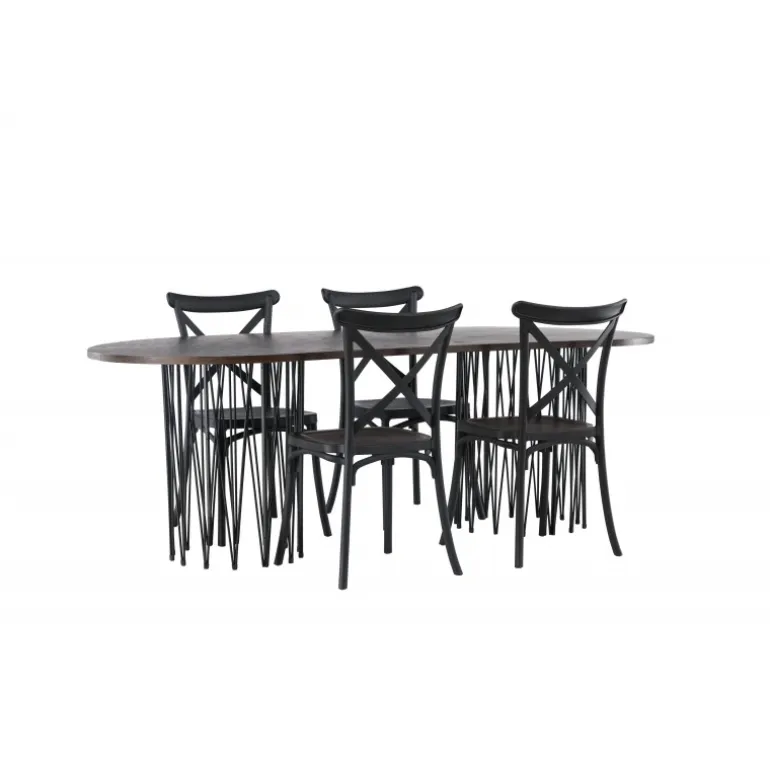 Indret dig storslået! Vores ovale spisebord Stone imponerer med sit modebevidste design. Bordet har en smuk brun bordplade i MDF med finer og to dekorative cylindriske rammer i sort metal. Her sammen med sorte spisebordsstole fra Crosett-serien. Stolen er konsekvent lavet af det praktiske materiale plastik og har en mat sort farve, der holder i tiden. Sæt tonen i stuen med en personlig Spisebordssæt! Bordets dimensioner: 220x100cm.