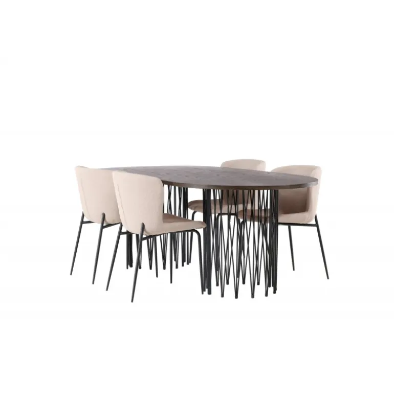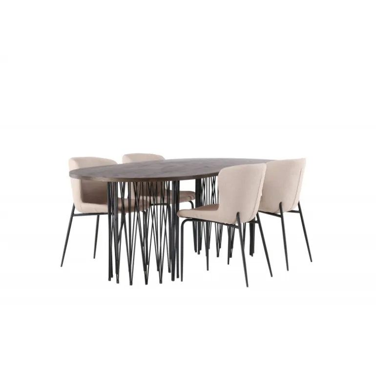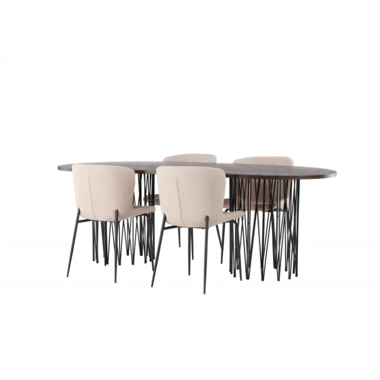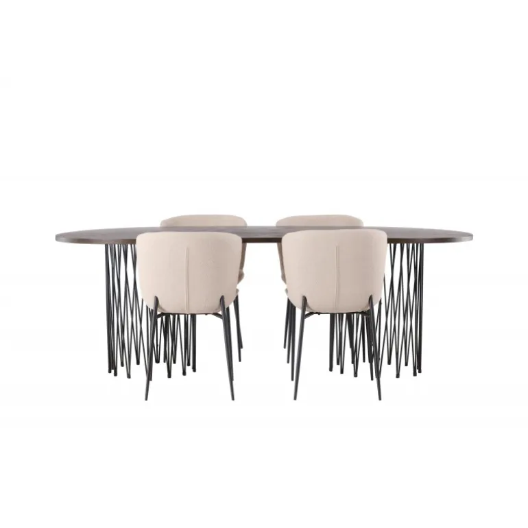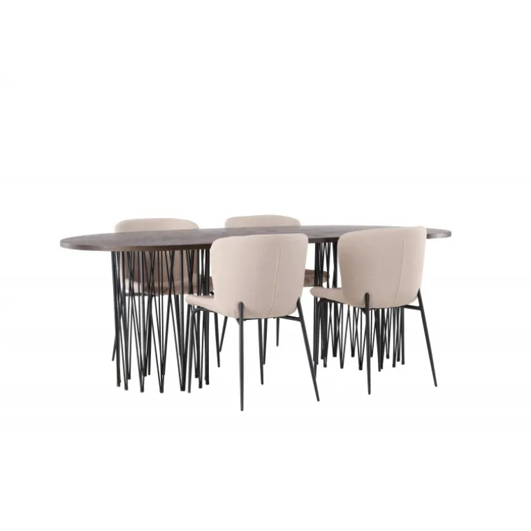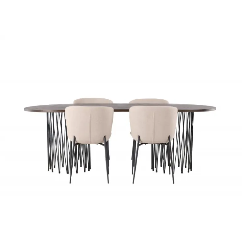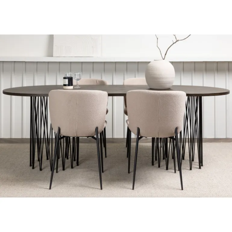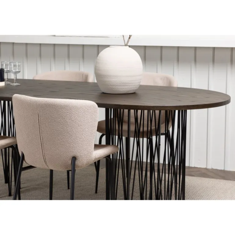 Velkommen hjem til et charmerende midtpunkt! Vores ovale spisebord Stone imponerer med sit modebevidste design. Bordet har en smuk brunfarvet bordplade i MDF med finer og to dekorative cylindriske rammer i sort metal. Her sammen med modebevidste spisestole fra Modesto-serien. Stolen er fuldt polstret i grå shaggy stof med stilfulde smalle stoleben i sort metal. Den let afrundede ryg og polstrede sædehynde giver ekstra komfort og forlænger hyggelige måltider omkring spisebordet. Sid behageligt med venner og familie! Bordmål: 220x100cm.