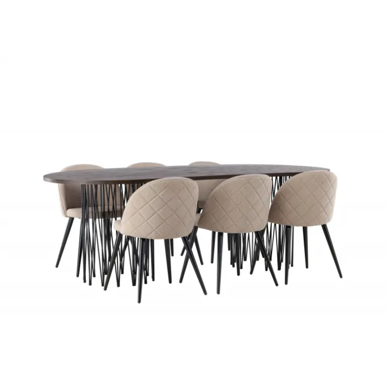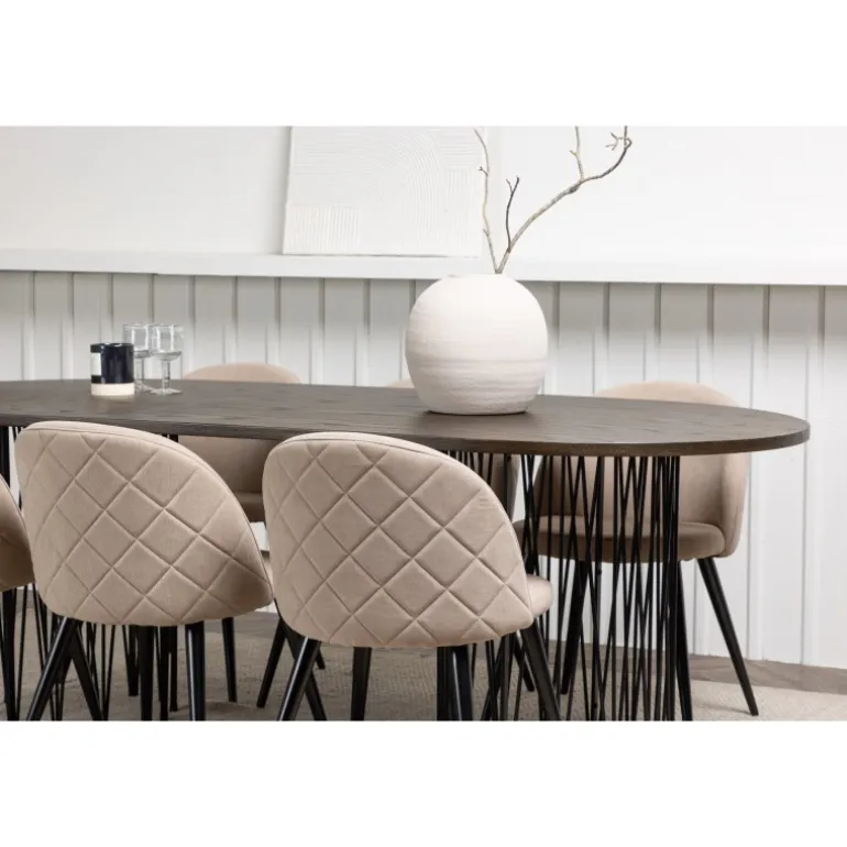 En vidunderlig kombination af høj komfort og moderne former! Vores ovale spisebord Stone imponerer med sit modebevidste design. Bordet har en smuk brun bordplade i MDF med finer og to dekorative cylindriske rammer i sort metal. Her i trendy kombination med spiseborde fra Velvet Stitches-serien. Stolens ryg er afrundet og, ligesom sædet, er den blødt polstret i beige polyesterlin med dekorative syninger og ternet mønster på bagsiden. Benene er let udadgående i sort jern. Indret dit hjem trend-sikkert! Bordmål: 220×100 cm.
