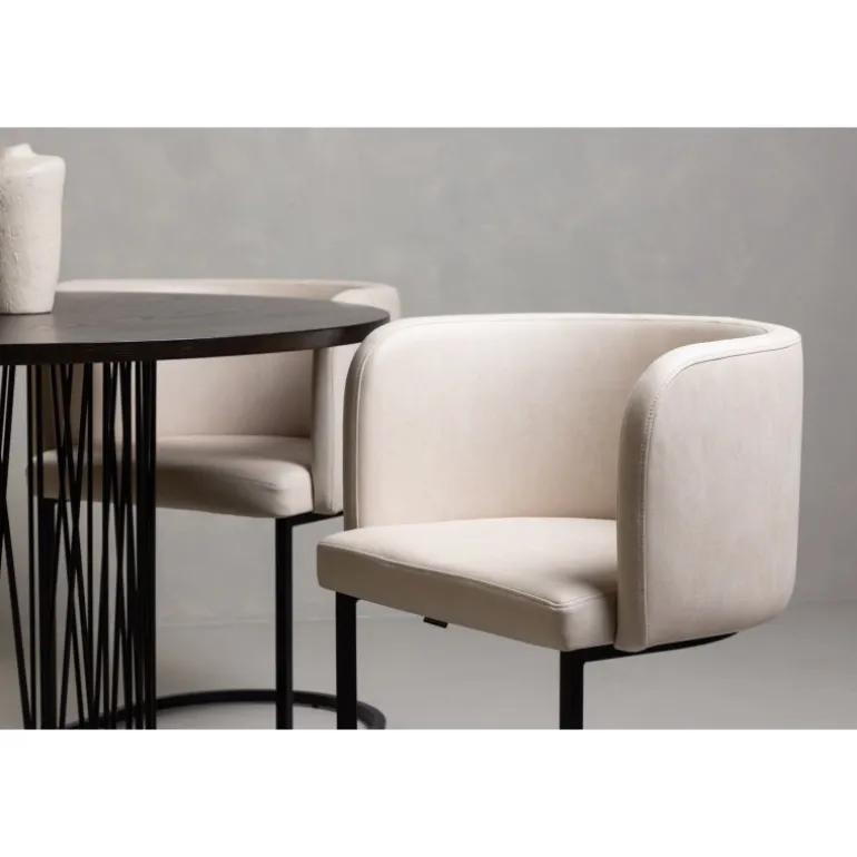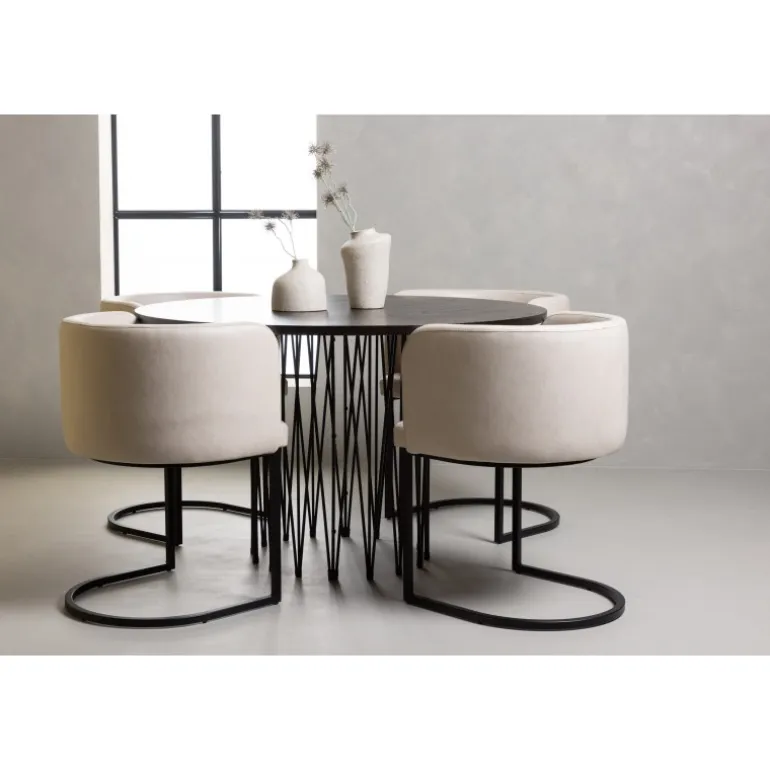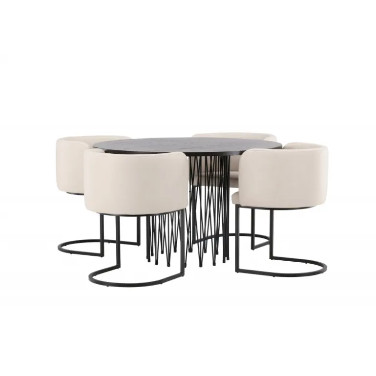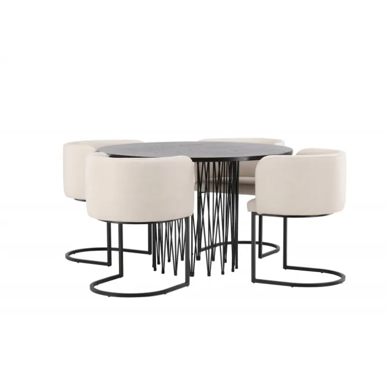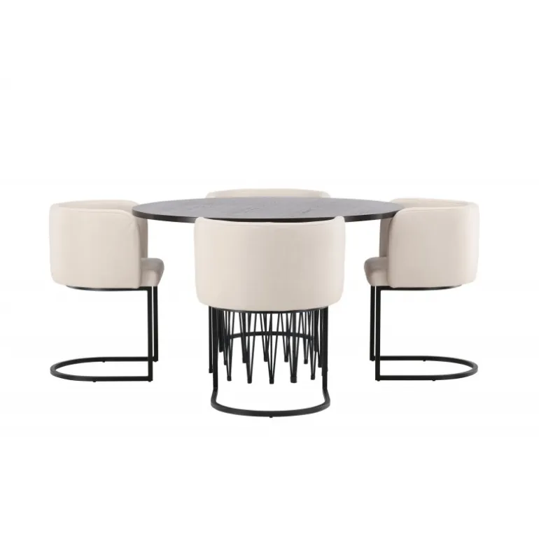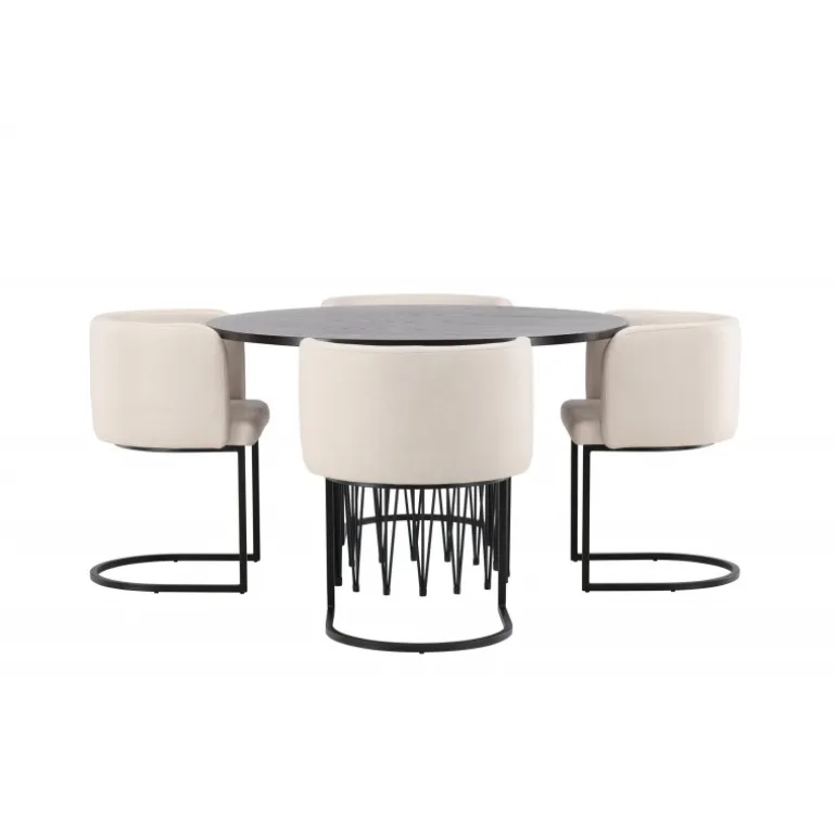 Dette spisebordssæt udstråler elegance og bekvemmelighed! Det runde spisebord Stone imponerer med sit modebevidste design og smukke brune MDF-bordplade med finer og en dekorativ cylindrisk base i sort metal. Her sammen med vores elegante spisebordsstole fra Simrishamn-serien. Stolen har et fuldt polstret sæde med en rundet ryg i beige TC-stof og en dekorativ, minimalistisk benstruktur i sort stål. Det skal føles luksuriøst at komme hjem! Bordets diameter: 120 cm.