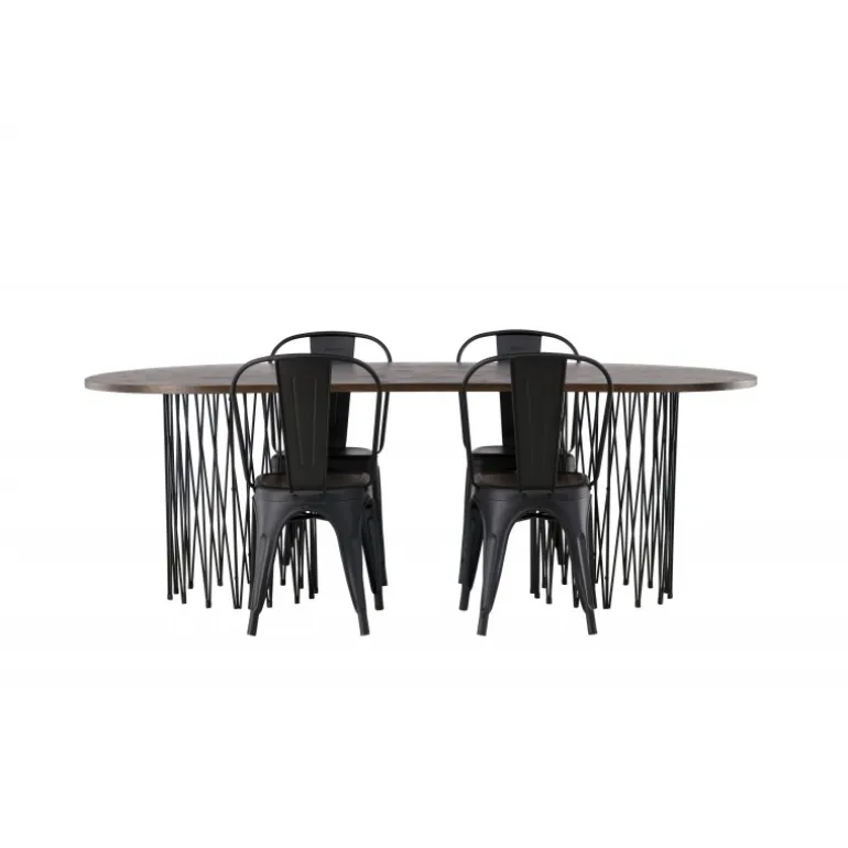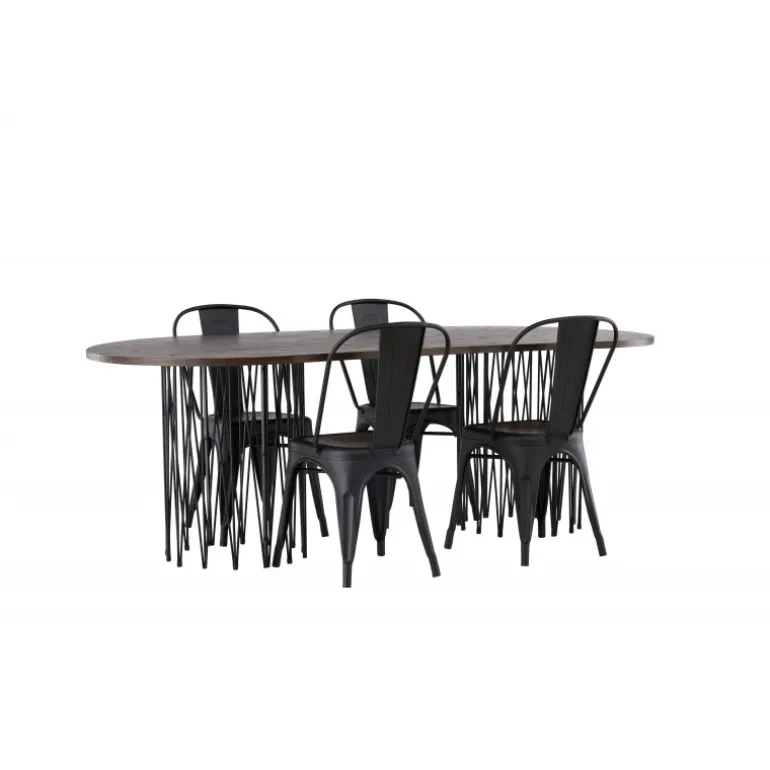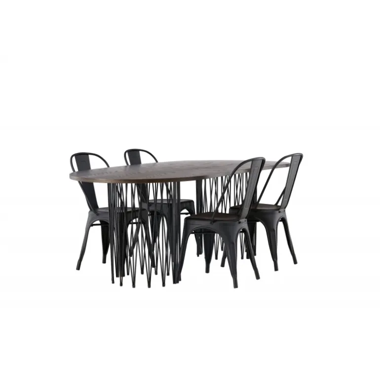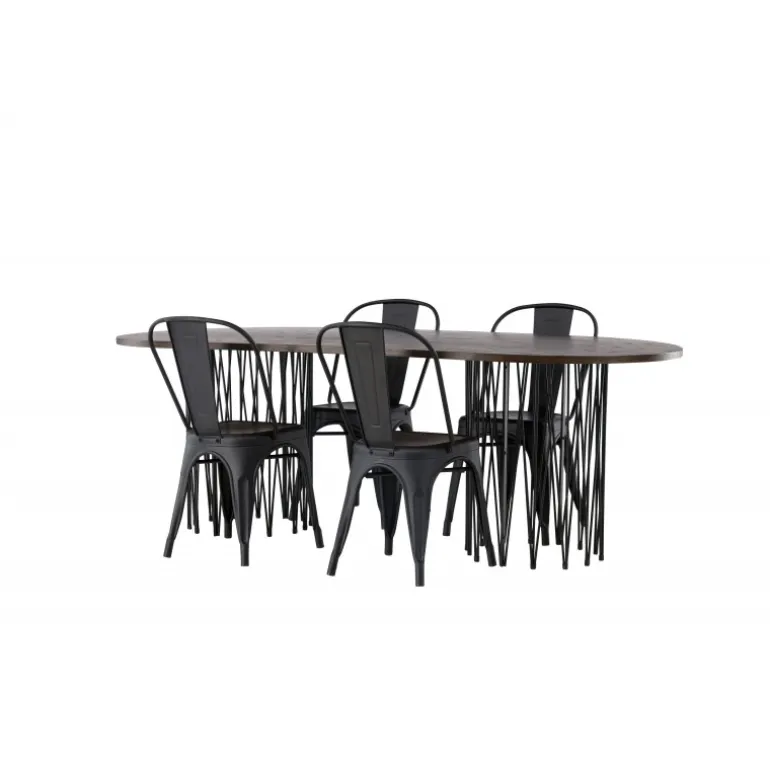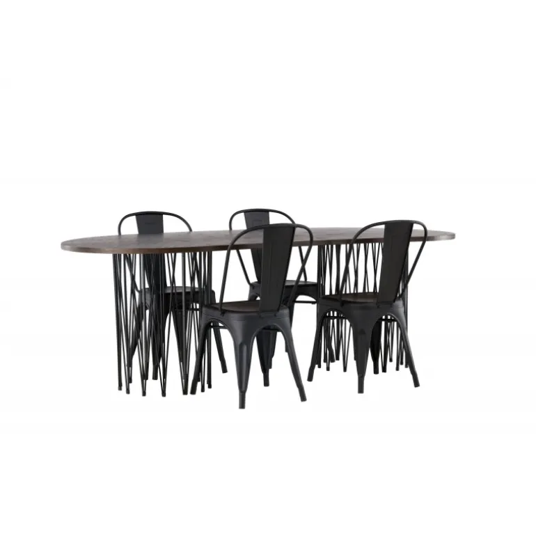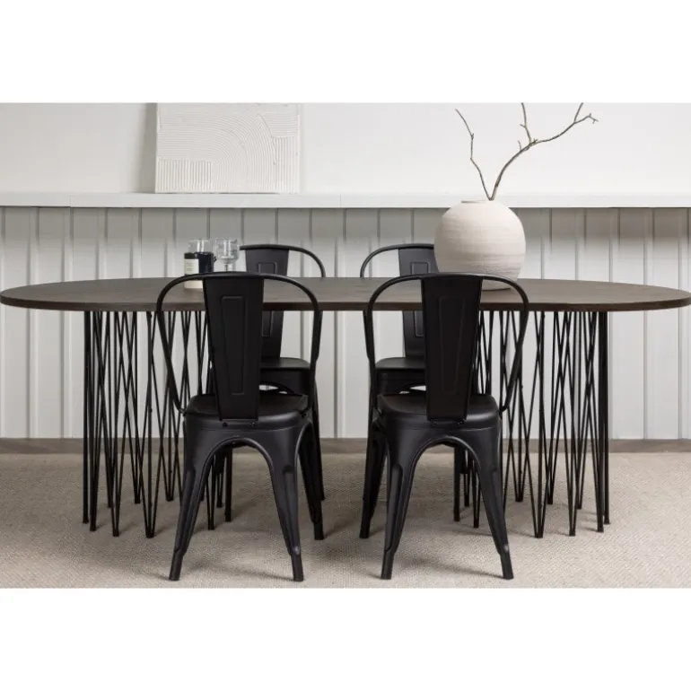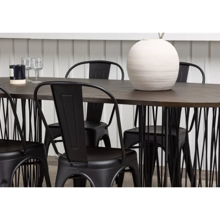 Som smart som det er stilfuldt! Vores ovale spisebord Stone imponerer med sit modebevidste design. Bordet har en smuk brunfarvet bordplade i MDF med finer og to dekorative cylindriske rammer i sort metal. Her sammen med vores sorte spisebordsstole fra Tempe-serien. Stolen har let udadvendte ben, der glat møder sædet og ryglænet i et stilfuldt design, lavet af sort metal hele vejen igennem. Kort sagt, en storslået Spisebordssæt! Bordmål: 220x100cm.