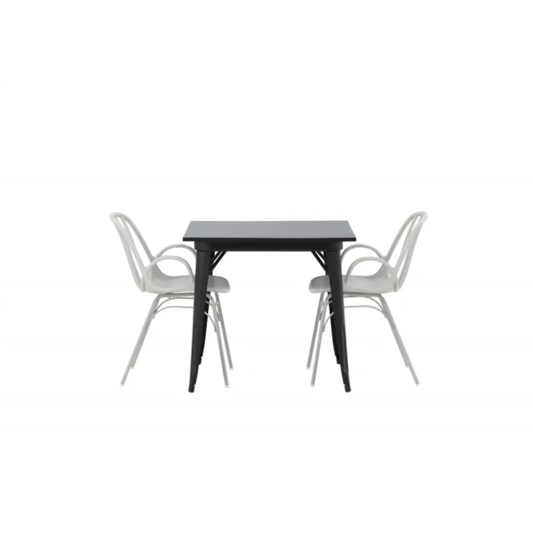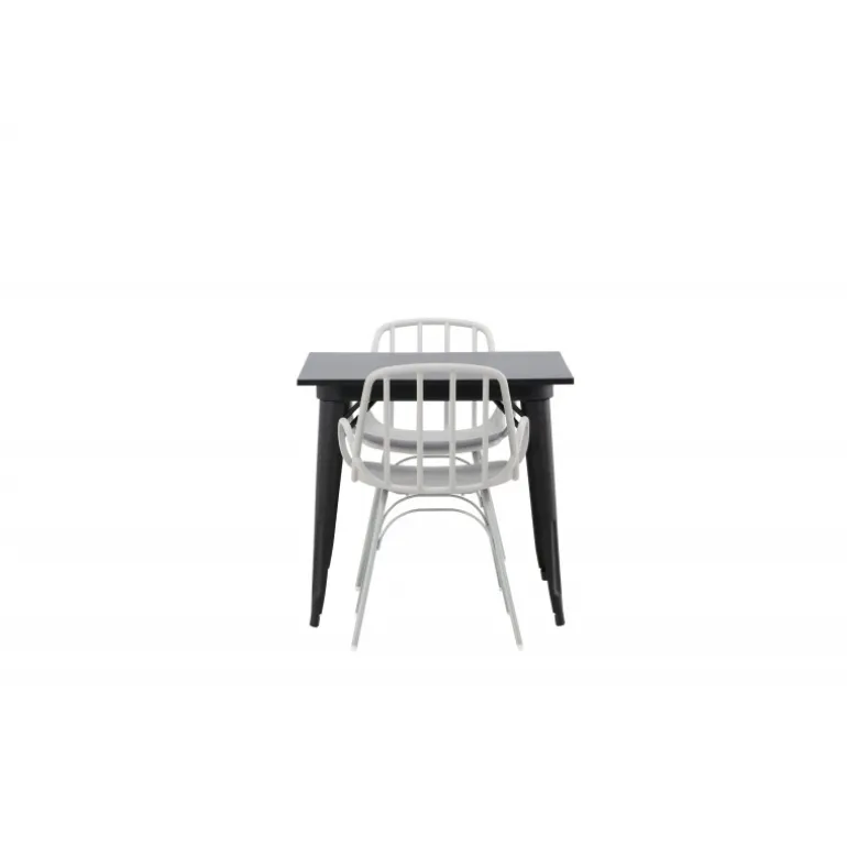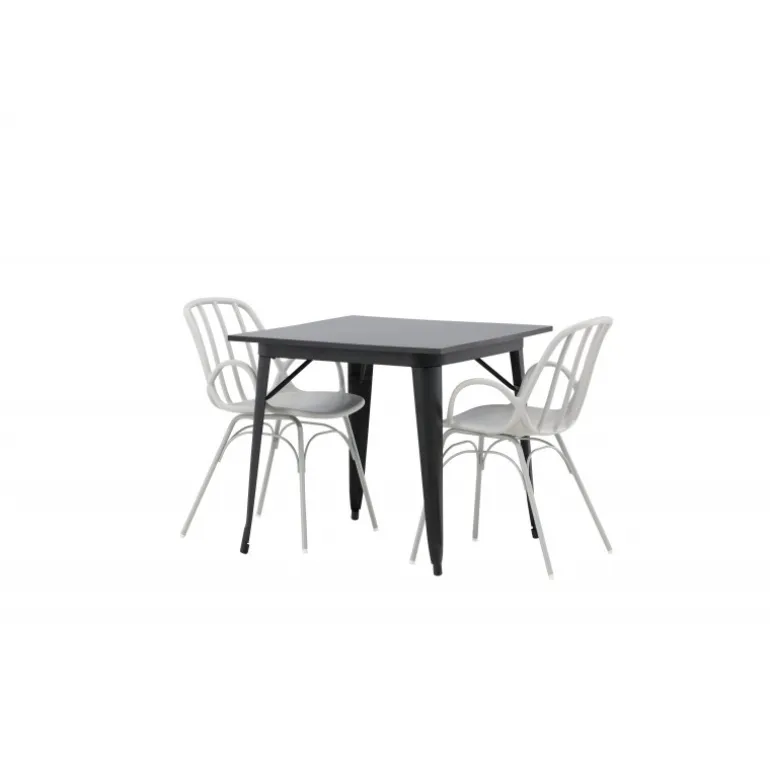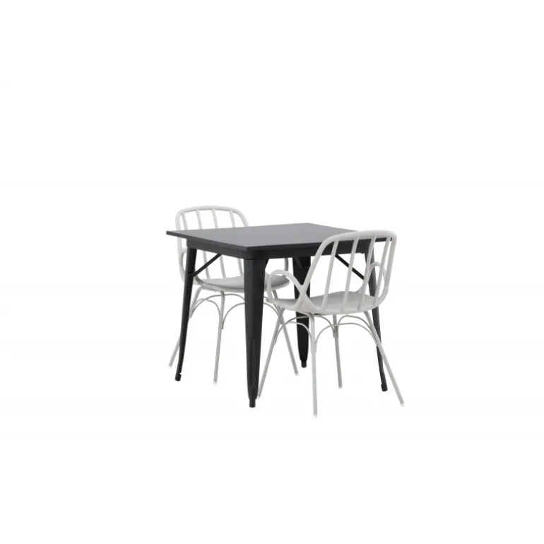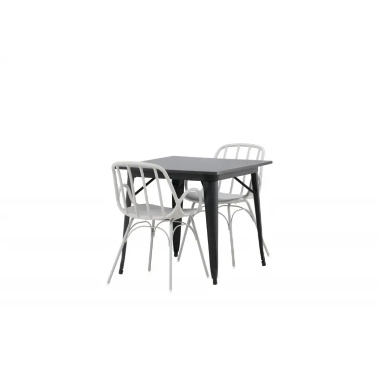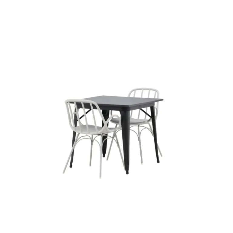 Indret smart og indbydende med et trendy Spisebordssæt! Tempe spisebord har et skandinavisk design med lige nordiske former, der holder over tid. Fremstillet med en firkantet bordplade i sort MDF og bordben i sort metal. Her sammen med 2 spisestole fra serien Dyron. Stolen er lige så stilfuld som praktisk, lavet af beige plast og stål. Stolen har integrerede armlæn og et ribbet design i den let afrundede ryg. Et perfekt Spisebordssæt til det mindre køkken!