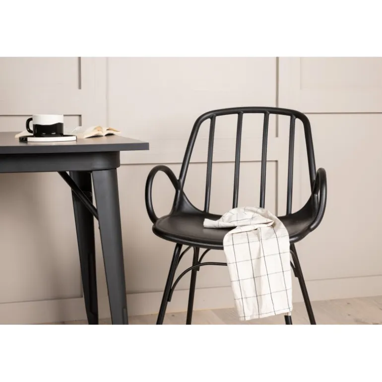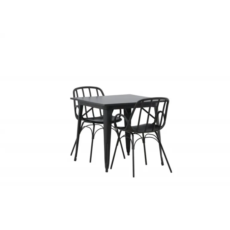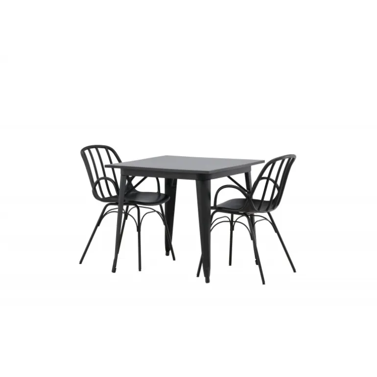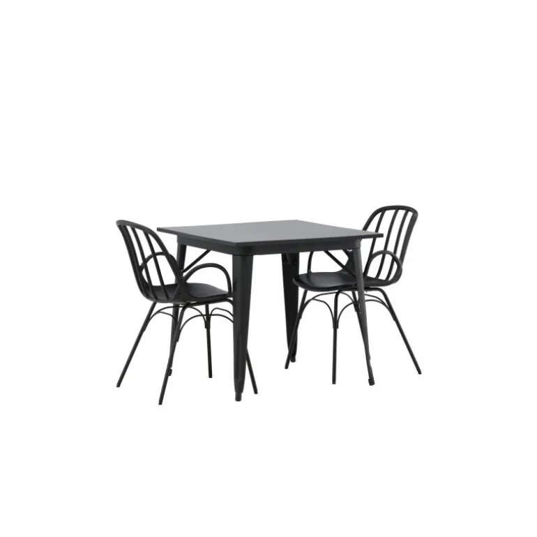 Et perfekt Spisebordssæt til det mindre køkken! Tempe spisebordet har et skandinavisk design med lige, nordiske former, der står tidens prøve. Lavet med en kvadratisk bordplade i sort MDF og bordben i sort metal. Her sammen med 2 spisebordsstole fra serien Dyron. Stolen er lige så stilfuld som den er praktisk, lavet af sort plastik og stål. Stolen har integrerede armlæn og et ribbet design i den let afrundede ryg. Indret smart og indbydende med et trendy sort Spisebordssæt!