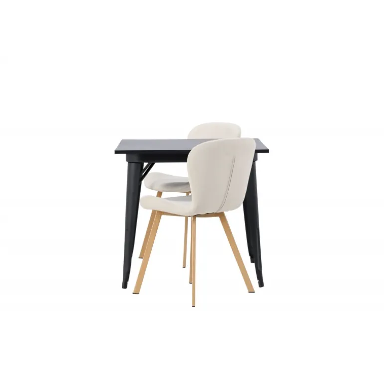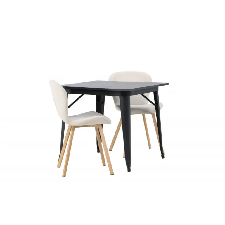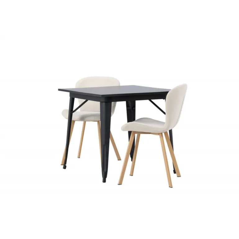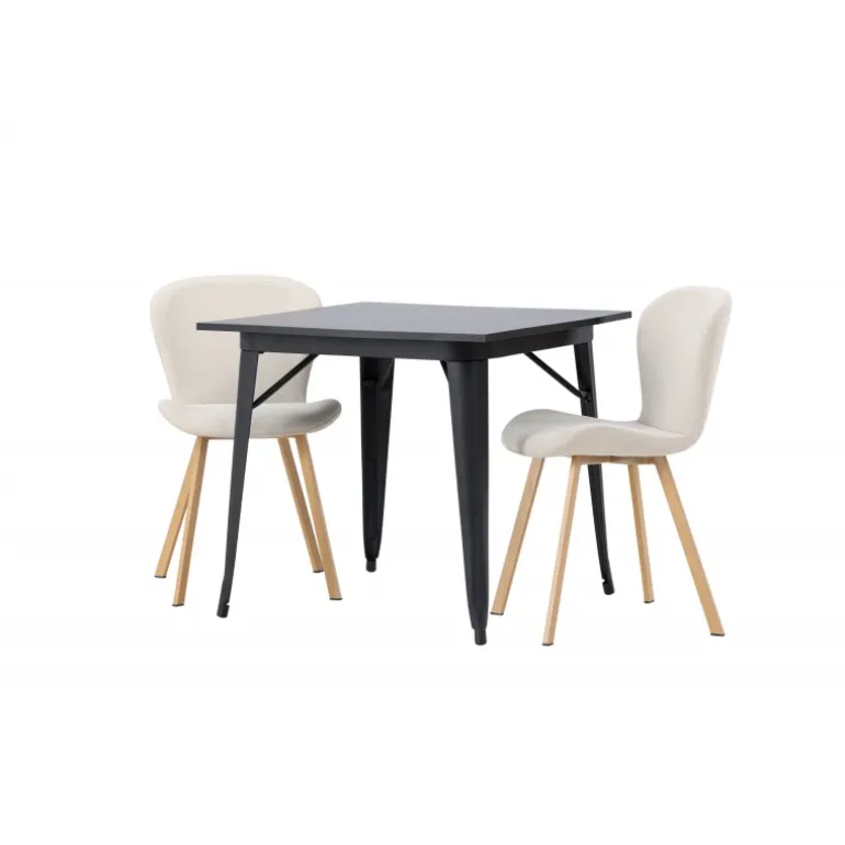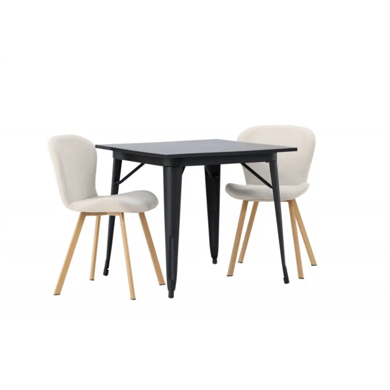 Moderne former og stilfuldt design! Vores kvadratiske spisebord Tempe har en kompakt størrelse og trendy, skandinavisk design. Lavet med en bordplade i sort MDF og bordben i sort metal. Her i vidunderlig kombination med beige spisestole fra Lilja-serien. Stolen har et bøjeligt rundt design med sæde i beige polyesterstof og let udadgående stoleben i sort metal. Den varme farve skaber en behagelig atmosfære! Bordmål: 80x80cm.