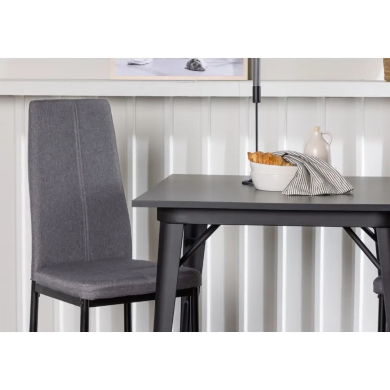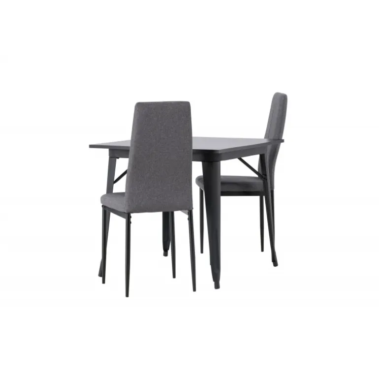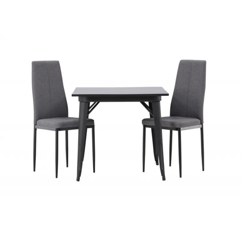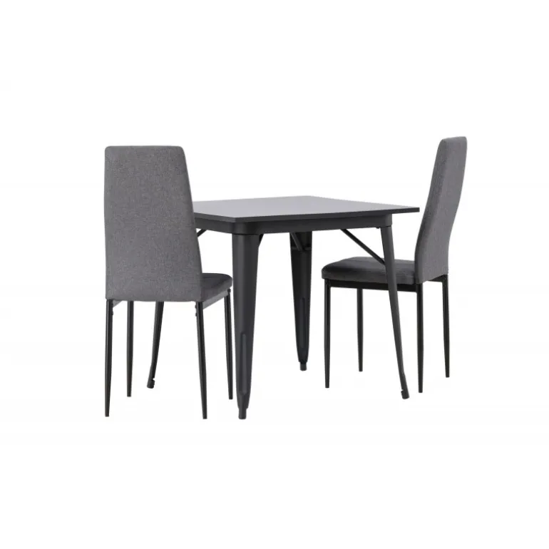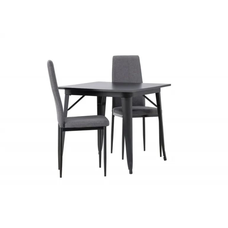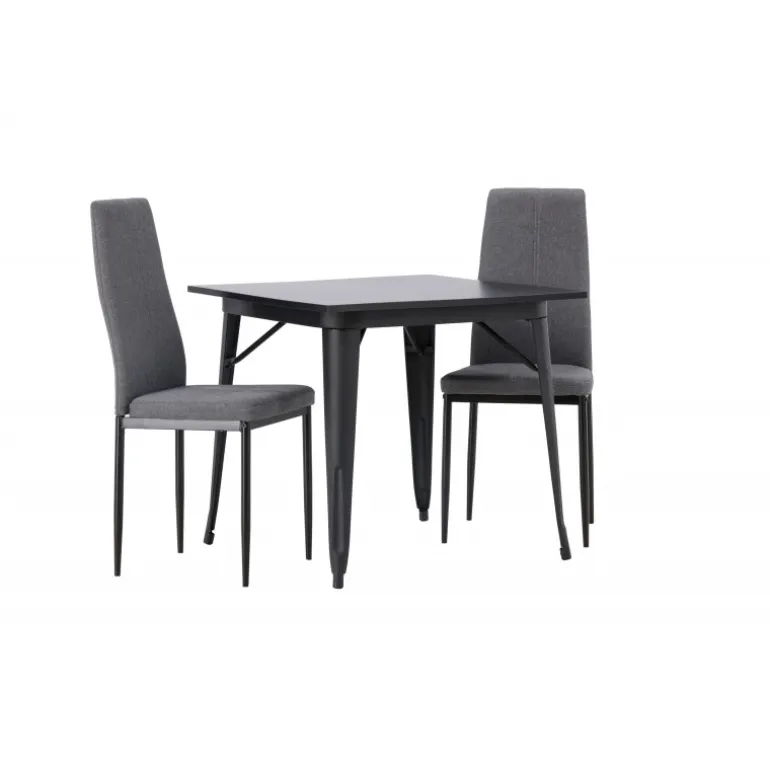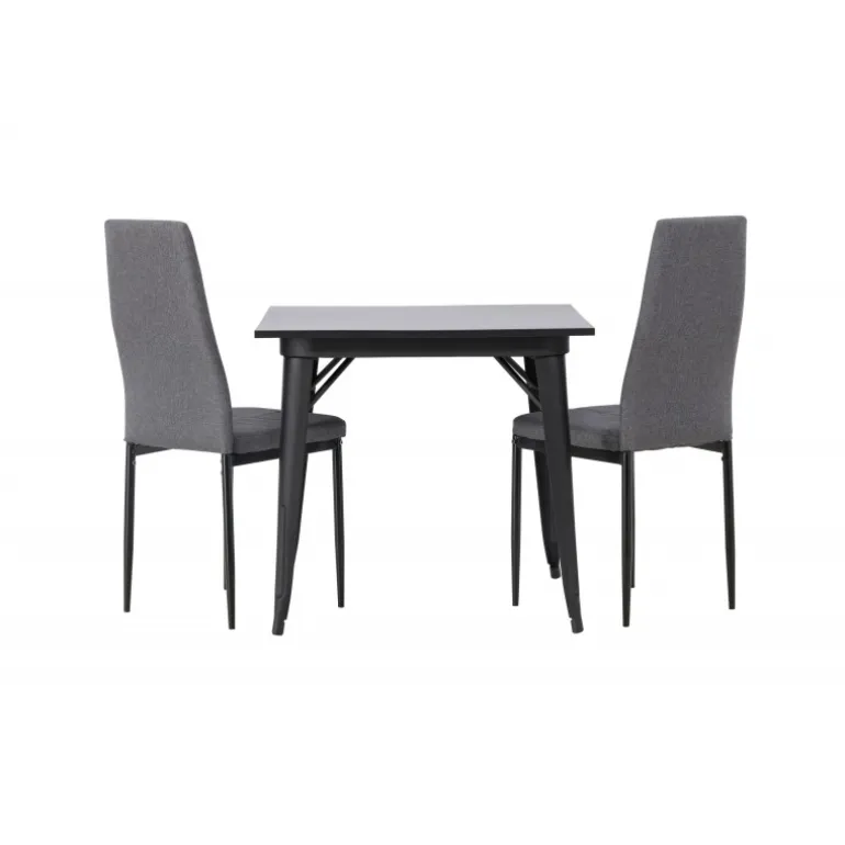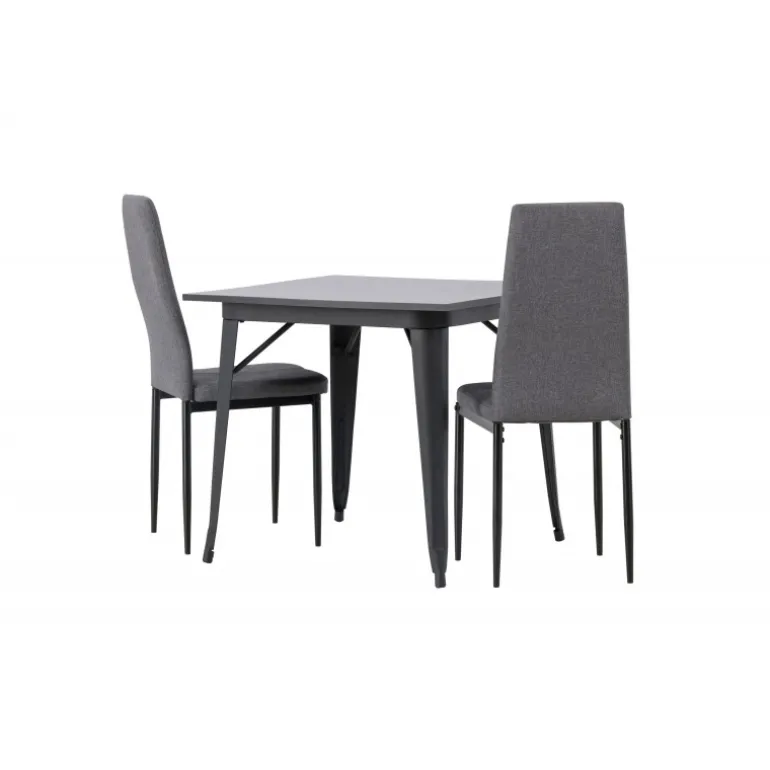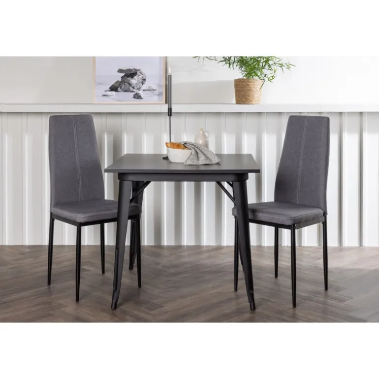 Oplev et holdbart Spisebordssæt i trendy farver! Vores firkantede spisebord Tempe har en praktisk størrelse og et trendy, skandinavisk design. Bordpladen er fremstillet af sort MDF, og bordbenene er i sort metal. Sættet inkluderer også de storslåede spisebordsstole fra Petra-serien. Stolen har en høj ryg og en fuldt polstret sæde i grå polyesterstof, som er polstret for ekstra komfort. Stolebenene er lige og lavet af sort metal. Her får du det bedste fra begge verdener! Bordmål: 80×80 cm.