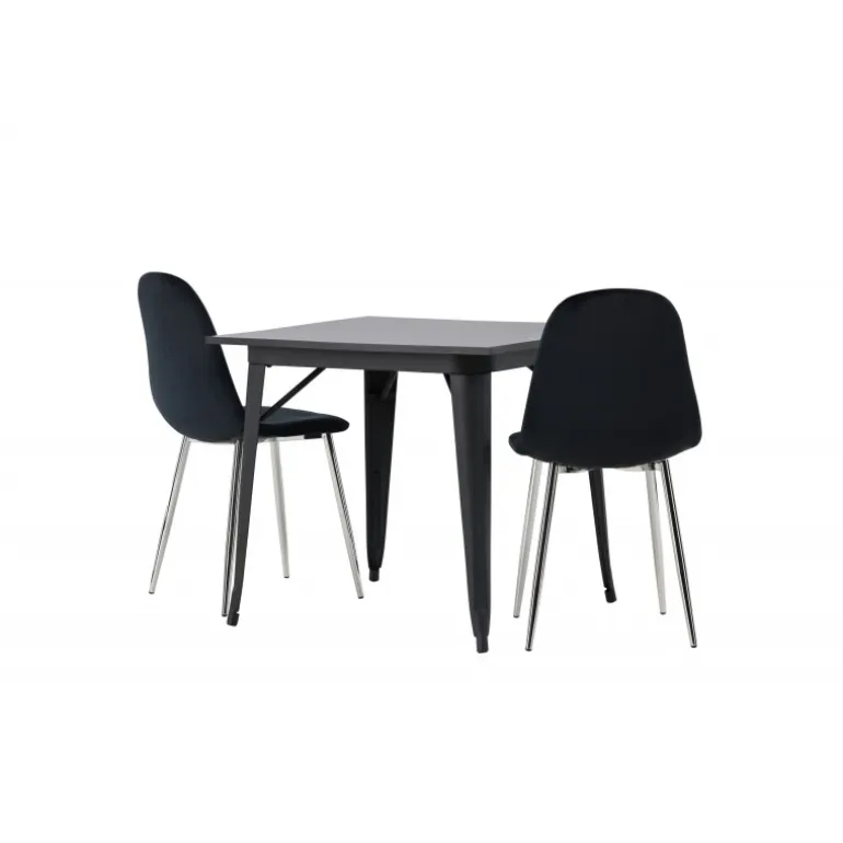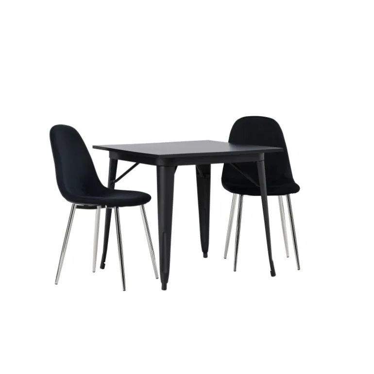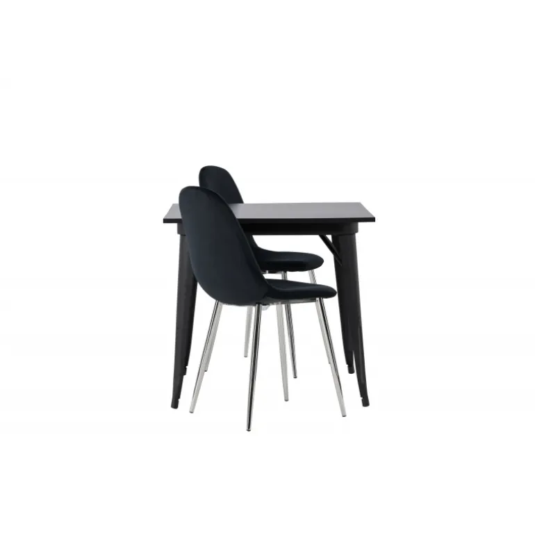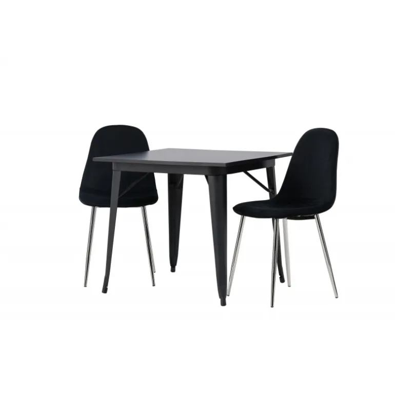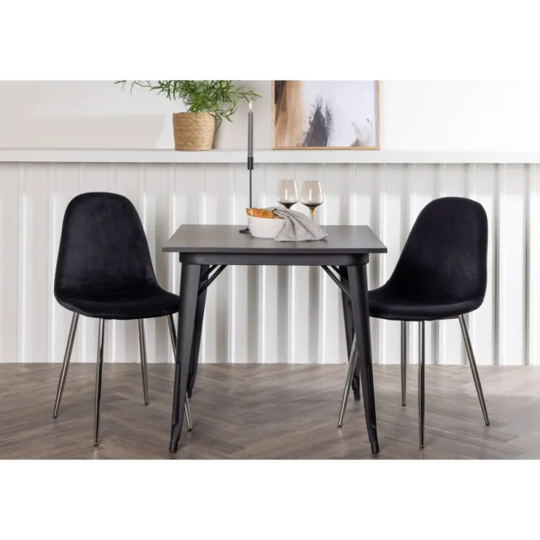 Sid behageligt i vores fantastiske Spisebordssæt til to! Vores firkantede spisebord Tempe har en kompakt størrelse og trendy, skandinavisk design. Bordet er lavet med en bordplade i sort MDF og bordben i sort metal. Her i en moderne kombination med sorte spisebordsstole fra Polar-serien. Stolen har et fuldt polstret design med ben i kromet metal, en let rundet ryg og sæde i elegant sort fløjlstof med blød polstring for ekstra komfort. Lige så stilfuld som den er komfortabel! Bordets dimensioner: 80×80 cm.