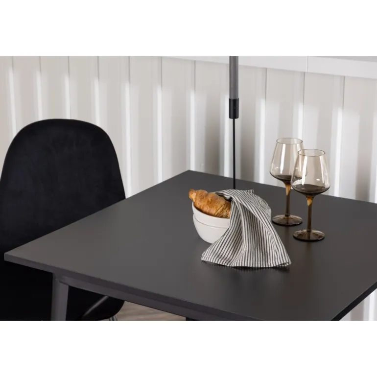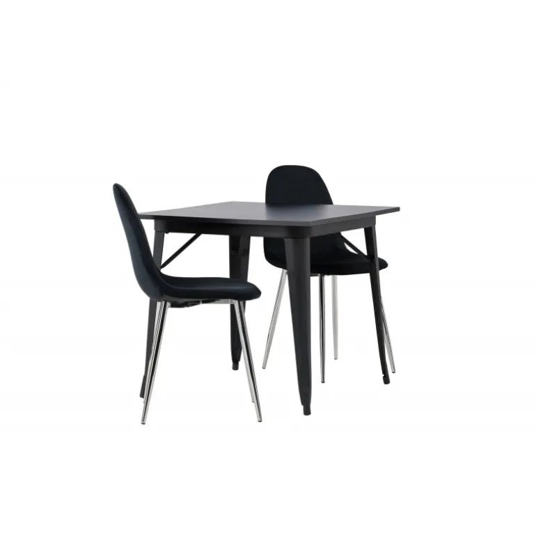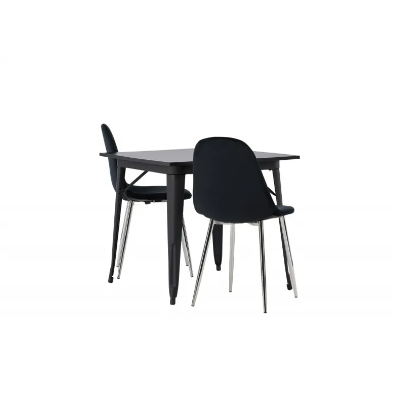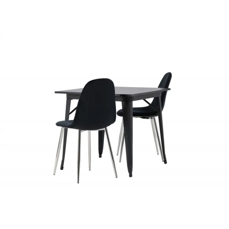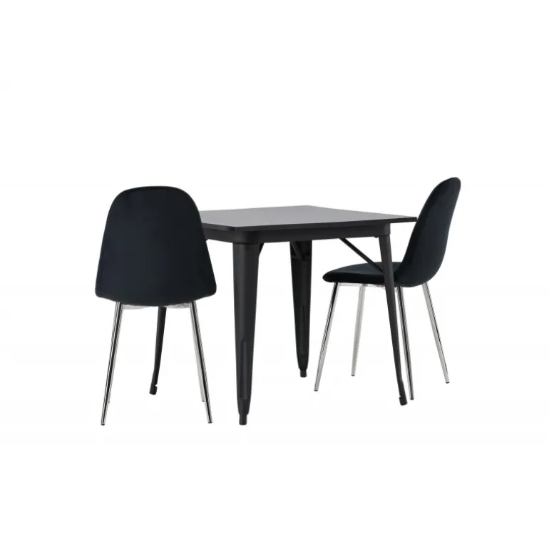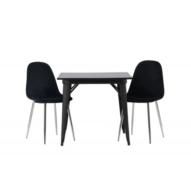 Sid behageligt i vores fantastiske Spisebordssæt til to! Vores firkantede spisebord Tempe har en kompakt størrelse og trendy, skandinavisk design. Bordet er lavet med en bordplade i sort MDF og bordben i sort metal. Her i en moderne kombination med sorte spisebordsstole fra Polar-serien. Stolen har et fuldt polstret design med ben i kromet metal, en let rundet ryg og sæde i elegant sort fløjlstof med blød polstring for ekstra komfort. Lige så stilfuld som den er komfortabel! Bordets dimensioner: 80×80 cm.