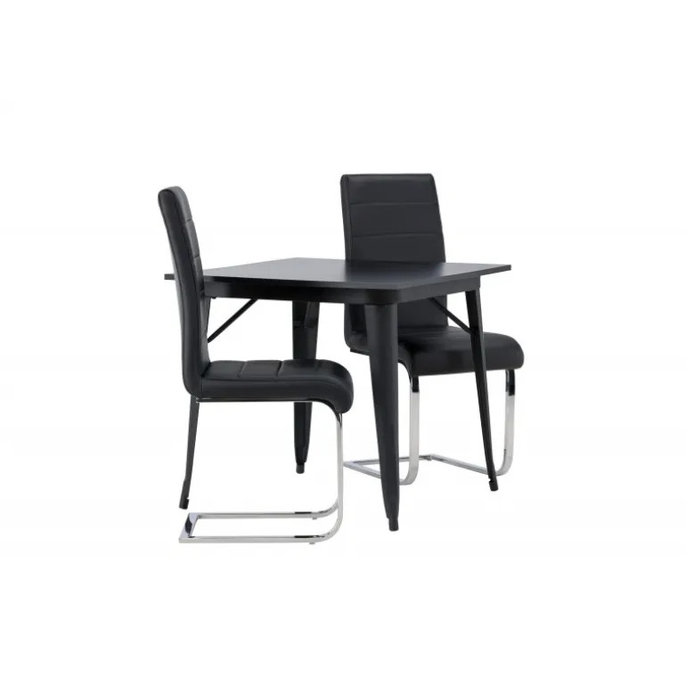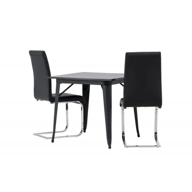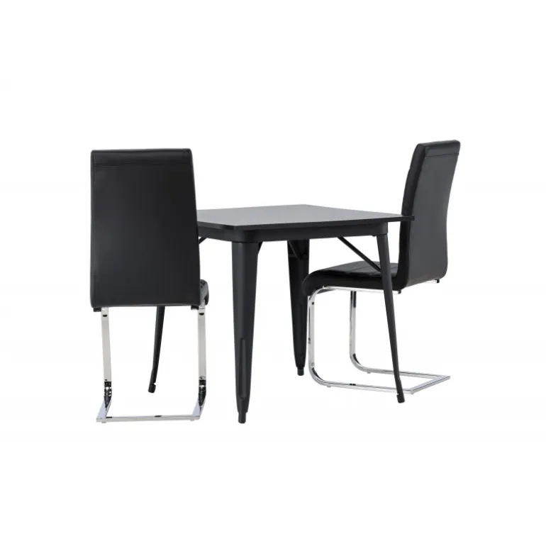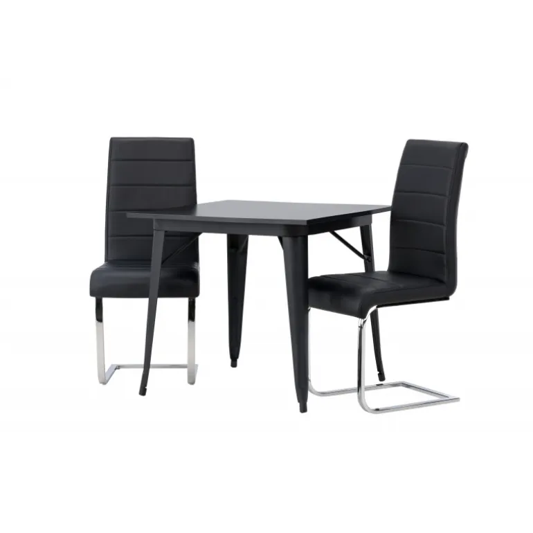 Skab den komfortable kontorstil i køkkenet! Vores kvadratiske spisebord Tempe har en kompakt størrelse og trendy, skandinavisk design. Lavet med en bordplade i sort MDF og bordben i sort metal. Her sammen med vores flotte, sorte spisestole fra Tempo-serien. Stolen har en lige ryg i sort PU med dekorative syninger og benene er dekorative i krommetal. Denne gruppe kombinerer industriel design med stramme nordiske former! Bordmål: 80×80 cm.