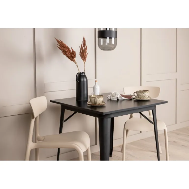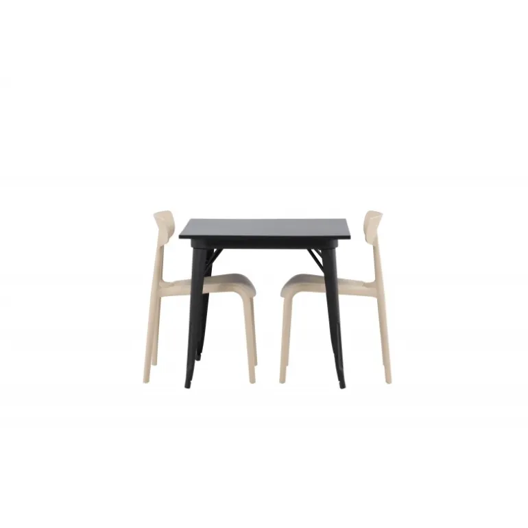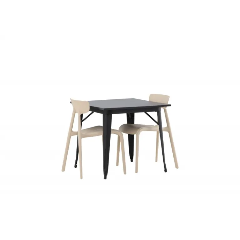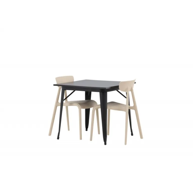 Indret stuen smart og indbydende med et trendy Spisebordssæt! Tempe spisebordet har et skandinavisk design med lige nordiske former, der står tidens test. Lavet med en firkantet bordplade i sort MDF og ben i sort metal. Her sammen med 2 spiseborde fra Ursholmen serien. Fremstillet af holdbar plastik i en blød beige farve, der er nem at matche med andre møbler. Stolen har en pæn ryg med en lidt dybere sæde og let udadvendte ben i skandinavisk design. Et perfekt Spisebordssæt til det mindre køkken!