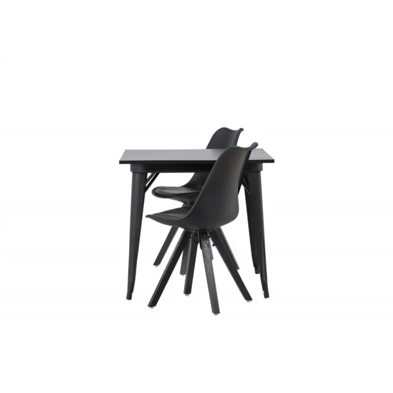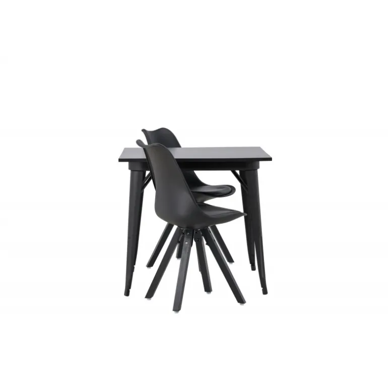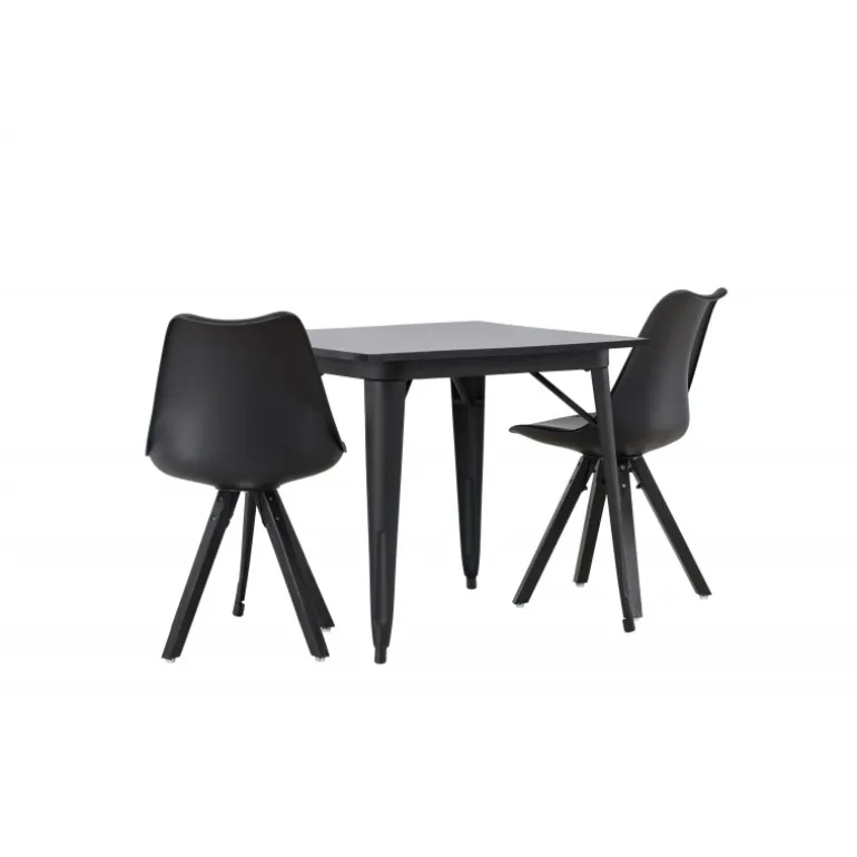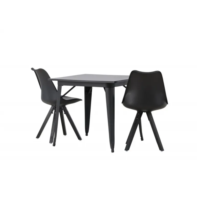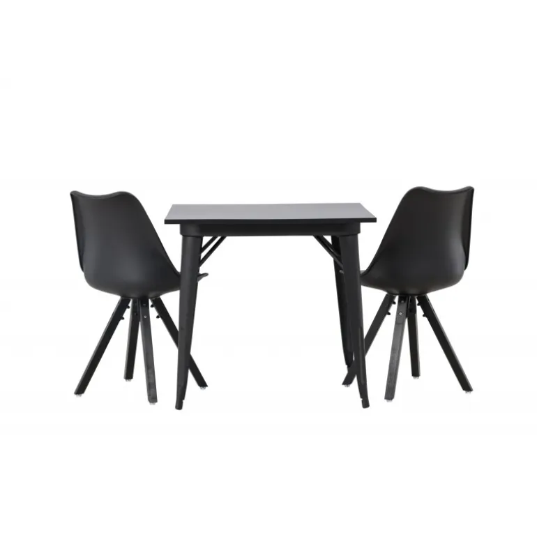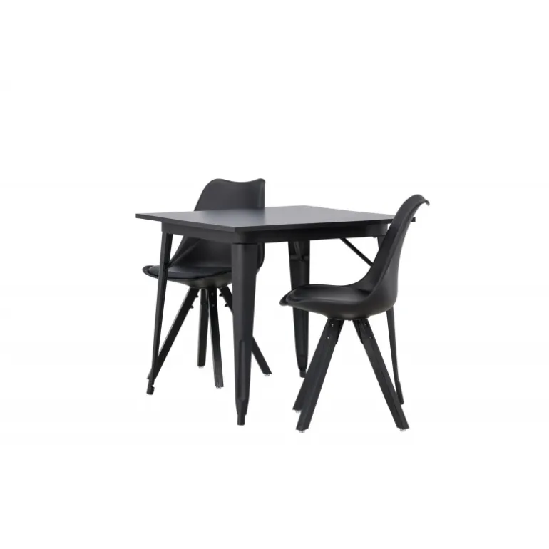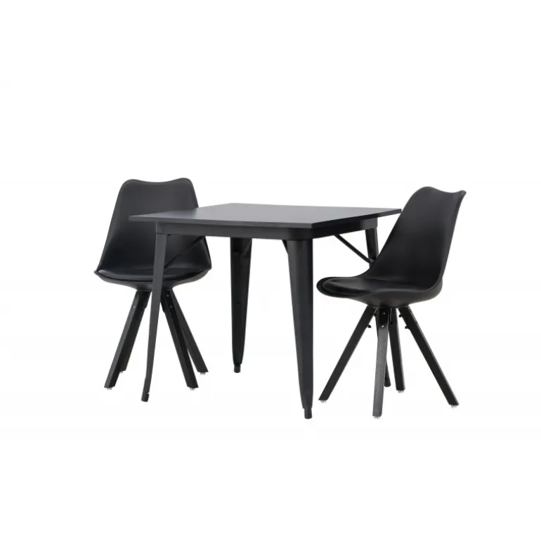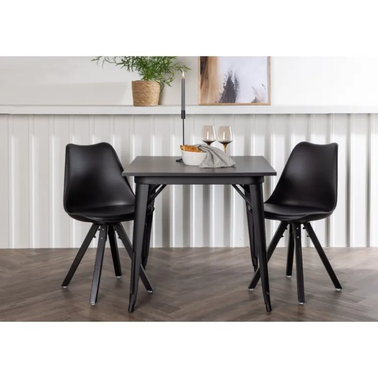 Et modigt Spisebordssæt med en moderne følelse! Vores firkantede spisebord Tempe har en pæn størrelse og et trendy, skandinavisk design. Fremstillet med en bordplade i sort MDF og bordben i sort metal. Her i en stilfuld kombination med bæredygtige spisebordsstole fra Zeno-serien. Stolen har et indbydende design med ryglæn og sæde i sort plast, indbygget sædehynde med høj komfort og fire udstående ben i sort træ. Indret stilbevidst! Borddimensioner: 80×80 cm.