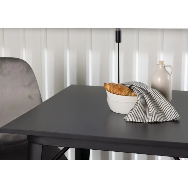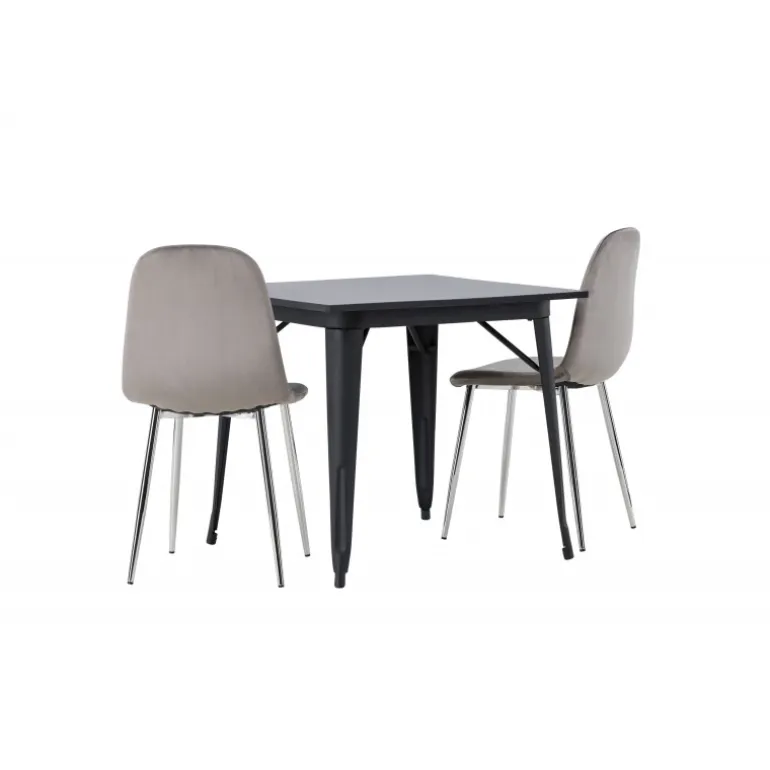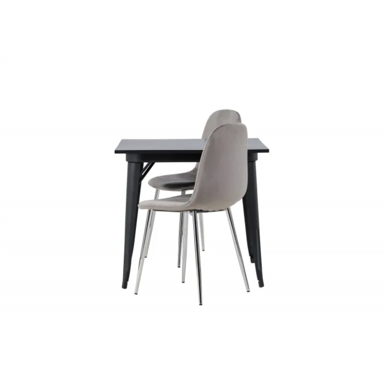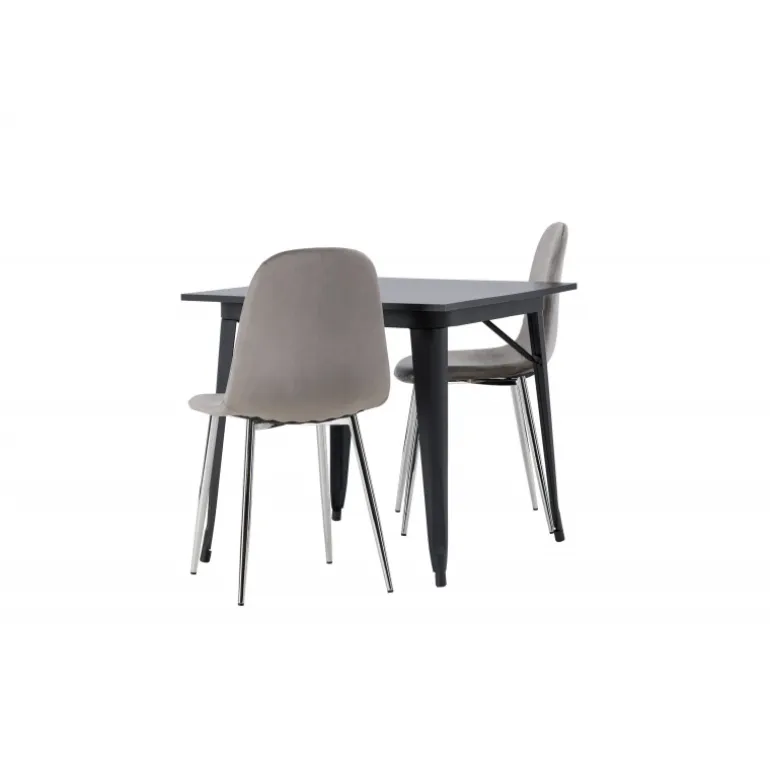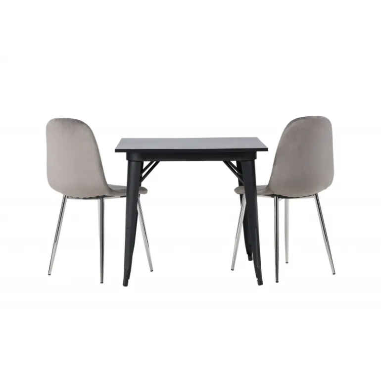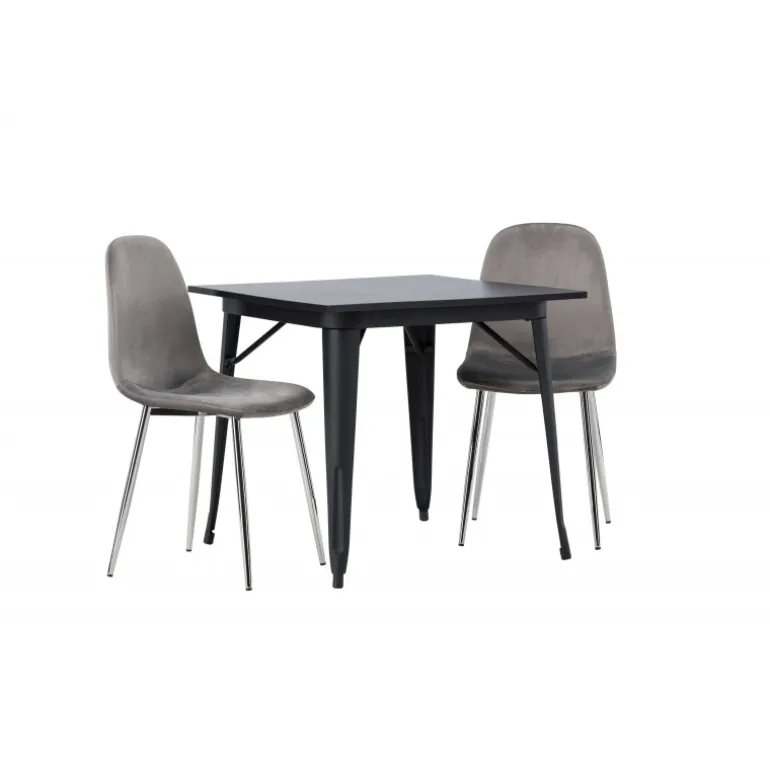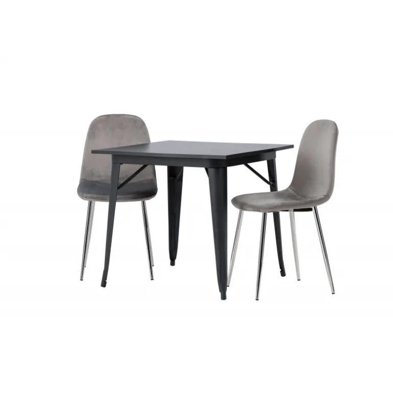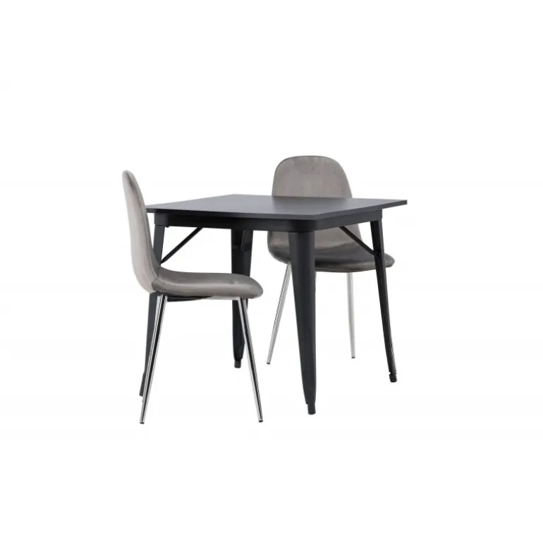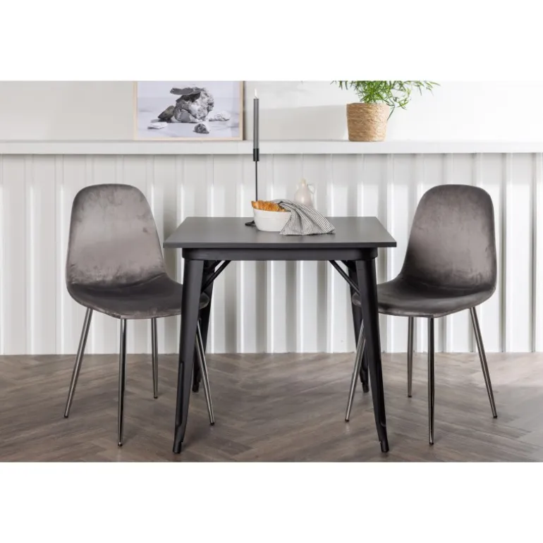 Indret med behagelige farver! Vores kvadratiske spisebord Tempe har en pæn størrelse og trendy, skandinavisk design. Lavet med en bordplade i sort MDF og bordben i sort metal. Her i en moderne kombination med grå spisestole fra Eva-serien. Stolen har et fuldt polstret design med ben i krommetal, en let rundet ryg og sæde i slankt gråt velourstof med blød polstring for ekstra komfort. Her får du en fløjlsagtig blikfang! Bordets dimensioner: 80x80cm.