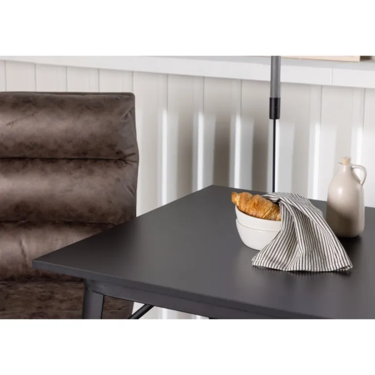 - Minimalistisk æstetik: Sort metalben på både bord og stole for et moderne look.
