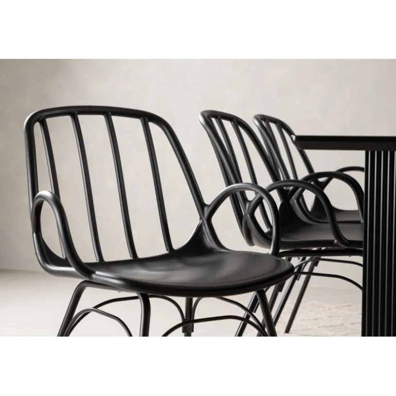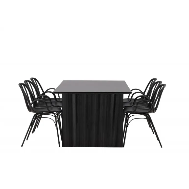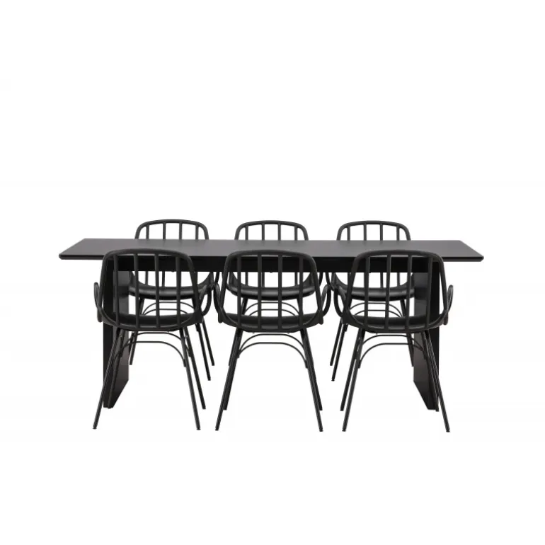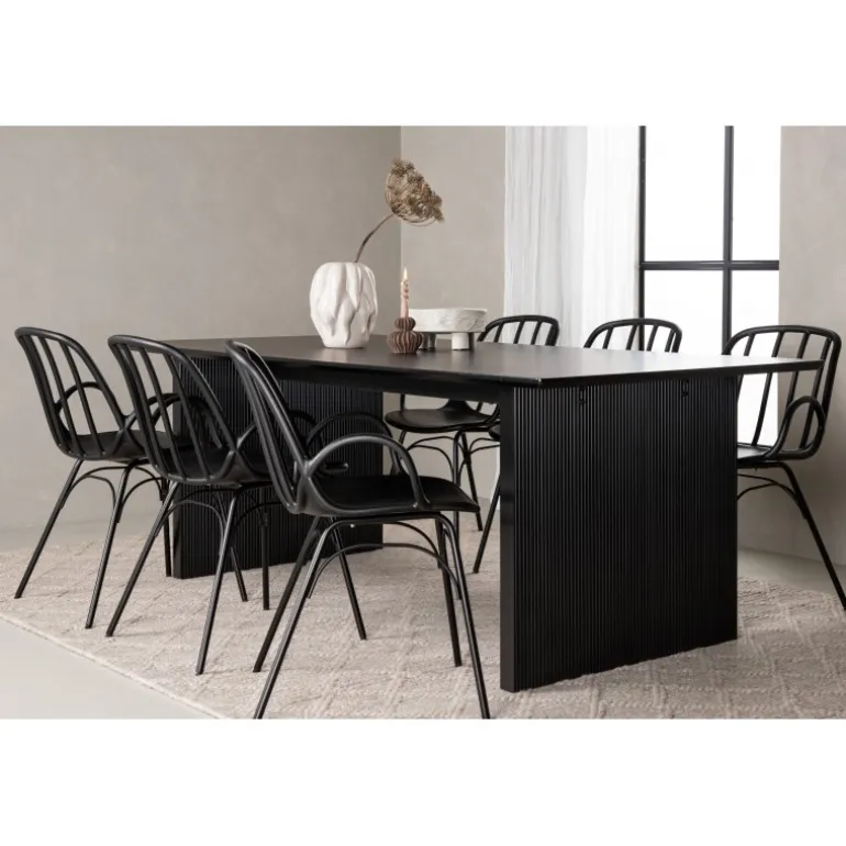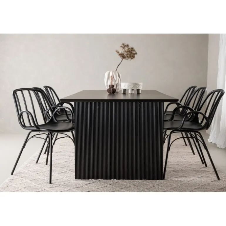 En komplet sort spisebordssæt, der står tidens test! Vail spiseborde har lige nordiske former og er lavet af holdbart sort MDF – lige så stilfuldt som praktisk. Bordpladen er tynd i et rektangulært design og balancerer på to robuste træplader, der udgør understellet. Her i perfekt match med vores moderne spisebordsstole fra Dyron serien. Stolen er lige så stilfuld som praktisk, lavet af sort plast og stål. Stolen har integrerede armlæn og et ribbedesign i den let afrundede ryg. Inviter dine kære til flere sociale øjeblikke fremover!