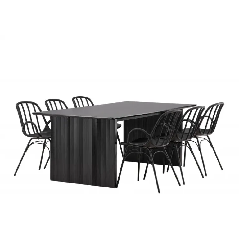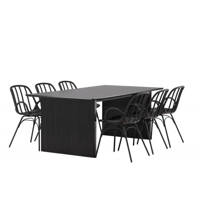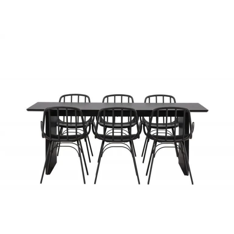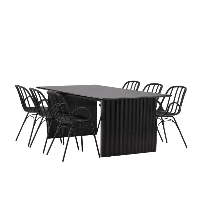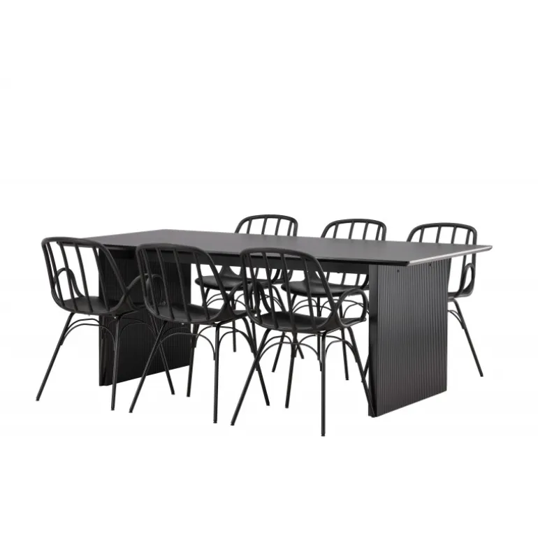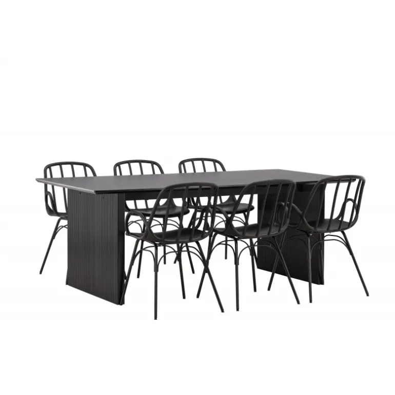 En komplet sort spisebordssæt, der står tidens test! Vail spiseborde har lige nordiske former og er lavet af holdbart sort MDF – lige så stilfuldt som praktisk. Bordpladen er tynd i et rektangulært design og balancerer på to robuste træplader, der udgør understellet. Her i perfekt match med vores moderne spisebordsstole fra Dyron serien. Stolen er lige så stilfuld som praktisk, lavet af sort plast og stål. Stolen har integrerede armlæn og et ribbedesign i den let afrundede ryg. Inviter dine kære til flere sociale øjeblikke fremover!