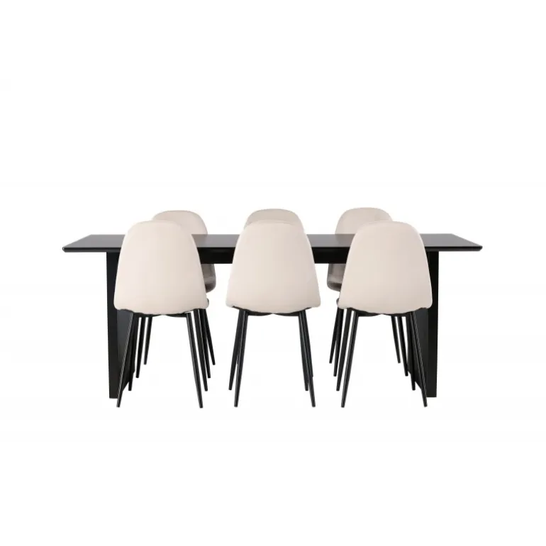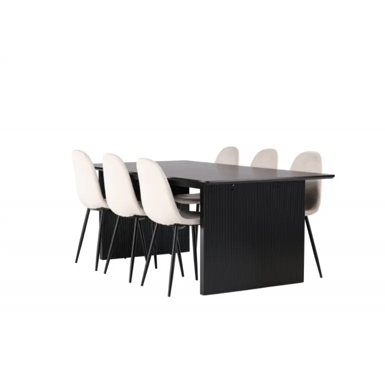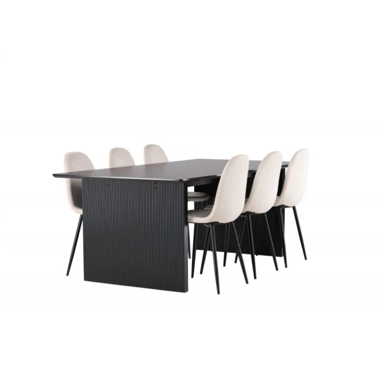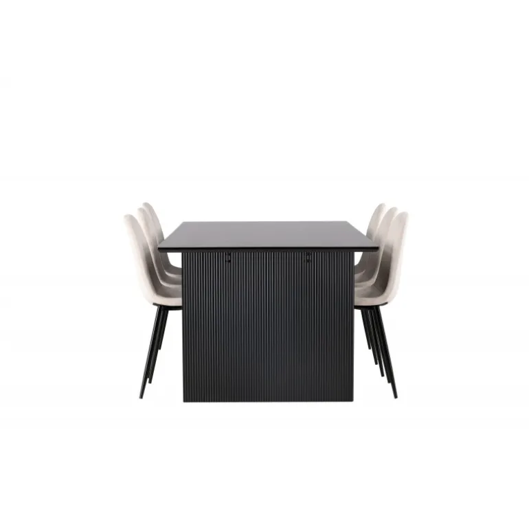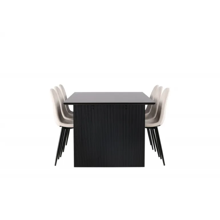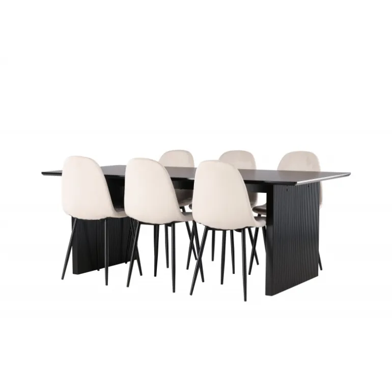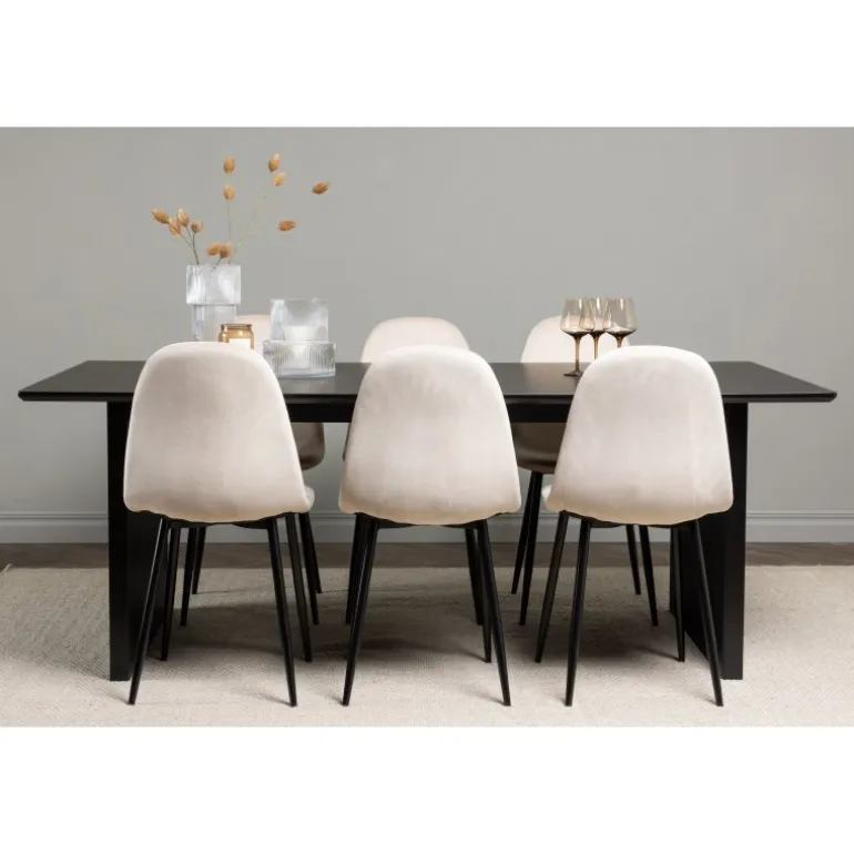 Et elegant og strålende Spisebordssæt! Det rektangulære spisebord Vail har lige nordiske former og er lavet af holdbart MDF i en sodsort farve. Bordpladen er tynd i et rektangulært design og balancerer på to robuste træplader, der udgør basen. Her sammen med vores vidunderlige spisebordsstole Polar. Denne spisebordsstol er fuldt polstret med en let afrundet ryg og sæde i velourstof samt ben i sort pulverlakeret metal. Den skinnende farve skaber en varm og indbydende atmosfære! Bordets dimensioner: 200×100 cm.