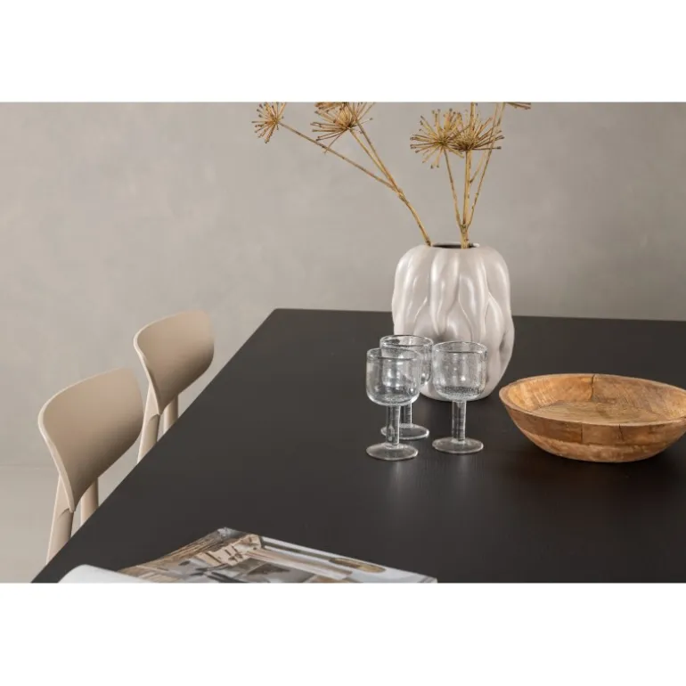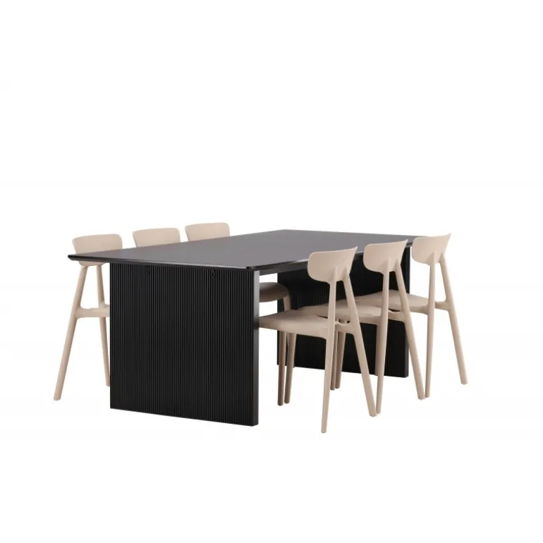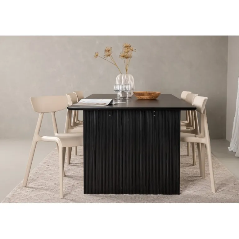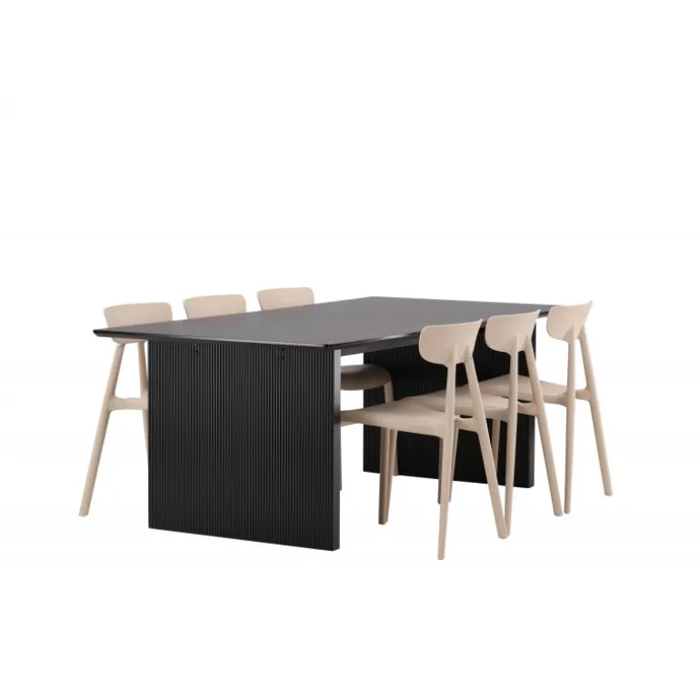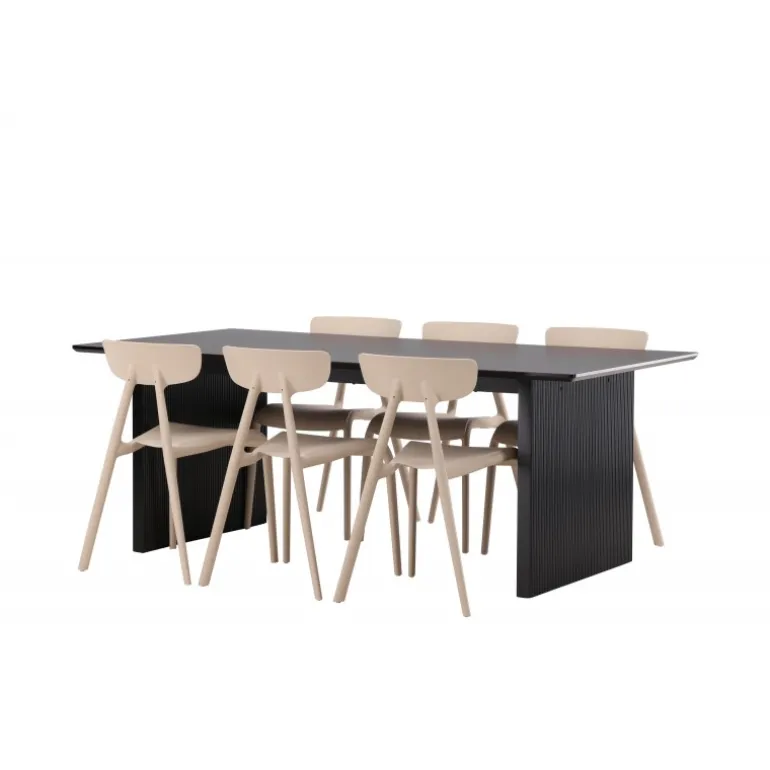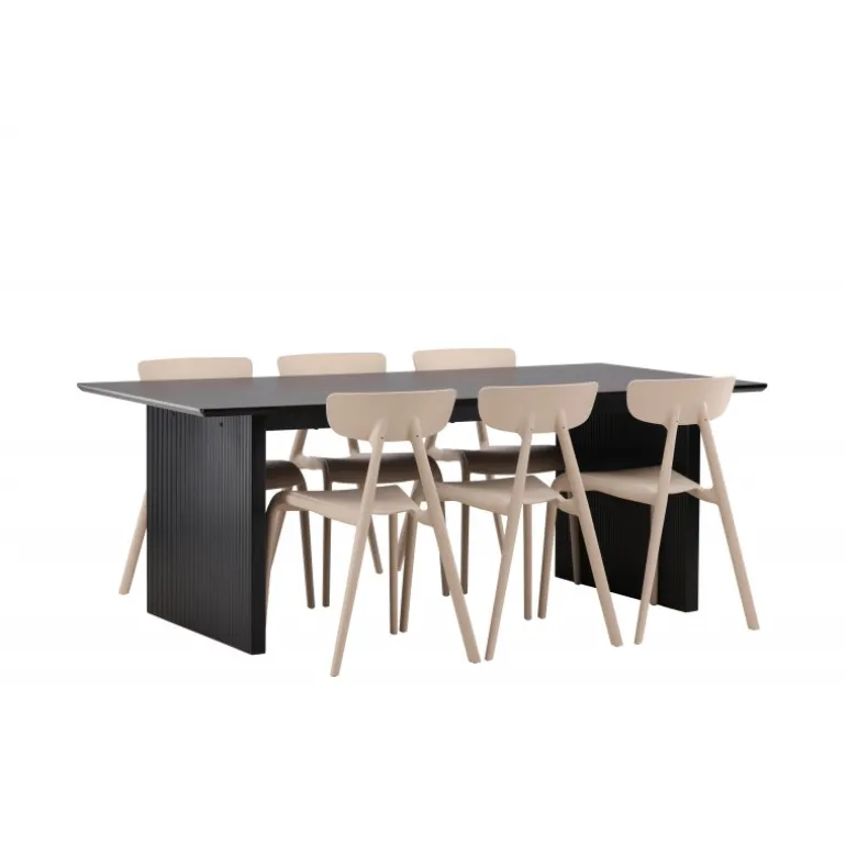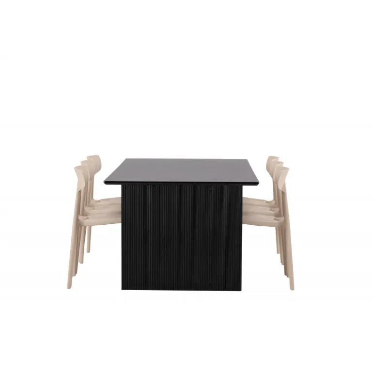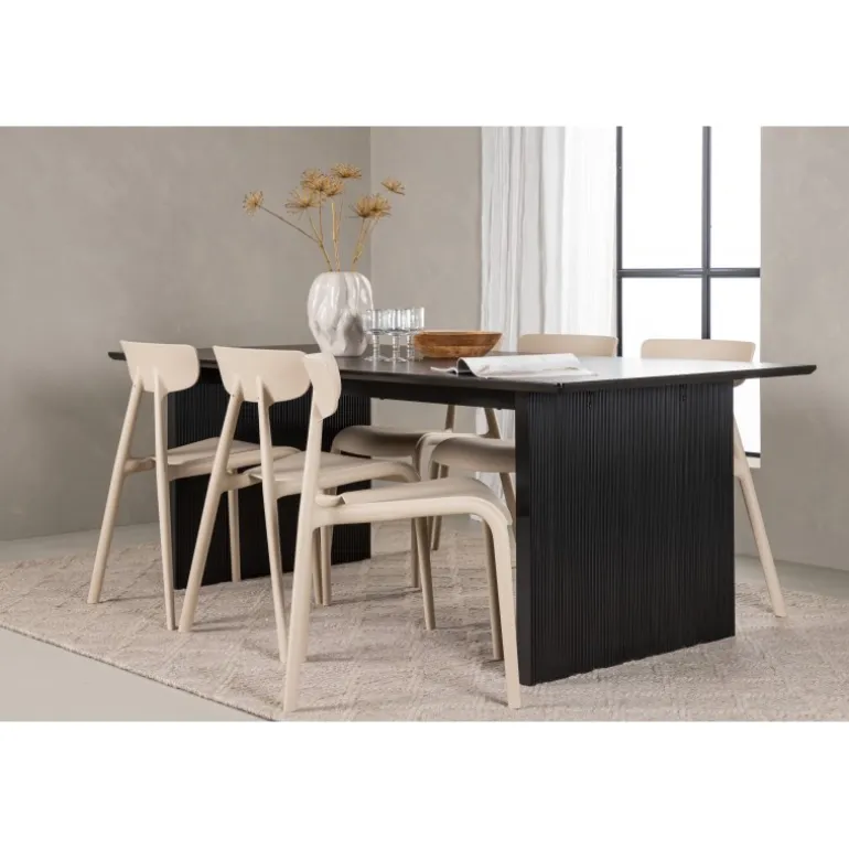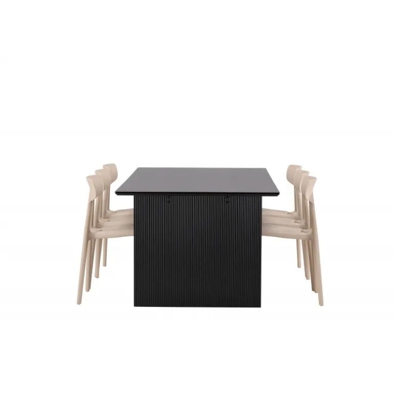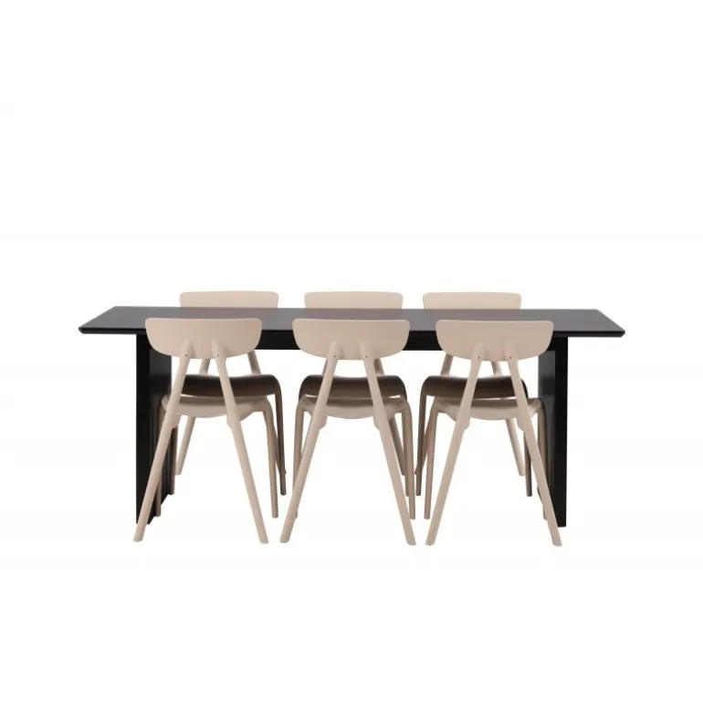 Et stilfuldt match, der står tidens prøve! Vail-spiseborde har lige nordiske former og er lavet af holdbart sort MDF – lige så stilfuldt som praktisk. Bordpladen er tynd i et rektangulært design og balancerer på to robuste træplader, der udgør understellet. Her i fremragende kombination med vores dejlige spisebordsstole fra Ursholmen-serien. Lavet af holdbar plast i en slank beige farve, der er nem at matche med andre møbler. Stolen har en pæn ryg, lidt dybere sæde og let udadgående ben i skandinavisk design. Skab et hyggeligt midtpunkt at samle dine kære ved!