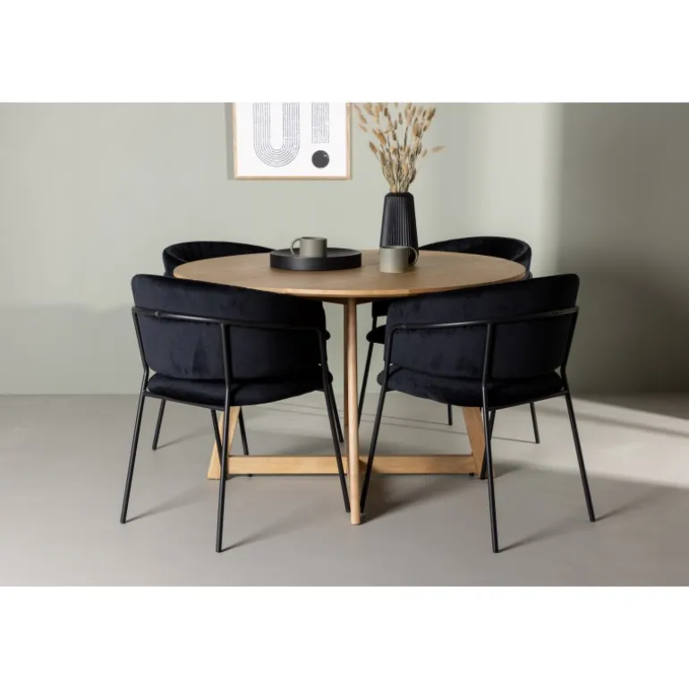 Med en kombination af stil og komfort vil dette spisebordssæt forvandle din stue til en oase af elegance og varme! Vores runde spisebord Yadikon er lavet af højkvalitets gummitræ og har en smuk egetræsfinish, der tilføjer et tidløst look til din indretning. Det runde bordplade betyder, at ingen ender på kanten, hvilket er perfekt til familiemiddage. De let udadbuede bordben mødes smukt under midten af bordet, hvilket giver en stabil og stilfuld konstruktion. Matchende, sorte spisebordsstole fra Selma-serien komplementerer spisebordet på bedste vis. Disse stole har et elegant og fuldt polstret design med en let afrundet ryg og en sædehynde i luksuriøst velourstof. De smukke dekorative syninger tilføjer et ekstra touch af eksklusivitet. Stolebenene er smalle og lavet af sort stål, hvilket giver en moderne kontrast til stolens bløde look. Her får du virkelig en vidunderlig kombination af bæredygtige materialer, skinnende stof, klassiske farver og luksuriøst design, der står tidens test i dit hjem!