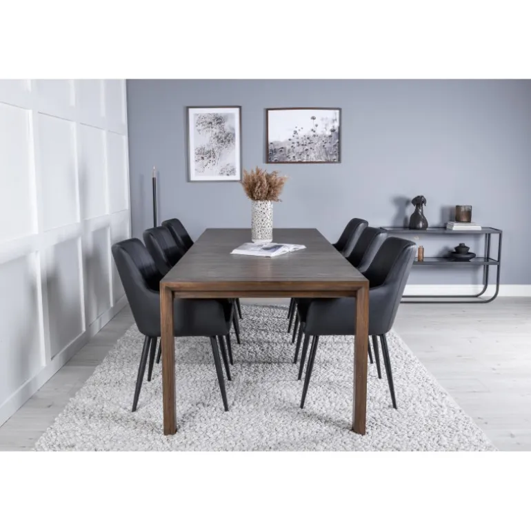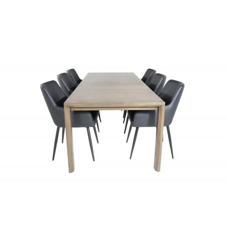 - Stilfuldt design: Moderne look i egetræsfinish kombineret med sorte stole.