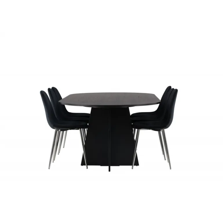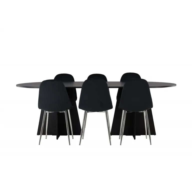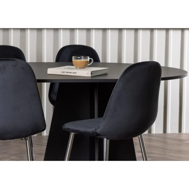 Det skal føles fantastisk at komme hjem! Her har du et luksuriøst spisestuesæt, der udstråler elegance, komfort og ikke mindst en tidløs, slank sort farve! Vores ovale spisebord, Bootcut, lavet af holdbart MDF med finer, har et moderne design, der hurtigt imponerer. Den tynde bordplade skaber en minimalistisk følelse, samtidig med at den tilbyder rigelig plads til dine kære. Den unikke base med to konturerede ben i et åbent design tilføjer et moderne touch til din spisestue. Den kontrastfyldte kombination af den slanke bordplade og den robuste base giver et unikt og sofistikeret udseende, der straks løfter den modebevidste atmosfære i dit hjem. Bordets dimensioner: 115×230 cm. Her i perfekt kombination med vores sorte spisebordsstole fra Polar-serien. Disse elegante stole har et fuldt polstret design, der udstråler en følelse af luksus og komfort. De krombelagte metalben tilføjer et moderne touch og bidrager til stolens stabilitet og holdbarhed. Med deres let buede ryglæn og sæde i sort velourstof tilbyder Polar et slankt og indbydende udseende, der perfekt komplementerer bordet og skaber et indbydende ensemble. Tag plads, inviter din familie og venner, og nyd sammen omkring et hyggeligt spisestuesæt, der sælger sig selv med sit skandinaviske design, høje komfort og tidløse udtryk!