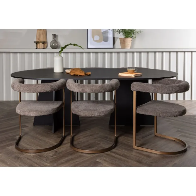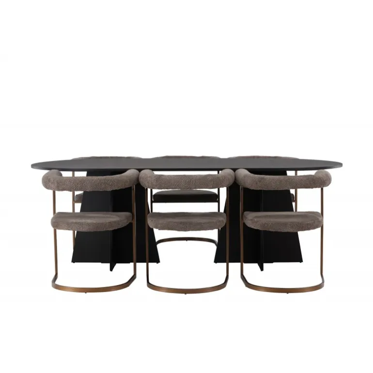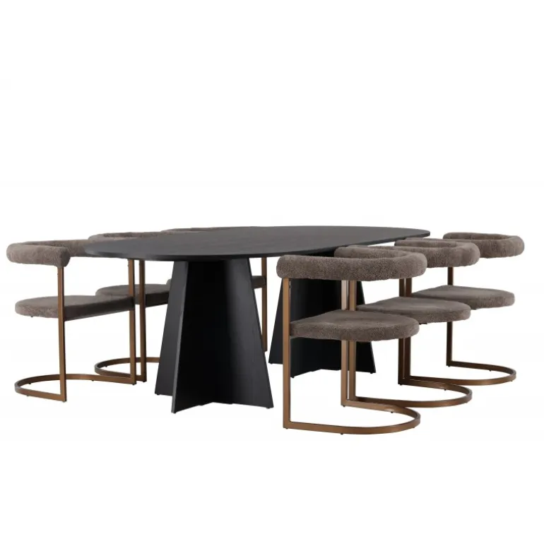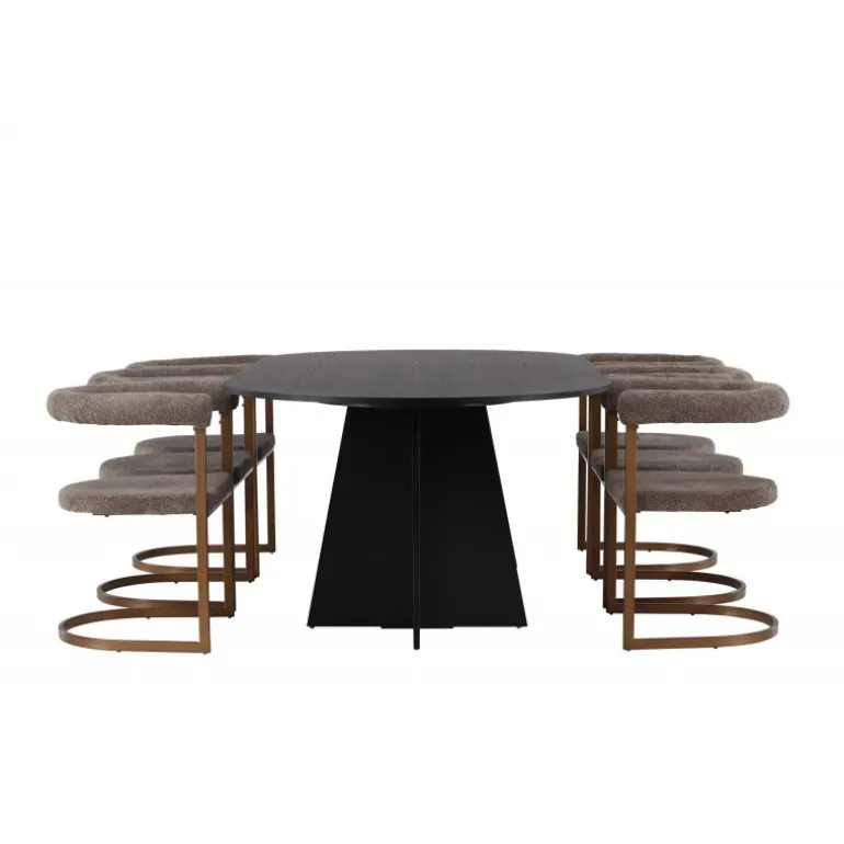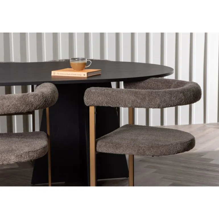 Velkommen hjem til en følelse af luksus og modebevidsthed. Dette skandinaviske spisestuesæt vil utvivlsomt blive en ny favorit i hjertet af dit hjem! Vores ovale spisebord fra Bootcut-serien har en minimalistisk oval bordplade i sort MDF med finér, der skaber en slank kontrast til den markante ramme. To konforme ben i et åbent design giver ikke kun stabilitet, men skaber også et visuelt indtryk af design og præcision. Bordet måler 115×230 cm. Sammen med vores moderne spisebordsstole fra Morning-serien, er dette spisestuesæt komplet. Med deres afrundede ryglæn og polstrede sæder i sort boucléstof, tilbyder disse stole fantastisk komfort. Den minimalistiske sorte stålramme giver en stilfuld kontrast til stoffet og giver stolene et moderne touch. I dette sorte spisestuesæt er hver detalje omhyggeligt udvalgt for at skabe en følelse af eksklusivitet og passe perfekt ind i moderne hjemmemiljøer. Skab et storslået midtpunkt, der føles trendbevidst og holder i længden!