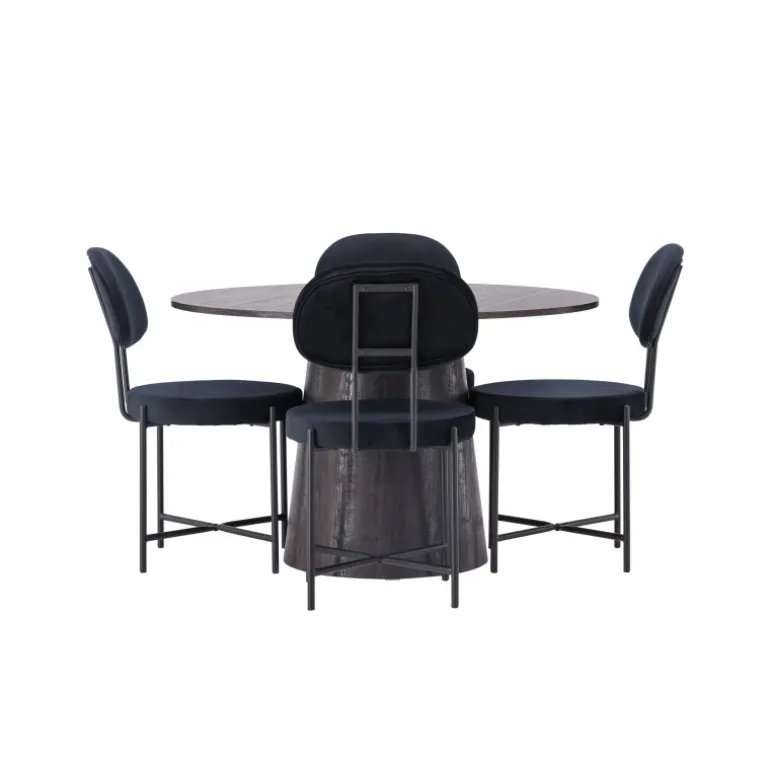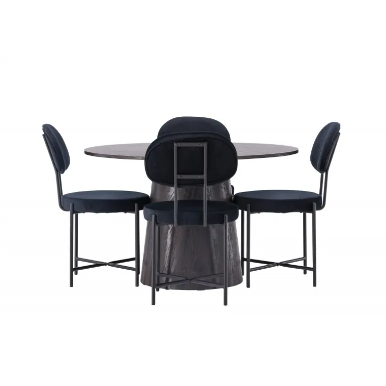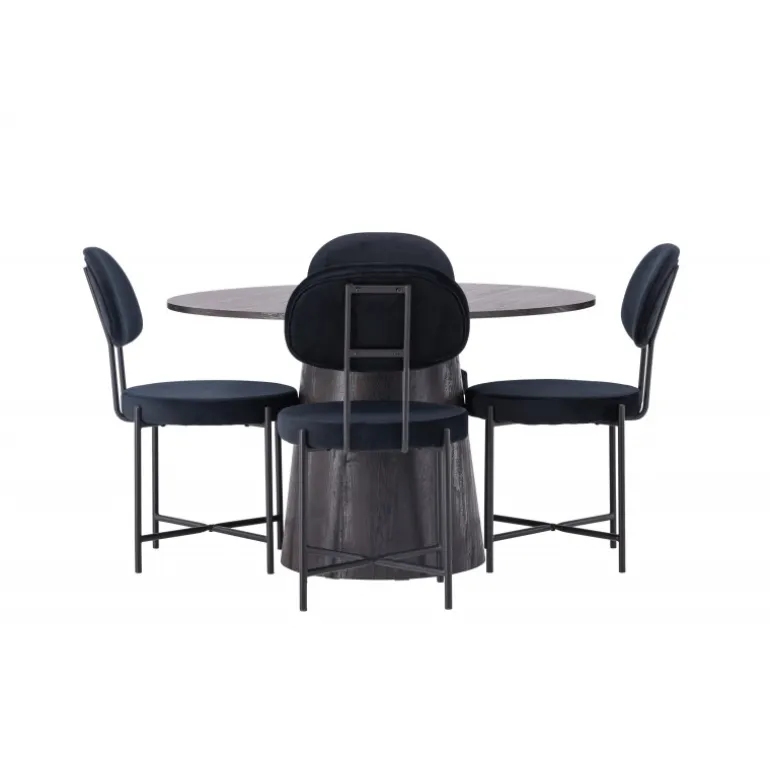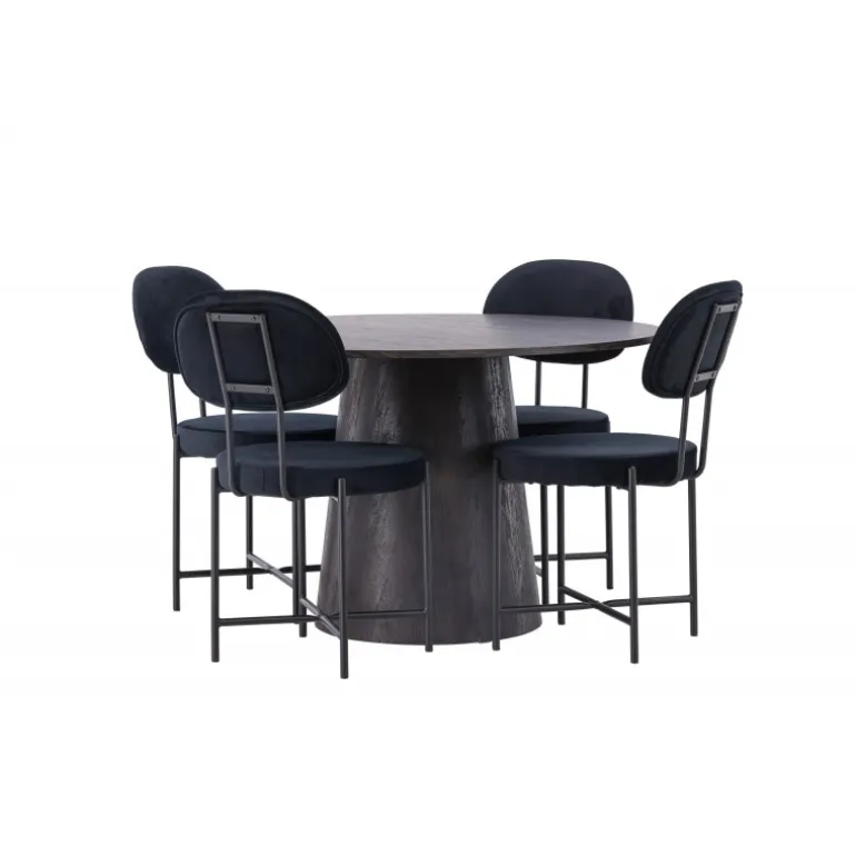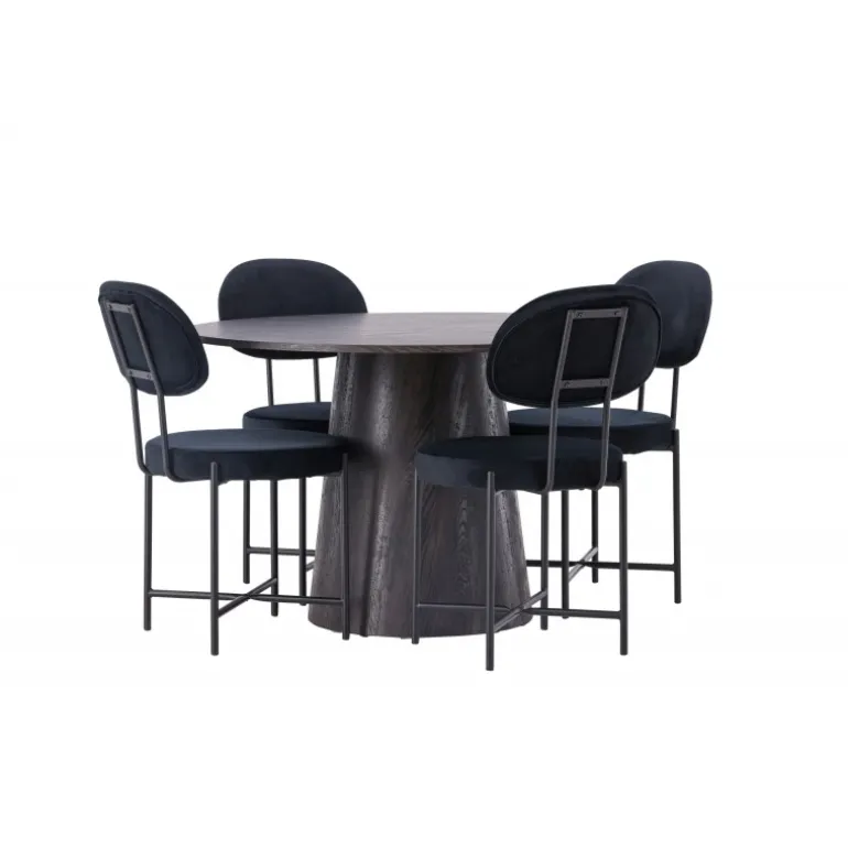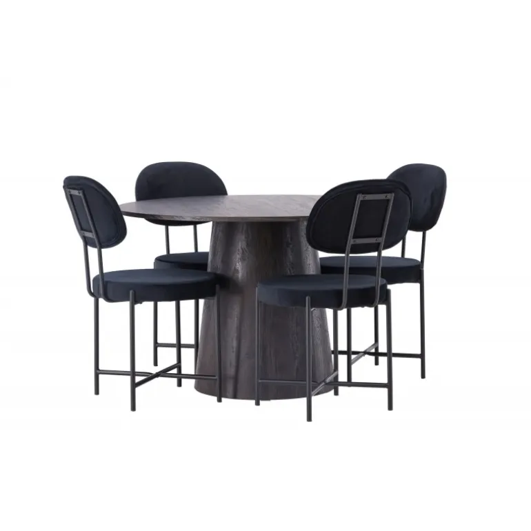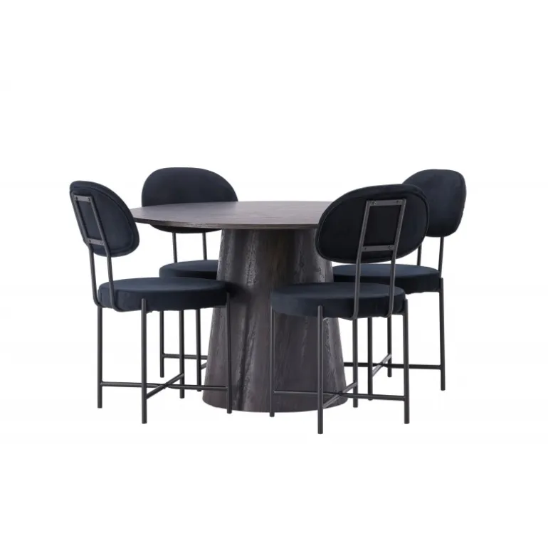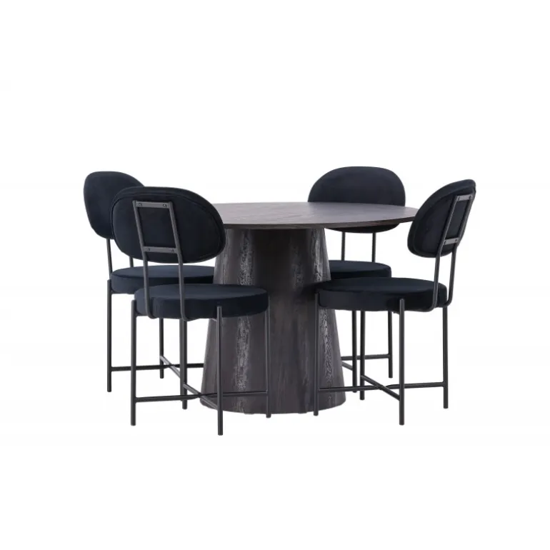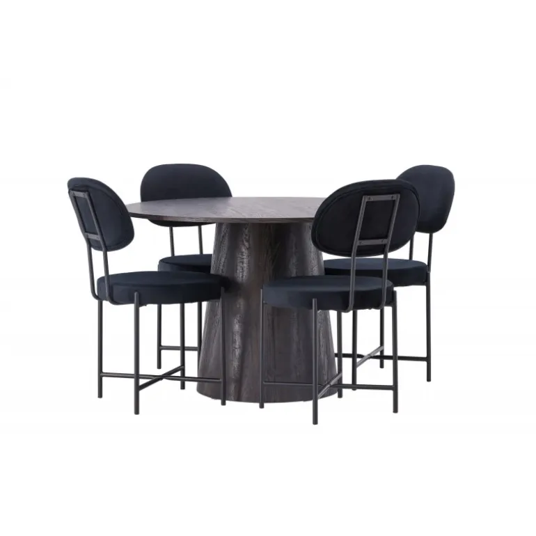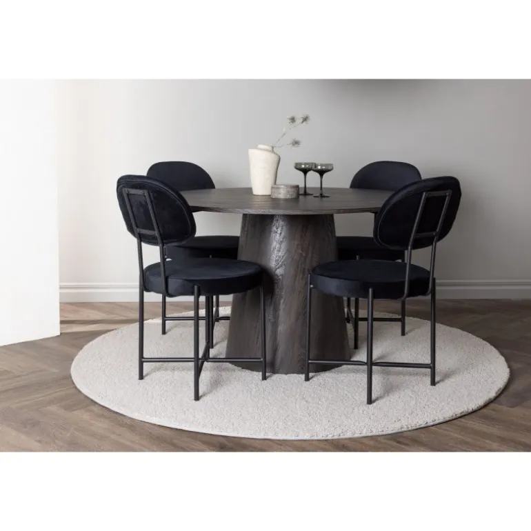 De runde former skaber en indbydende atmosfære! Vores vidunderlige, runde spisebord Lanzo har et overordnet design i brun MDF med en tynd top og en snoet cylindrisk ramme, der er centreret under midten af bordet. Her sammen med vores luksuriøse spisestuestole fra Stella-serien. Stolen har et trendy, skandinavisk design med et rundt sæde og ryglæn i sort velourstof og minimalistiske stoleben i sort stål. Sid behageligt – her ender ingen på kanten! Bordets diameter: 120 cm.