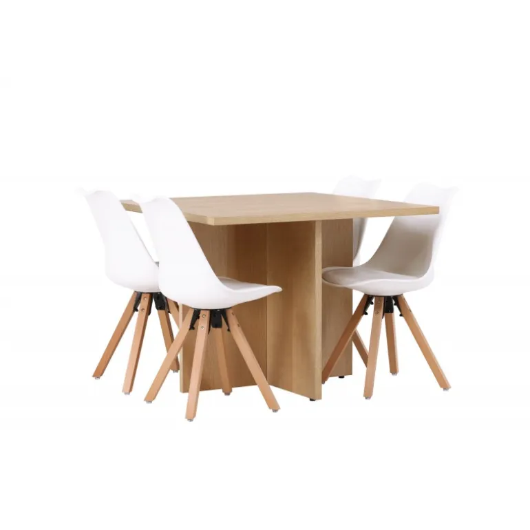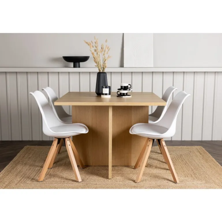 Det skal føles velkomment at komme hjem og blive mødt af et charmerende spisestuesæt, der inviterer til lækre måltider og hyggelige stunder! Vores træfarvede spisebord Leo er lavet af robust MDF i egetræsfiner og har en moderne kvadratisk bordplade. Den krydsede træramme giver bordet en unik og charmerende karakter. Bordets smarte størrelse gør det til en fremragende pasform selv i mindre køkkener, hvilket gør det til en ideel løsning for ethvert hjem. Bordets dimensioner: 100×100 cm. Sammen med det kvadratiske bord Leo, komplementerer vores moderne sorte spisestole fra Zeno-serien det, og inviterer til timers behagelig bespisning. Stolens ryglæn og sæde er lavet af hvid plastik og har indbygget sædehynde, der giver enestående komfort. Med deres træben skaber stolene en naturlig og indbydende atmosfære og matcher perfekt med bordet. Denne kombination af stil, komfort og funktionalitet vil give dig og dine gæster en følelse af velvære ved hvert måltid. Forny din indretningsstil med disse fantastiske møbler og skab mindeværdige øjeblikke ved spisebordet!