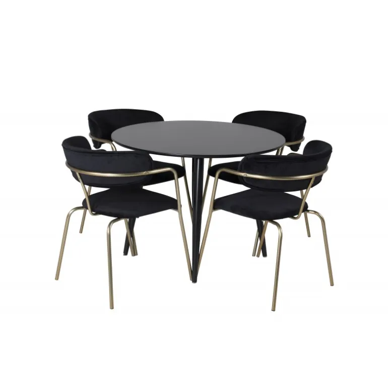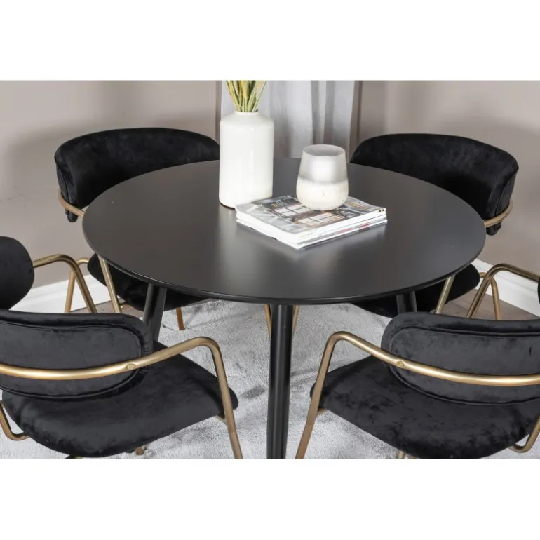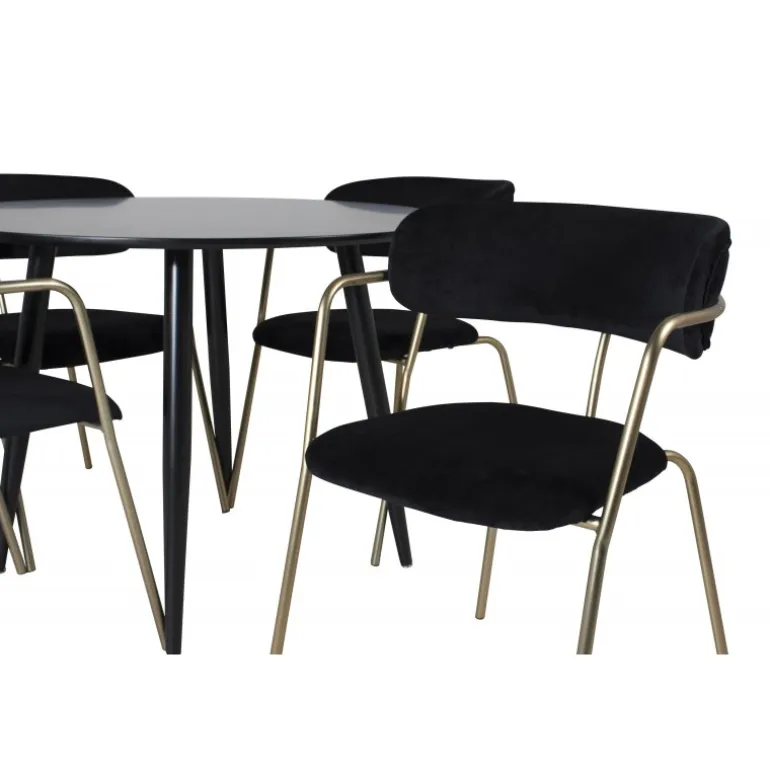 Oplev et trend-sikkert spisestuesæt med sort elegance og moderne gulddetaljer. Vores populære runde spisebord Plaza kombineres festligt med vores velourstole fra Arrow-serien. Med sit stilfulde design passer dette spisestuesæt ind i de fleste husholdninger og egner sig både til hverdagen og festlige lejligheder.