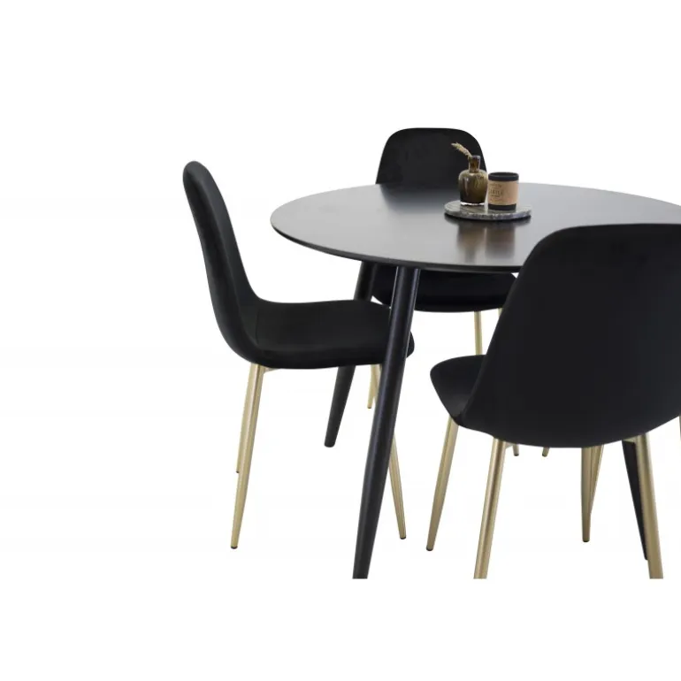 Et lille og smukt, men luksuriøst og trendy spisestuesæt. Plaza spisebordet er kombineret med Polar spisestolene – en perfekt spisestuesæt til en mindre plads! Plaza spisebord er lavet af sort MDF, som giver et elegant udseende, mens Polar stole tilbyder komfort og stil med deres sorte og guld polyester velour stof og stålben. Gør dit hjem mere stilfuldt og funktionelt med dette sæt.