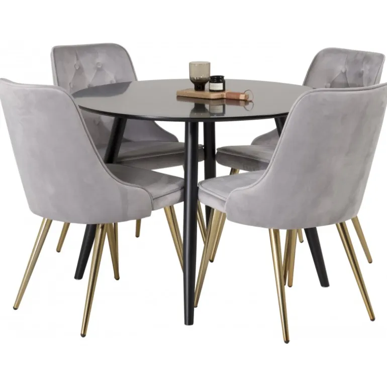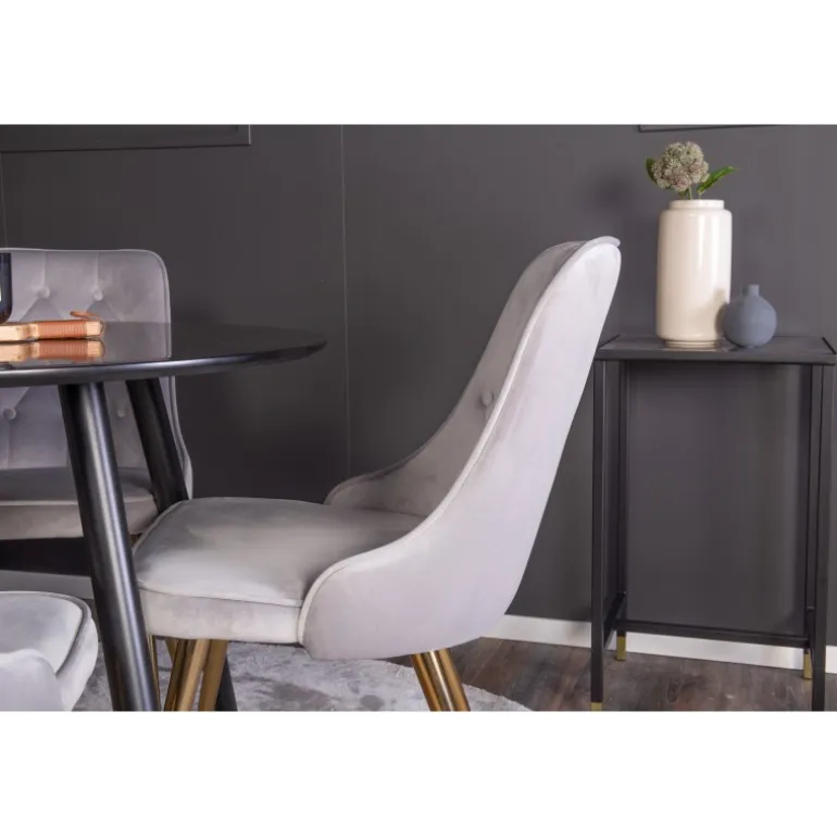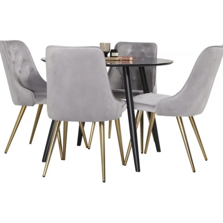 - Moderne design: Stilfuldt sort MDF bord og elegante Velvet Deluxe stole.