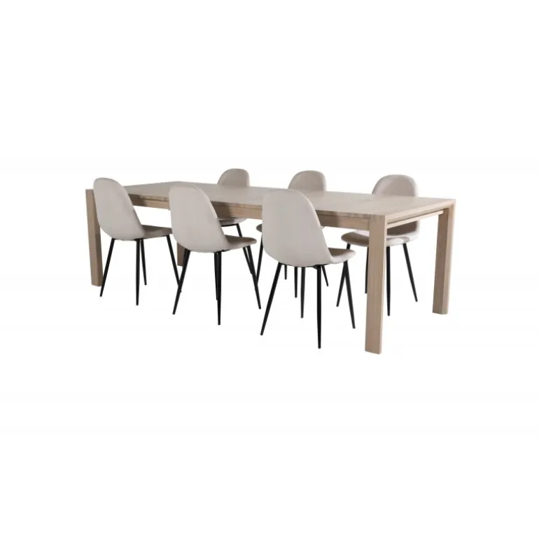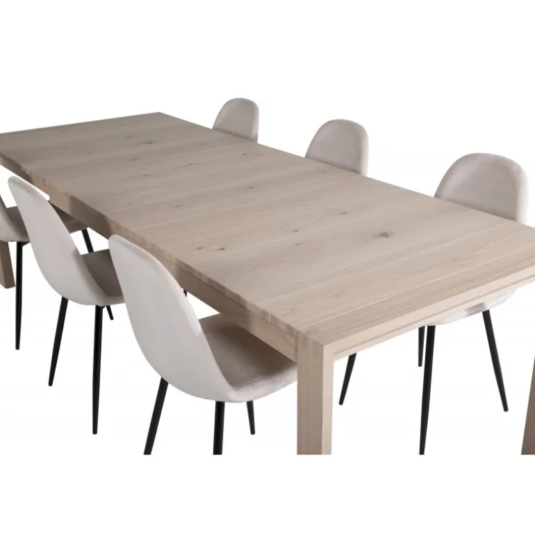 Med det udtrækkelige spisebord fra serien Slider, sammen med de trendy spisebordsstole Polar, får du en Spisebordssæt, der kombinerer klassisk, moderne og hyggelig stil! Dette sæt passer perfekt til både formelle middage og hverdagsmåltider, hvilket gør det til et alsidigt og stilfuldt valg for din spisestue. Bordet kan nemt udvides for at give mere plads, mens stolene tilbyder komfort og elegance med deres bøjede træstruktur og polstrede sæder. Vælg mellem farverne beige, sort, natur og hvid for at matche din indretning.