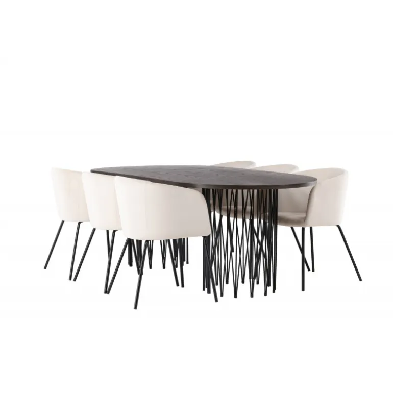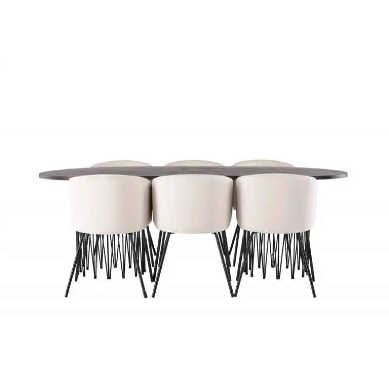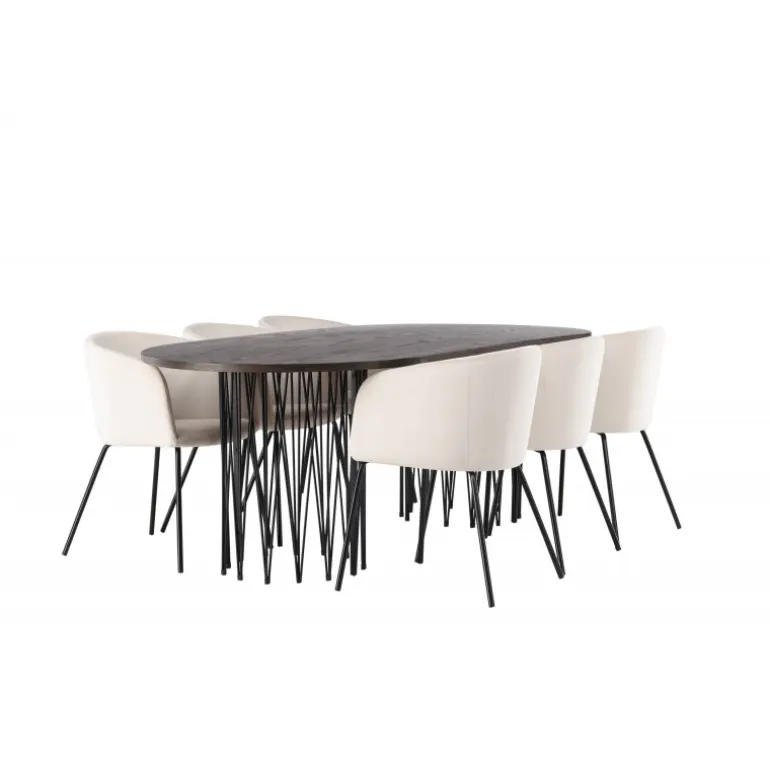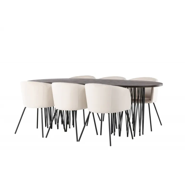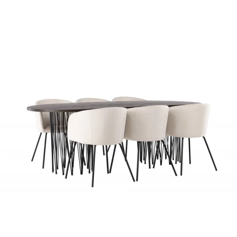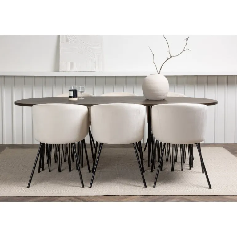 Lys og frisk! Vores ovale spisebord Stone imponerer med sit modebevidste design. Bordet har en smuk brunfarvet bordplade i MDF med finer og to dekorative cylindriske stel i sort metal. Her i vidunderlig kombination med vores komfortable spisestuestole Berit. Stolen har et fuldt polstret design med en let afrundet ryg og sæde i beige velourstof og smalle ben i sort jern. Dette Spisebordssæt er helt i tråd med tidens trends! Bordets dimensioner: 220×100 cm.