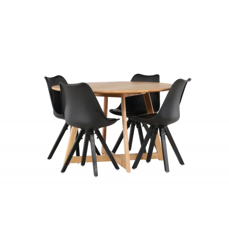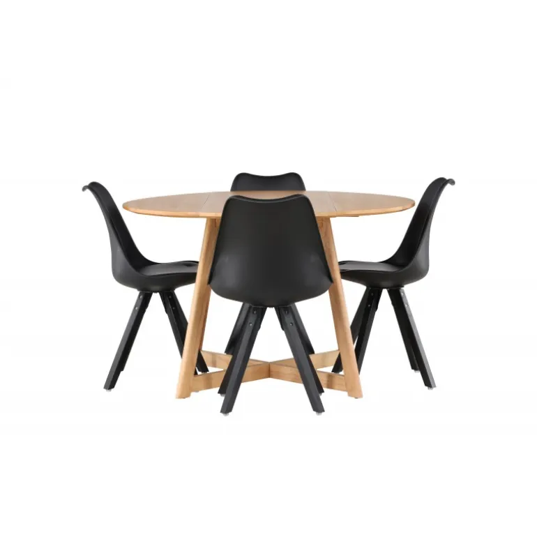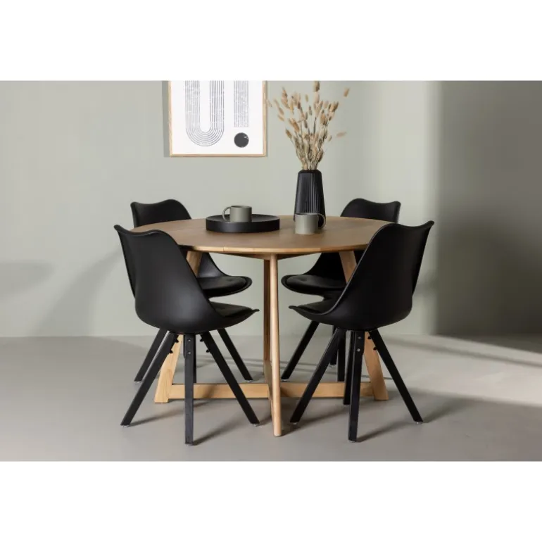Et stilfuldt spisestuesæt, der virkelig fanger øjet, mens det tilbyder en række smarte funktioner skræddersyet til dine behov! Vores smarte spisebord, Yadikon, har sammenklappelige ender, der gør det nemt at justere bordets størrelse. Uanset om du skal have en hyggelig middag for to eller en større sammenkomst med venner og familie, vil Yadikon tilpasse sig for at skabe den perfekte atmosfære. Bordet har elegante, udsvungne ben, der mødes i et kryds på gulvet, hvilket giver en stabil og sikker base. Lavet udelukkende af egetræs-lignende MDF og gummitræ, modstår bordet tidens tand og bidrager til et klassisk look. Her parret med vores dristige Zeno-serie spisestuestole. Denne stol har et indbydende design med en sort plastikryg og sæde samt en indbygget pude, der tilbyder dejlig komfort. Du kan sidde i timevis uden problemer og nyde din spiseoplevelse på bedste vis. Med dette spisestuesæt får du ikke kun en praktisk og smuk Spisebordssæt, men også en følelse af luksus og elegance, der vil gøre hvert måltid hyggeligt og bekvemt. Forkæl dig selv med det bedste og lad denne gruppe blive stjernen i dit hjem!